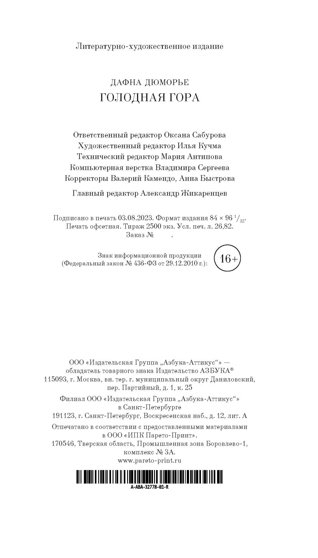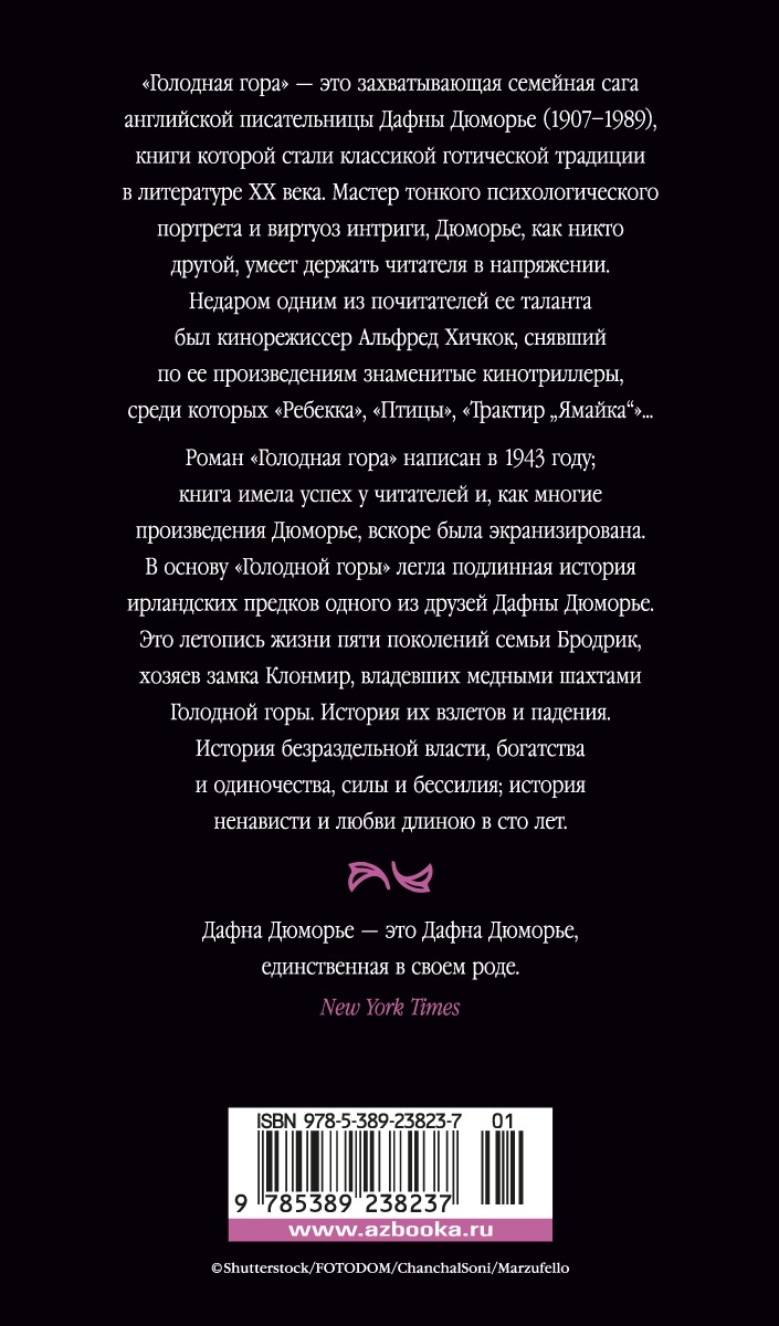 Захватывающая семейная сага английской писательницы Дафны Дюморье (1907-1989), книги которой стали классикой готической традиции в литературе XX века. Мастер тонкого психологического портрета и виртуоз интриги, Дюморье, как никто другой, умеет держать читателя в напряжении. Недаром одним из почитателей ее таланта был кинорежиссер Альфред Хичкок, снявший по ее произведениям знаменитые кинотриллеры, среди которых «Ребекка», «Птицы», «Трактир "Ямайка"»... Роман «Голодная гора» написан в 1943 году; книга имела успех у читателей и, как многие произведения Дюморье, вскоре была экранизирована. В основу «Голодной горы» легла подлинная история ирландских предков одного из друзей Дафны Дюморье. Это летопись жизни пяти поколений семьи Бродрик, хозяев замка Клонмир, владевших медными шахтами Голодной горы. История их взлетов и падения. История безраздельной власти, богатства и одиночества, силы и бессилия; история ненависти и любви длиною в сто лет.| Издательство | Азбука |