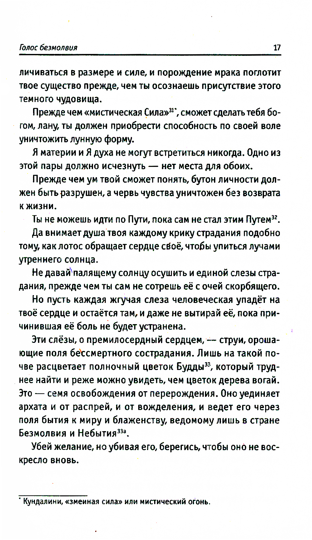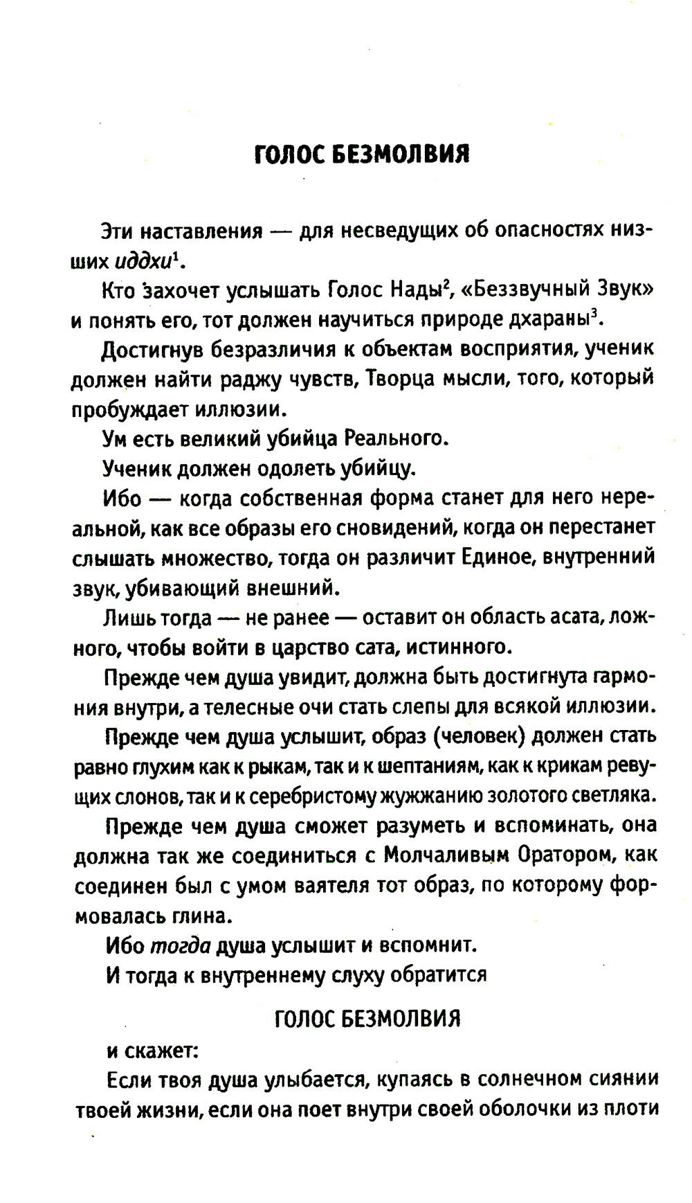 Данная книга является попыткой познакомить читателя с мудростью древней Индии. Предлагаемые отрывки извлечены и записаны учениками из этической книги - «Книга Золотых Правил». До этого эти знания были недоступны никому, кроме небольшого числа посвященных. Они давались для духовного руководства только ученикам (чела) восточной оккультной школы. Среди таких посвященных была Е.П. Блаватская. Если взглянуть на «Голос Безмолвия» как на откровение, дающее непосвященным понятие о том огромном духовном труде и напряжении, через которые проходит ученик, творчески перерабатывая по новым линиям всю свою внутреннюю жизнь, мы найдем в этой маленькой книжке руководство неоценимой важности.| Издательство | Амрита-Русь |