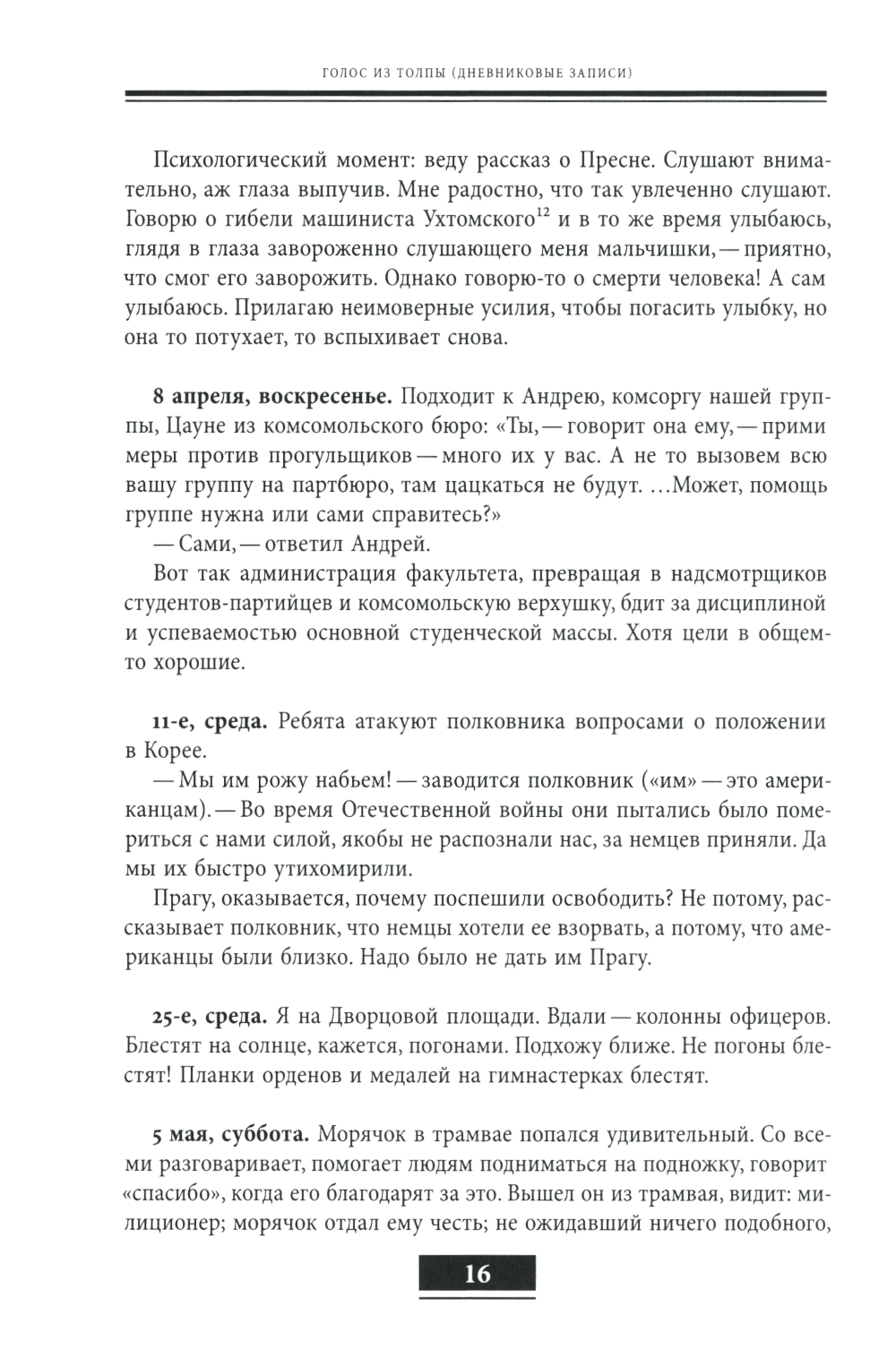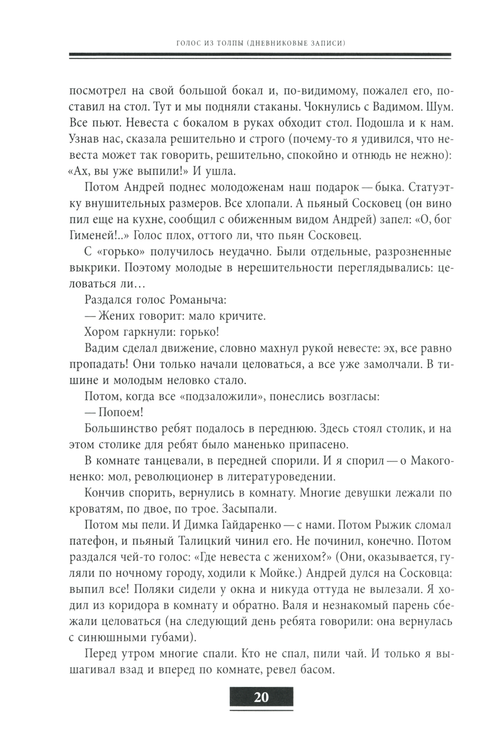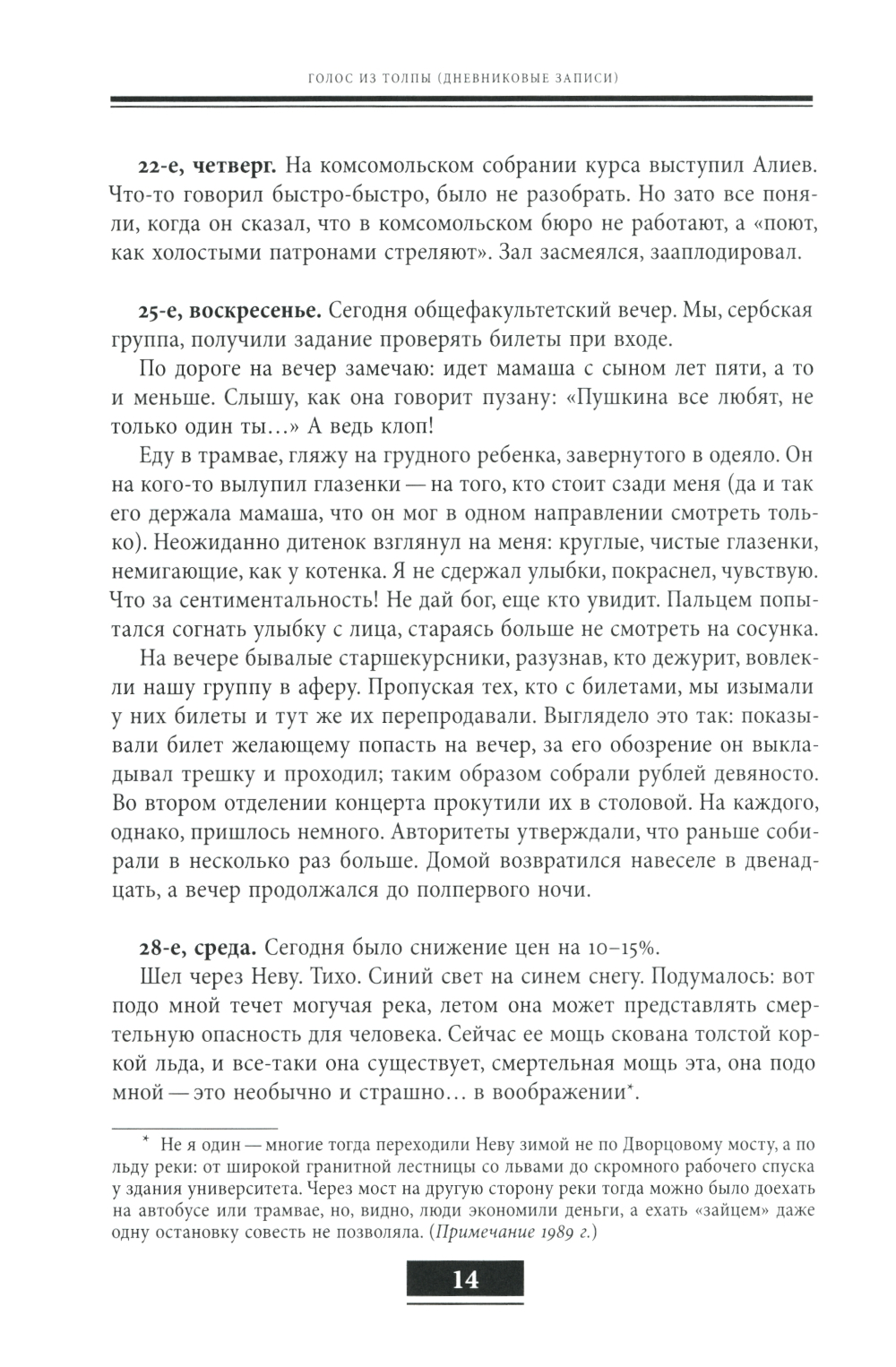 Читателя дневников или воспоминаний известного человека - писателя, политика или ученого - обычно привлекают масштаб личности автора, его мысли и оценки, тонкие наблюдения и остроумные высказывания. Записи, оставленные людьми незнаменитыми, представляют иную ценность: они позволяют понять, каковы были умонастроения, повседневная жизнь и социальные практики широких слоев общества, культура «безмолвствующего большинства». В книге «Голос из толпы» собраны дневники ленинградского журналиста Вячеслава Ивановича Тюева (р. 1931), которые он вел в 1950-1970 е годы. В. И. Тюев учился в ЛГУ на славянском отделении (в югославской группе), однако к концу его обучения отношения Советского Союза с Югославией испортились. Знание сербского языка выпускнику не пригодилось, и он начал работать в многотиражных газетах Ленинграда - сначала заводской, потом милицейской, дойдя до звания подполковника. В книге Тюева запечатлен повседневный советский быт, описана неприглядная жизнь колхозов Ленобласти (в печать такие наблюдения проникнуть не могли), зафиксировано отношение «простых» людей к власти (в частности, Тюев записывал ходившие в обществе анекдоты о Хрущеве). Наконец, в его дневниках сохранены сведения о ленинградских преподавателях и студентах, ставших потом известными литературоведами и журналистами.