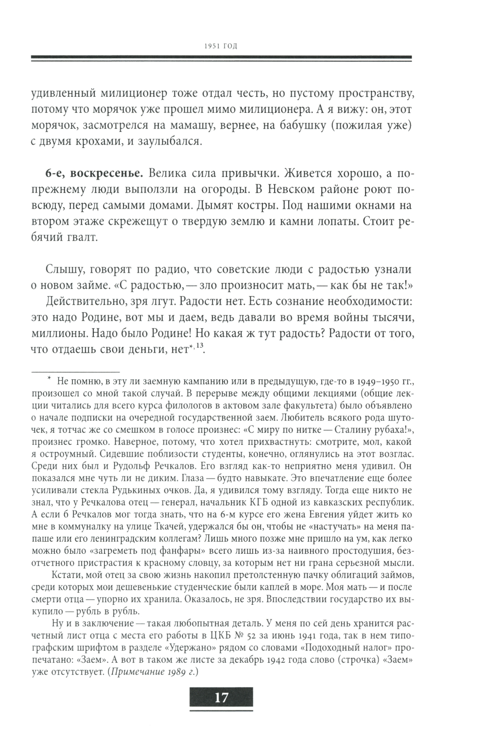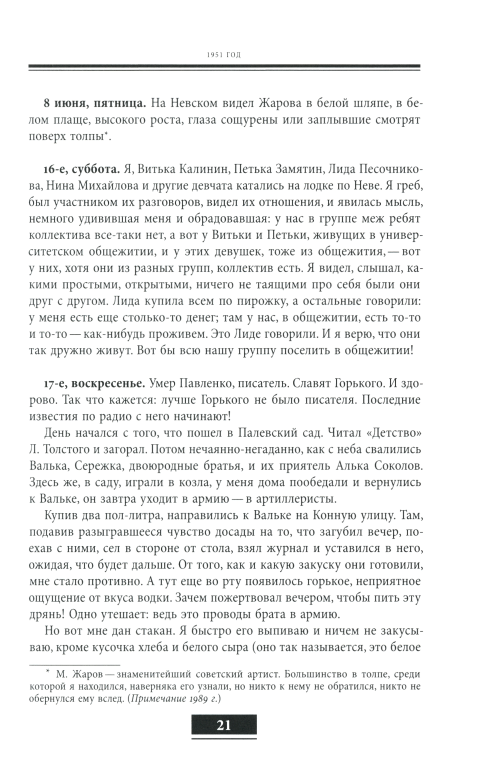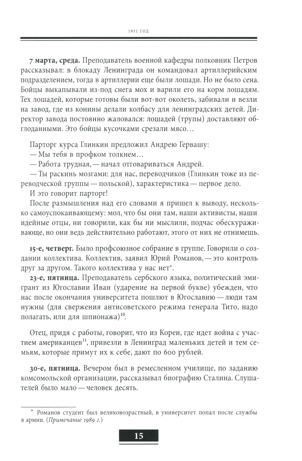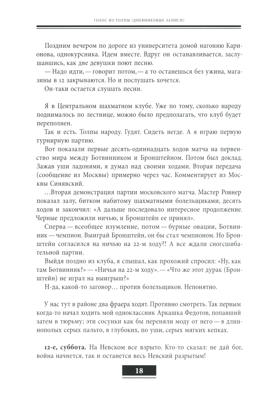 Читателя дневников или воспоминаний известного человека - писателя, политика или ученого - обычно привлекают масштаб личности автора, его мысли и оценки, тонкие наблюдения и остроумные высказывания. Записи, оставленные людьми незнаменитыми, представляют иную ценность: они позволяют понять, каковы были умонастроения, повседневная жизнь и социальные практики широких слоев общества, культура «безмолвствующего большинства». В книге «Голос из толпы» собраны дневники ленинградского журналиста Вячеслава Ивановича Тюева (р. 1931), которые он вел в 1950-1970 е годы. В. И. Тюев учился в ЛГУ на славянском отделении (в югославской группе), однако к концу его обучения отношения Советского Союза с Югославией испортились. Знание сербского языка выпускнику не пригодилось, и он начал работать в многотиражных газетах Ленинграда - сначала заводской, потом милицейской, дойдя до звания подполковника. В книге Тюева запечатлен повседневный советский быт, описана неприглядная жизнь колхозов Ленобласти (в печать такие наблюдения проникнуть не могли), зафиксировано отношение «простых» людей к власти (в частности, Тюев записывал ходившие в обществе анекдоты о Хрущеве). Наконец, в его дневниках сохранены сведения о ленинградских преподавателях и студентах, ставших потом известными литературоведами и журналистами.
