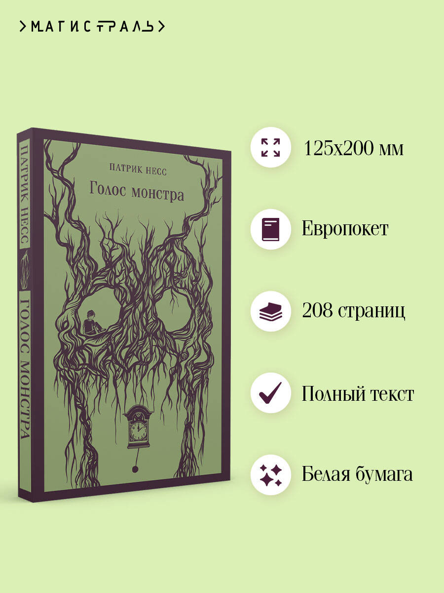 «Голос монстра» - самый знаменитый роман американского писателя Патрика Несса. Мировой бестселлер. Книга переведена на 30 языков мира. Более 170 изданий и переизданий. Экранизация в 2016 году. Монстр появился сразу после полуночи. Конор не спал. Его разбудил кошмар. С тех пор как тяжело заболела мать, он видел один и тот же кошмарный сон. Этот монстр, похожий на тисовое дерево, редко является людям. Он пришел к Конору, чтобы рассказать три истории: о любви, надежде и утрате. Монстр будет приходить каждую ночь, и когда закончит рассказ, Конору придется поведать ему свою историю. О том, чего он боится больше всего на свете. Патрик Несс - знаменитый американский писатель и журналист, автор десяти романов, среди которых бестселлеры «Поступь хаоса», «Больше, чем это» и «Голос монстра», а также спин-оффа «Class» к популярному телесериалу «Доктор кто». Дважды лауреат медали Карнеги за выдающийся вклад в литературу.| Издательство | ООО "Издательство "Эксмо" |