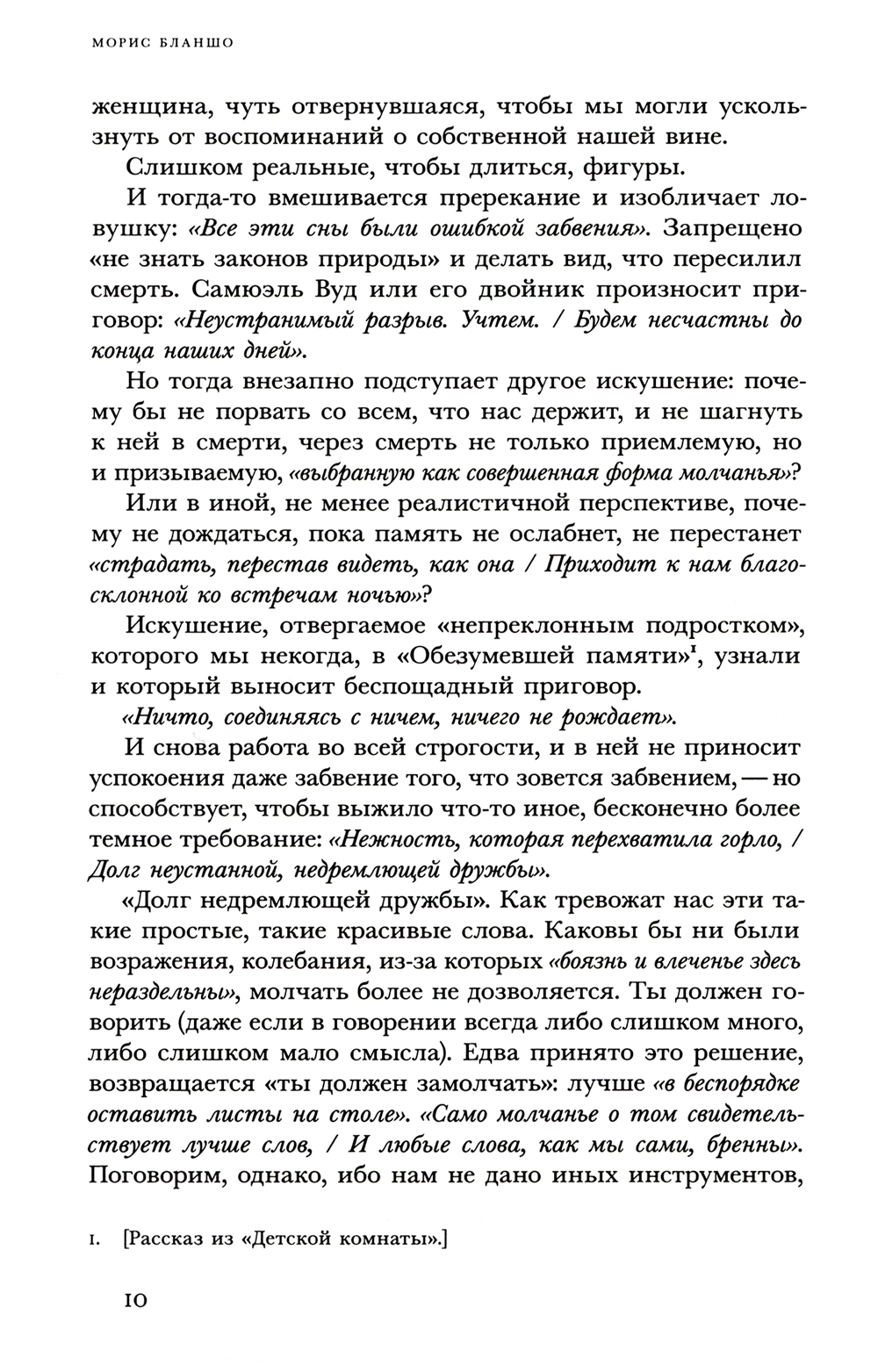 Морис Бланшо (1907-2003) - один из самых влиятельных и оригинальных мыслителей XX века, оставивший после себя богатое художественное и философское наследие. В свою последнюю прижизненную книгу Бланшо включил четыре работы, охватывающие четыре десятилетия его творческого пути и посвященные писателям и мыслителям, с которыми его связывали тесные узы личной и интеллектуальной дружбы: Луи-Рене Дефоре, Рене Шару, Паулю Целану и Мишелю Фуко. В настоящее издание в качестве дополнения вошли также оммажи Бланшо другим его единомышленникам - Морису Мерло-Понти, Жаку Деррида, Сэмюэлю Беккету и Денису Масколо; кроме того, в книгу включена одна из важнейших ранних работ Фуко, вписывающая творчество Бланшо в широкий историко-философский контекст.