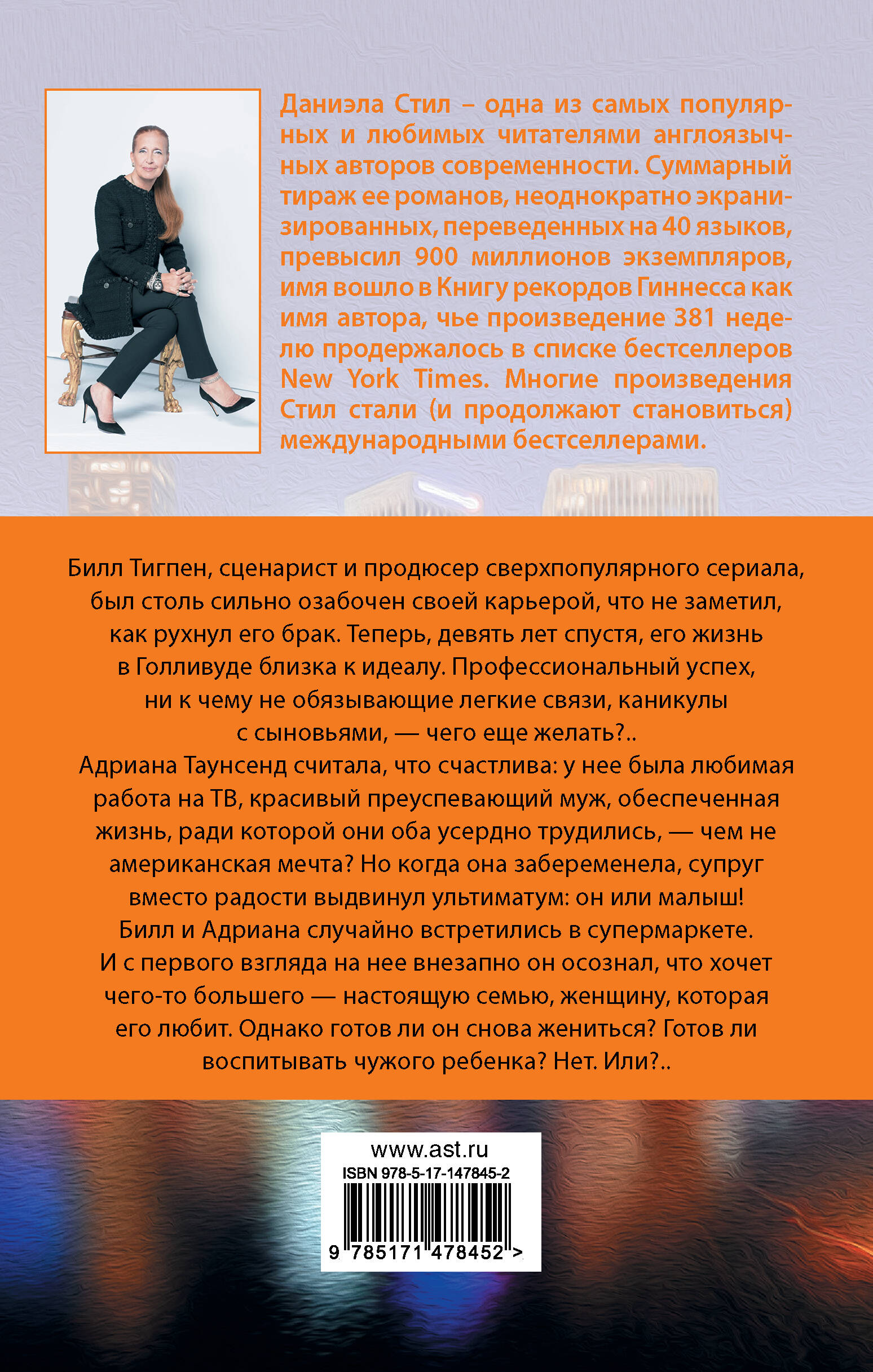 Билл Тигпен, сценарист и продюсер сверхпопулярного сериала, был столь сильно озабочен своей карьерой, что не заметил, как рухнул его брак. Теперь, девять лет спустя, его жизнь в Голливуде близка к идеалу. Профессиональный успех, ни к чему не обязывающие легкие связи, каникулы с сыновьями, - чего еще желать?.. Адриана Таунсенд считала, что счастлива: у нее была любимая работа на ТВ, красивый преуспевающий муж, обеспеченная жизнь, ради которой они оба усердно трудились, - чем не американская мечта? Но когда она забеременела супруг вместо радости, выдвинул ультиматум: он или малыш! Билл и Адриана случайно встретились в супермаркете. И с первого взгляда на нее внезапно он осознал, что хочет чего-то большего, - настоящую семью, женщину, которая его любит. Однако готов ли он снова жениться? Готов ли воспитывать чужого ребенка? Нет. Или?..| Издательство | ИЗДАТЕЛЬСТВО "АСТ" |