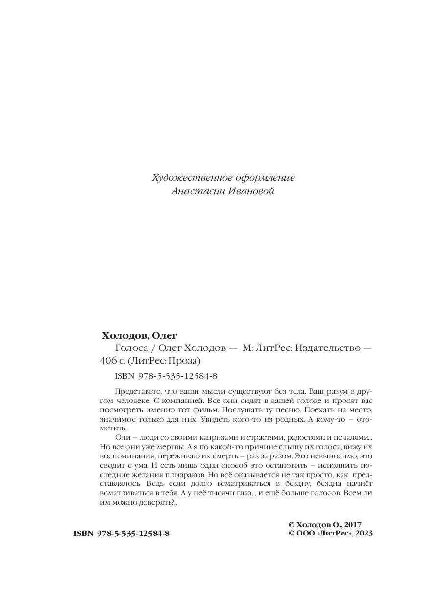 Представьте, что ваши мысли существуют без тела. Ваш разум в другом человеке. С компанией. Все они сидят в вашей голове и просят вас посмотреть именно тот фильм. Послушать ту песню. Поехать на место, значимое только для них. Увидеть кого-то из родных. А кому-то - отомстить. Они - люди со своими капризами и страстями, радостями и печалями… Но все они уже мертвы. А я по какой-то причине слышу их голоса, вижу их воспоминания, переживаю их смерть - раз за разом. Это невыносимо, это сводит с ума. И есть лишь один способ это остановить - исполнить последние желания призраков. Но всё оказывается не так просто, как представлялось. Ведь если долго всматриваться в бездну, бездна начнёт всматриваться в тебя. А у неё тысячи глаз… и ещё больше голосов. Всем ли им можно доверять?..| Издательство | Т8 RUGRAM |