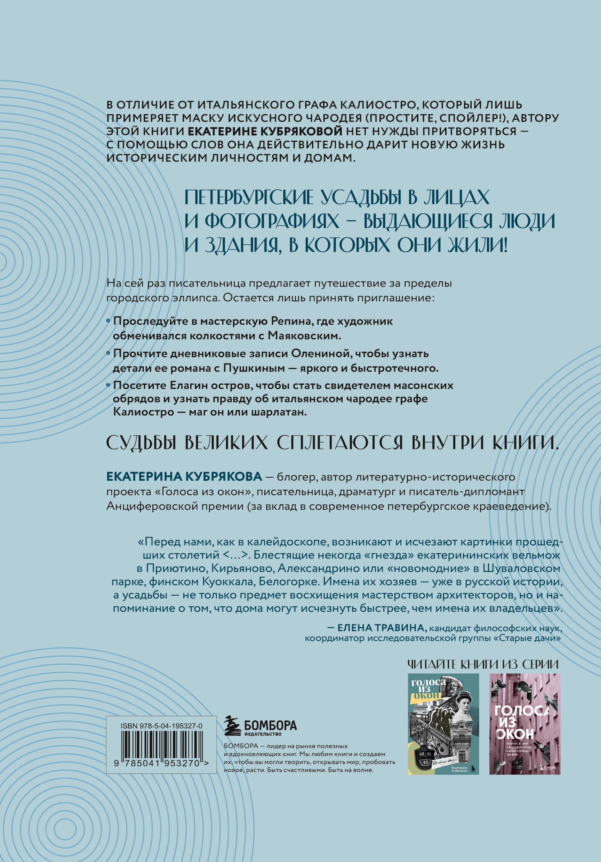 Серия Екатерины Кубряковой «Голоса из окон» уже стала эталоном книг о Петербурге. На сей раз автор, удостоенная Анциферовской премии за вклад в краеведение Петербурга, предлагает путешествие за пределы городского эллипса. Остается лишь принять приглашение. - Проследуйте в мастерскую Репина, где художник обменивался колкостями с Маяковским. - Прочтите дневниковые записи Олениной, чтобы узнать детали ее романа с Пушкиным - яркого и быстротечного. - Посетите Елагин остров, чтобы стать свидетелем масонских обрядов и узнать правду об итальянском чародее графе Калиостро - маг он или шарлатан? Новое издание еще глубже раскрывает судьбы великих. Но не только с помощью слов: гравюры, музейные портреты и фотографии архитектурных шедевров дополняют картину ушедшей имперской эпохи.| Издательство | ООО "Издательство "Эксмо" |