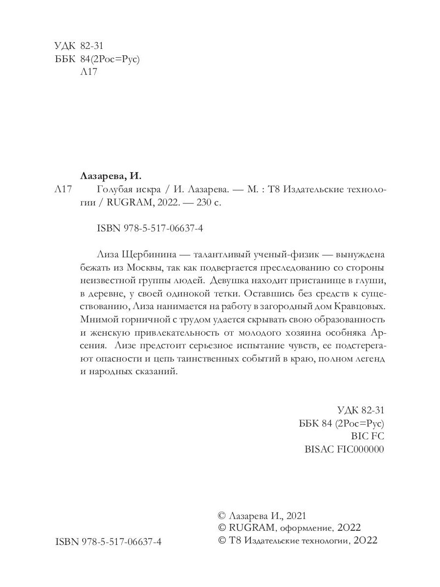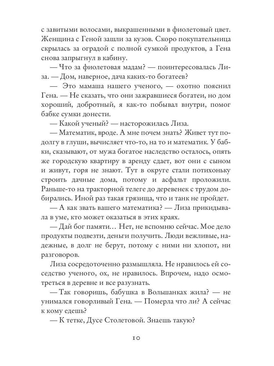 Лиза Щербинина - талантливый ученый-физик - вынуждена бежать из Москвы, так как подвергается преследованию со стороны неизвестной группы людей. Девушка находит пристанище в глуши, в деревне, у своей одинокой тетки. Оставшись без средств к существованию, Лиза нанимается на работу в загородный дом Кравцовых. Мнимой горничной с трудом удается скрывать свою образованность и женскую привлекательность от молодого хозяина особняка Арсения. Лизе предстоит серьезное испытание чувств, ее подстерегают опасности и цепь таинственных событий в краю, полном легенд и народных сказаний.| Издательство | Т8 RUGRAM |