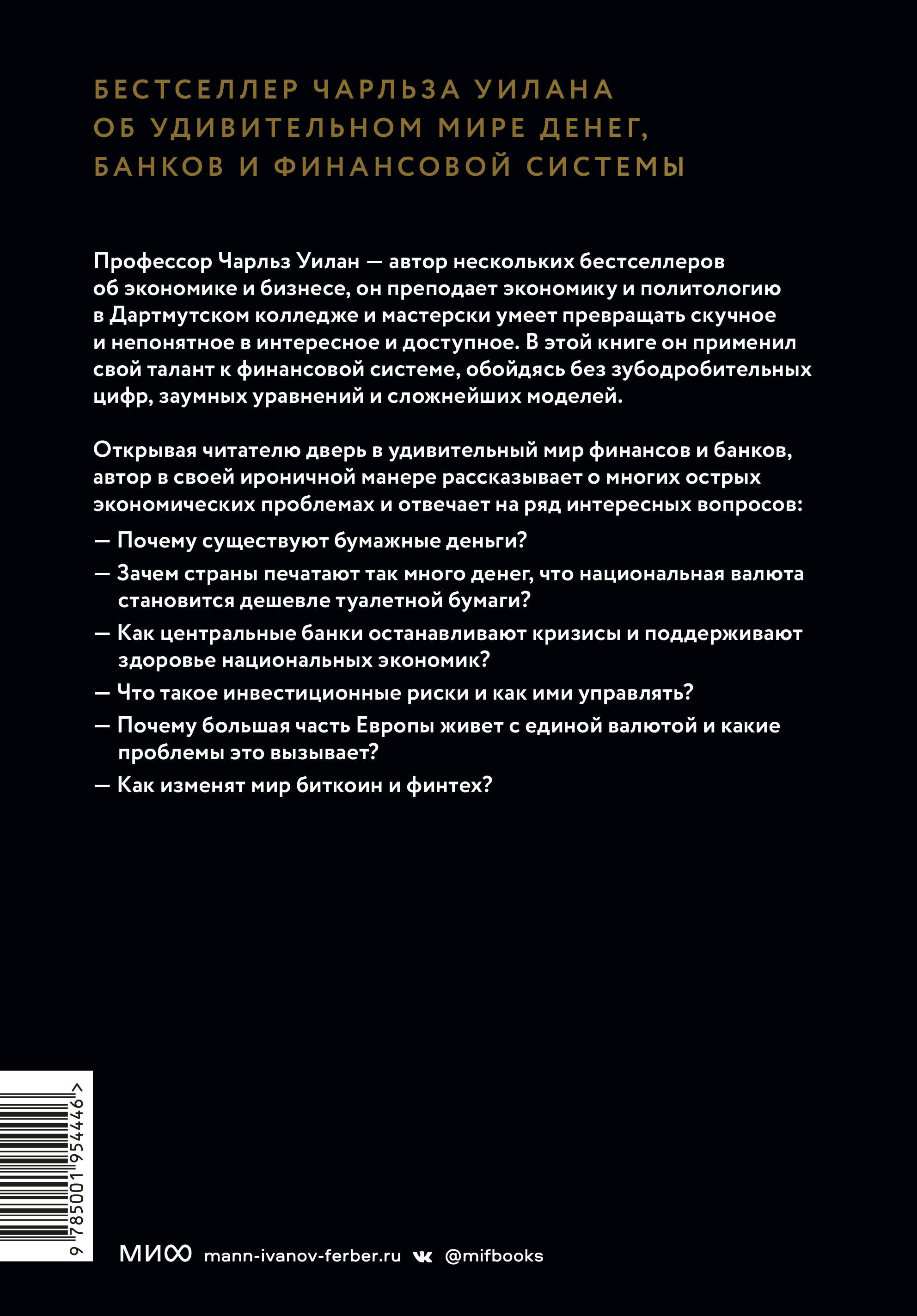 Бестселлер Чарльза Уилана об удивительном мире денег, банков и финансовой системы. Профессор Чарльз Уилан - автор нескольких бестселлеров об экономике и бизнесе, он преподает экономику и политологию в Дартмутском колледже и мастерски умеет превращать скучное и непонятное в интересное и доступное. В этой книге он применил свой талант к финансовой системе, обойдясь без зубодробительных цифр, заумных уравнений и сложнейших моделей. Открывая читателю дверь в удивительный мир финансов и банков, автор в своей ироничной манере рассказывает о многих острых экономических проблемах и отвечает на ряд интересных вопросов: - Почему существуют бумажные деньги? - Зачем страны печатают так много денег, что национальная валюта становится дешевле туалетной бумаги? - Как центральные банки останавливают кризисы и поддерживают здоровье национальных экономик? - Что такое инвестиционные риски и как ими управлять? - Почему большая часть Европы живет с единой валютой и какие проблемы это вызывает? - Как изменят мир биткоин и финтех? Для кого эта книга: Для широкого круга читателей, интересующихся экономикой.
