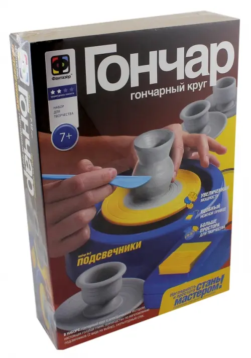 В наборе: гончарный круг с электрическим мотором; настоящая голубая глина; скульптурный стэк; руководство по изготовлению двух подсвечников