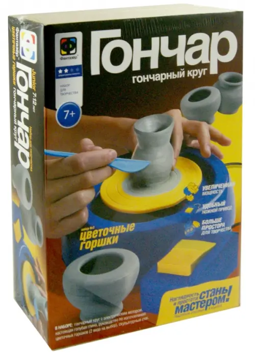 В наборе: гончарный круг с электрическим мотором; настоящая голубая глина; скульптурный стэк; руководство по изготовлению цветочных горшков.