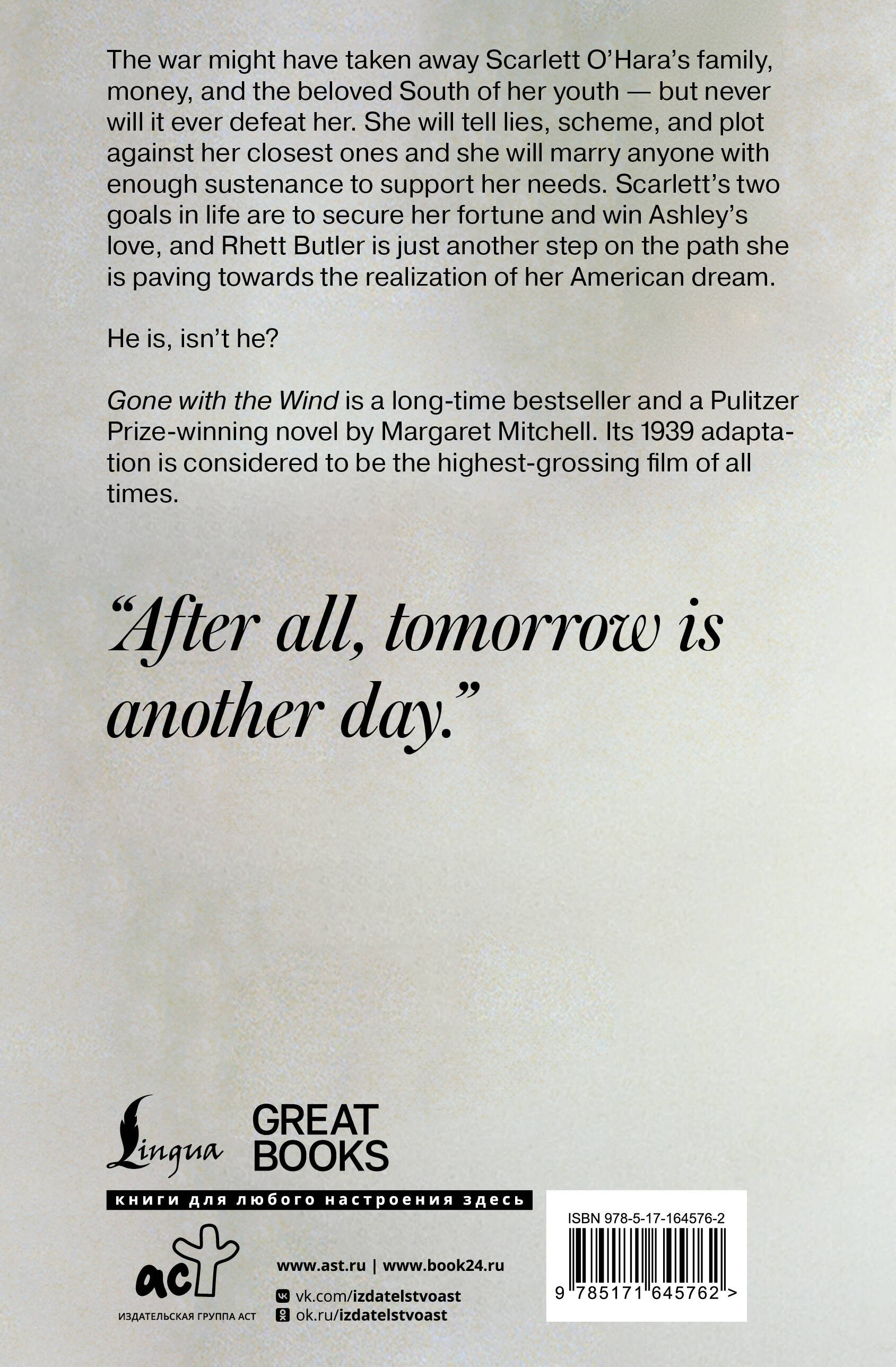 Война забрала у Скарлетт семью, деньги и возлюбленный Юг ее юности - но сломить ее? Нет, этого не случится. Скарлетт будет врать, мошенничать, и плести интриги против самых близких, она наймет заключенных вместо рабов и выйдет замуж за любого, чьих средств хватит, чтобы обеспечивать ее и ее амбиции. Скарлетт преследует только две цели: любовь Эшли и богатство. И Ретт Батлер - лишь ступенька на пути к исполнению ее американской мечты. Ведь так? "Унесённые ветром" - роман-бестселлер, который принес Маргарет Митчелл мировую славу и Пулитцеровскую премию. Книга легла в основу одноимённого фильма 1937 года, признанного самым кассовым в истории кинематографа.| Издательство | Издательство "АСТ" |