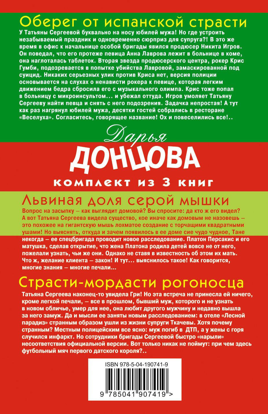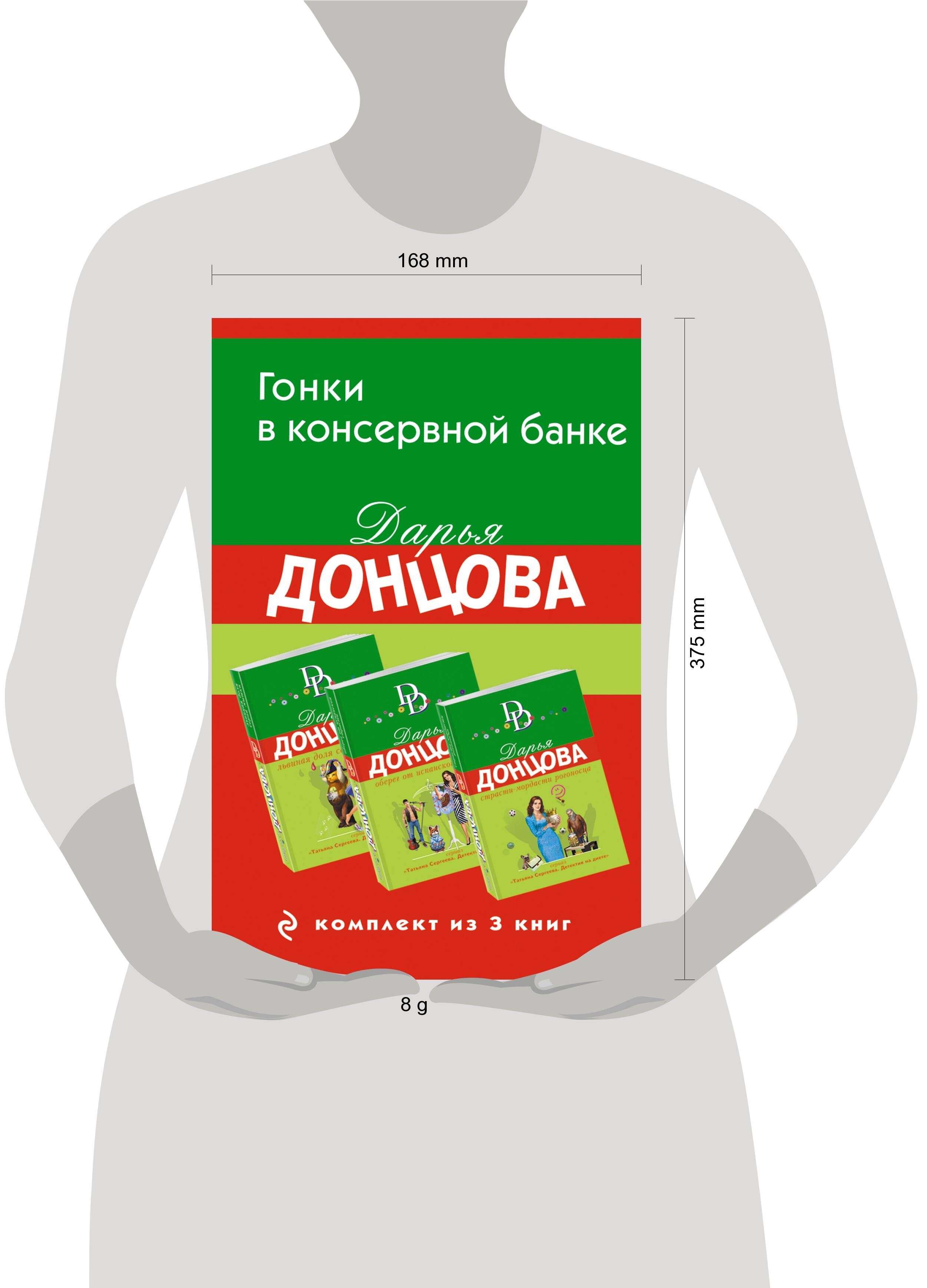 Комплект из 3-х книг, в который входят романы «Львиная доля серой мышки», «Оберег от испанской страсти», «Страсти-мордасти рогоносца». «Львиная доля серой мышки» Вопрос на засыпку - как выглядит домовой? Вы спросите, да кто ж его видел? А вот Татьяна Сергеева видела существо, кое иначе чем домовым не назовешь - это похожее на гигантскую мышь лохматое создание с торчащими квадратными ушами! Но выяснять, откуда и зачем появилось в ее доме сие чудо чудное, Тане некогда - ее спецбригада проводит новое расследование. Платон Персакис и его матушка, сделав открытие, что жена Платона родила детей вовсе не от него, пожелали узнать, чьи же они. Однако не ставя в известность об этом их мать. Что ж желание клиента - закон! И тут... выяснилось такое! Как говорится, многие знания - многие печали… «Оберег от испанской страсти» У Татьяны Сергеевой буквально на носу юбилей мужа! Но где устроить незабываемый праздник и одновременно сюрприз для супруга?! В это же время в офис к начальнице особой бригады явился продюсер Никита Игров. Он поведал, что его протеже - певица Анна Лаврова - лежит в больнице в коме, она наглоталась таблеток. Вторая звезда продюсерского центра, рокер Крис Гумби, подозревается в попытке убийства Лавровой, замаскированной под суицид. Никаких серьезных улик против Криса нет, версия полиции основывается на слухах о ненависти рокера к певице, которая легким движением бедра сбросила его с музыкального Олимпа. Крис тоже попал в больницу с микроинсультом... и убежал оттуда. Игров умоляет Татьяну Сергееву найти певца и снять с него подозрения. Задачка непростая! А тут как раз нагрянул юбилей мужа, десятки гостей собрались в ресторане «Веселуха». Согласитесь, говорящее название! Ох, и повеселились все!.. «Страсти-мордасти рогоносца» Татьяна Сергеева наконец-то увидела Гри! Но эта встреча не принесла ей ничего, кроме легкой печали - все в прошлом, бывший муж, которого и не узнать в новом обличье, умер для нее, она любит другого мужчину и недавно вышла за него замуж. Да и мысли ее заняты новым расследованием: в отеле «Лесной парадиз» странным образом ушли из жизни супруги Ткачевы. Хотя почему странным? Местным полицейским все ясно: муж погиб в ДТП, а у жены с горя случился инфаркт. Но сотрудники бригады Сергеевой быстро «нарыли» несоответствия официальной версии. Вот только никак не поймут: при чем здесь футбольный мяч первого датского короля?..| Издательство | ООО "Издательство "Эксмо" |