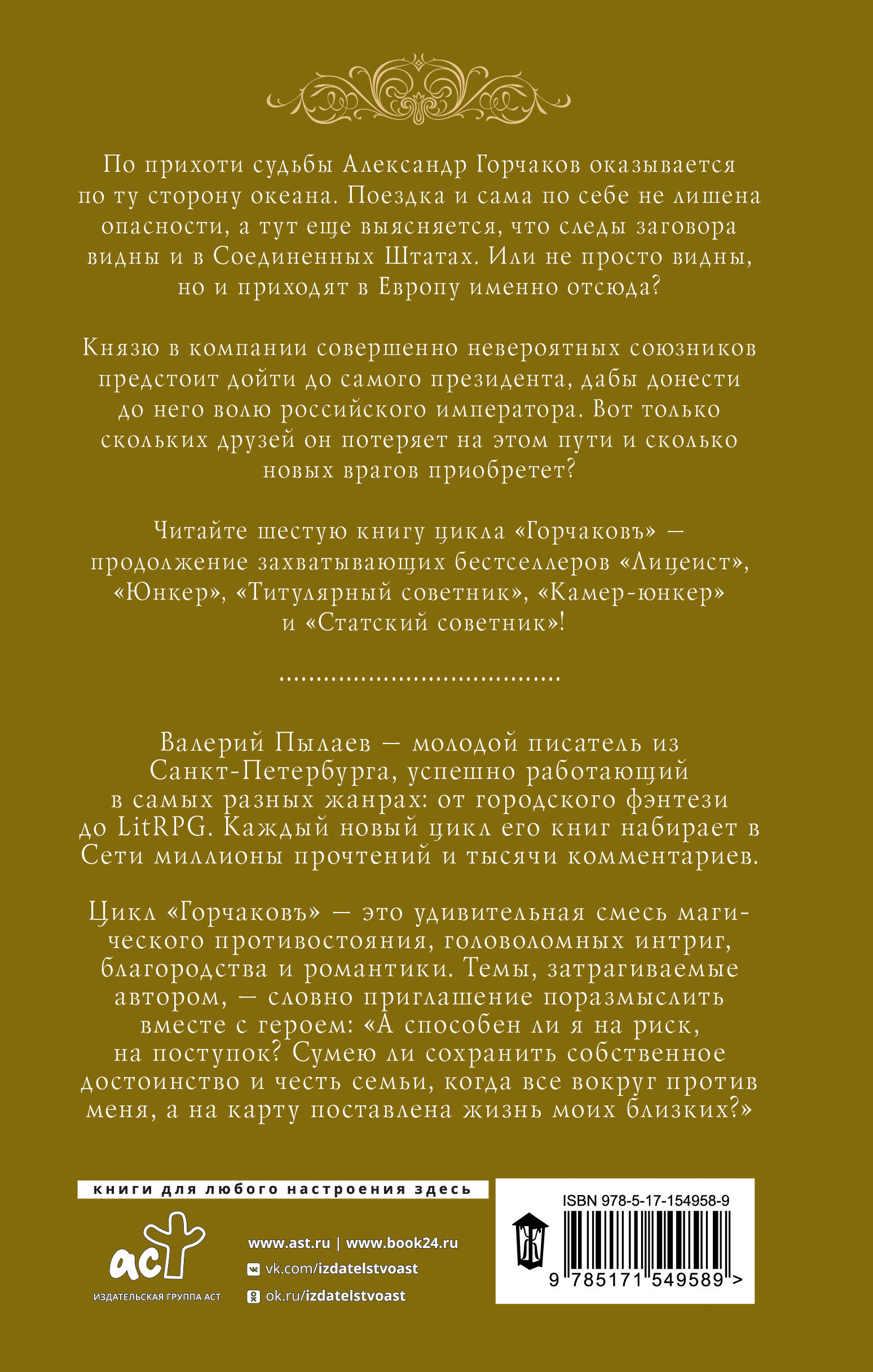 - Шестая часть авантюрно-приключенческой саги «Горчаковъ». - Каждый новый цикл Валерия Пылаева набирает в Сети миллионы прочтений и тысячи комментариев! - В марте 2023 года авторский цикл Валерия Пылаева «Горчаковъ» попал в шорт-лист литературной премии «Пересвет», присуждаемой фантастическим произведениям патриотической направленности. В апреле 2023 первый роман цикла вошел в шорт-лист премии «РосКон-2023». - Цикл «Горчаковъ» - это удивительная смесь магического противостояния, головоломных интриг, благородства и романтики. - Темы, затрагиваемые автором: долг, честь, семья, любовь, предательства, настоящая мужская дружба и умение принять ответственность, несмотря на опасность.