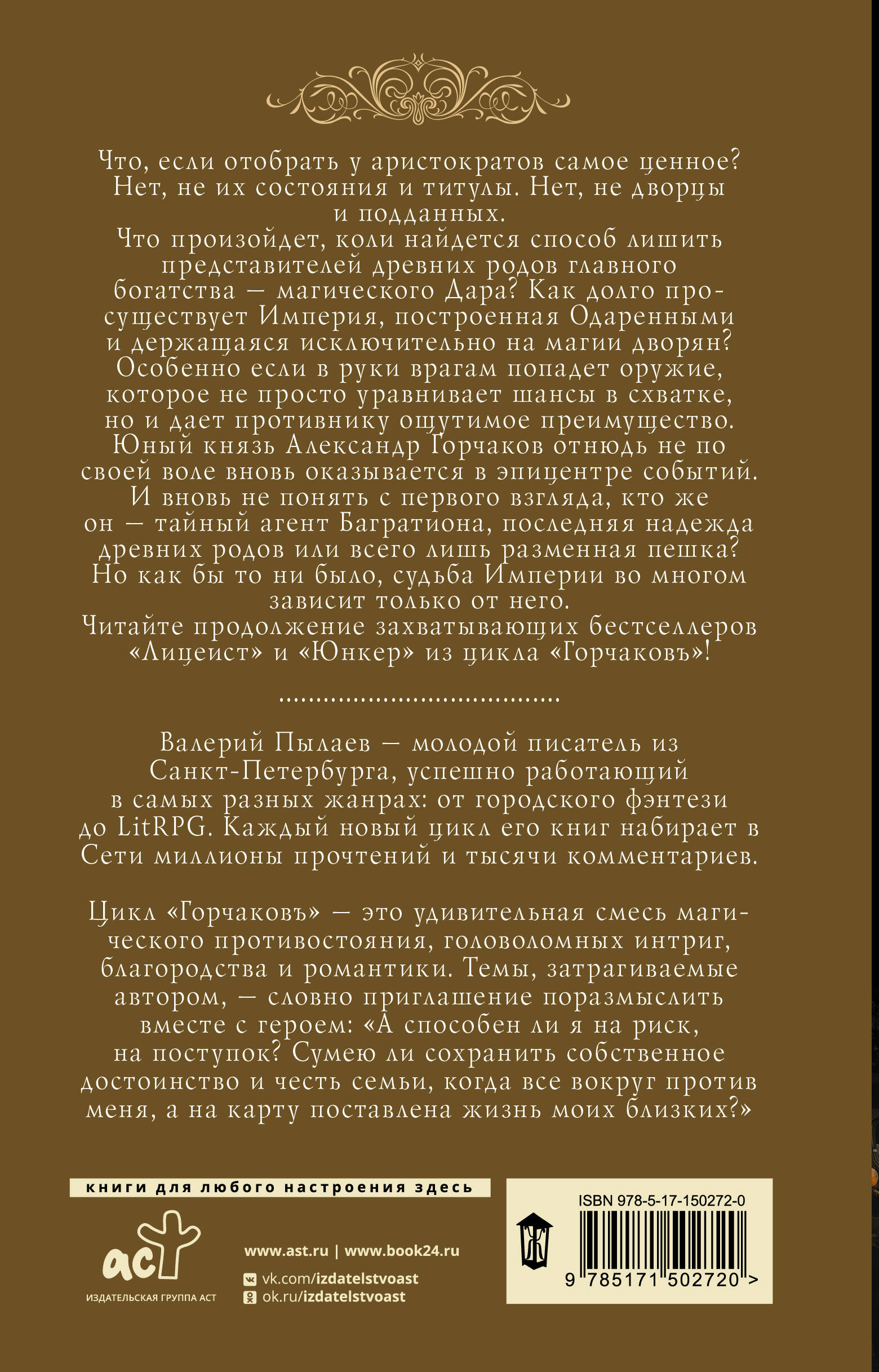 Что, если отобрать у аристократов самое ценное? Нет, не их состояния и титулы. Нет, не дворцы и подданных. Что произойдет, коли найдется способ лишить представителей древних родов главного богатства - магического Дара? Как долго просуществует Империя, построенная Одаренными и держащаяся исключительно на магии дворян? Особенно если в руки врагам попадет оружие, которое не просто уравнивает шансы в схватке, но и дает противнику ощутимое преимущество. Юный князь Александр Горчаков отнюдь не по своей воле вновь оказывается в эпицентре событий. И вновь не понять с первого взгляда, кто же он - тайный агент Багратиона, последняя надежда древних родов или всего лишь разменная пешка? Но как бы то ни было, судьба Империи во многом зависит только от него. Читайте продолжение захватывающих бестселлеров "Лицеист" и "Юнкер" из цикла "Горчаковъ"!| Издательство | ИЗДАТЕЛЬСТВО "АСТ" |
