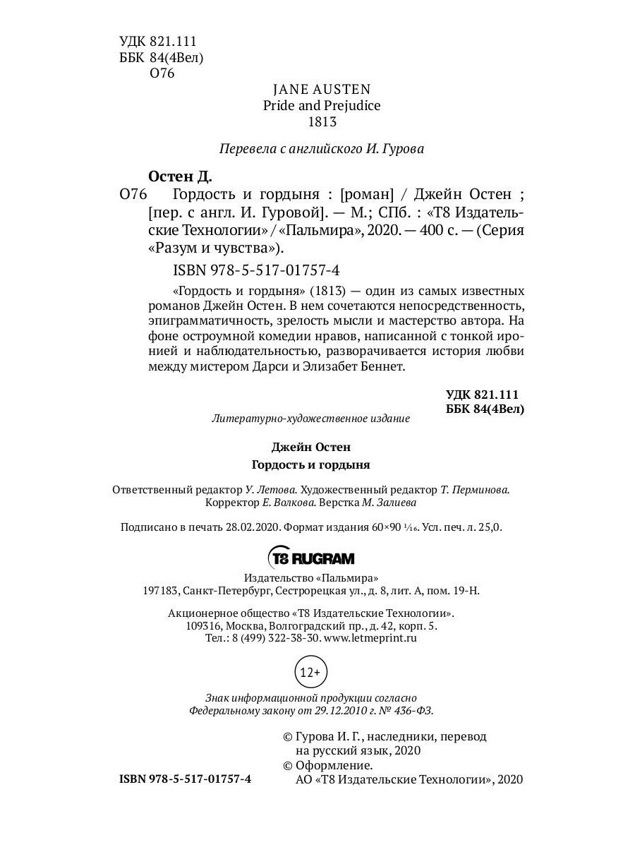 «Гордость и гордыня» (1813) - один из самых известных романов Джейн Остен. В нем сочетаются непосредственность, эпиграмматичность, зрелость мысли и мастерство автора. На фоне остроумной комедии нравов, написанной с тонкой иронией и наблюдательностью, разворачивается история любви между мистером Дарси и Элизабет Беннет.| Издательство | Т8 RUGRAM |