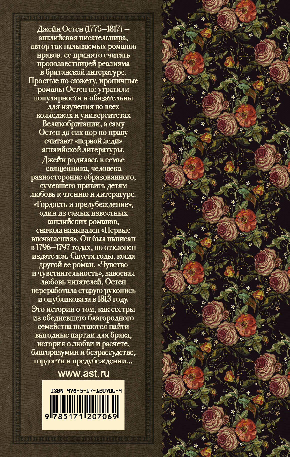 Джейн Остен (1775-1817) - английская писательница, автор так называемых романов нравов, ее принято считать провозвестницей реализма в британской литературе. Простые по сюжету, ироничные романы Остен не утратили популярности и обязательны для изучения во всех колледжах и университетах Великобритании, а саму Остен до сих пор по праву считают «первой леди» английской литературы. Джейн родилась в семье священника, человека разносторонне образованного, сумевшего привить детям любовь к чтению и литературе. У Джейн были шестеро братьев и сестра, с которой она была особенно близка всю свою жизнь. Все произведения Остен публиковала анонимно. «Гордость и предубеждение», один из самых известных английских романов, сначала назывался «Первые впечатления». Он был написан в 1796-1797 гг., но отклонен издателем. Спустя годы, когда другой ее роман «Чувство и чувствительность» завоевал любовь читателей, Остен переработала старую рукопись и опубликовала в 1813 г. Это история о том, как сестры из обедневшего благородного семейства пытаются найти выгодные партии для брака, история о любви и расчете, благоразумии и безрассудстве, гордости и предубеждении…| Издательство | ИЗДАТЕЛЬСТВО "АСТ" |
