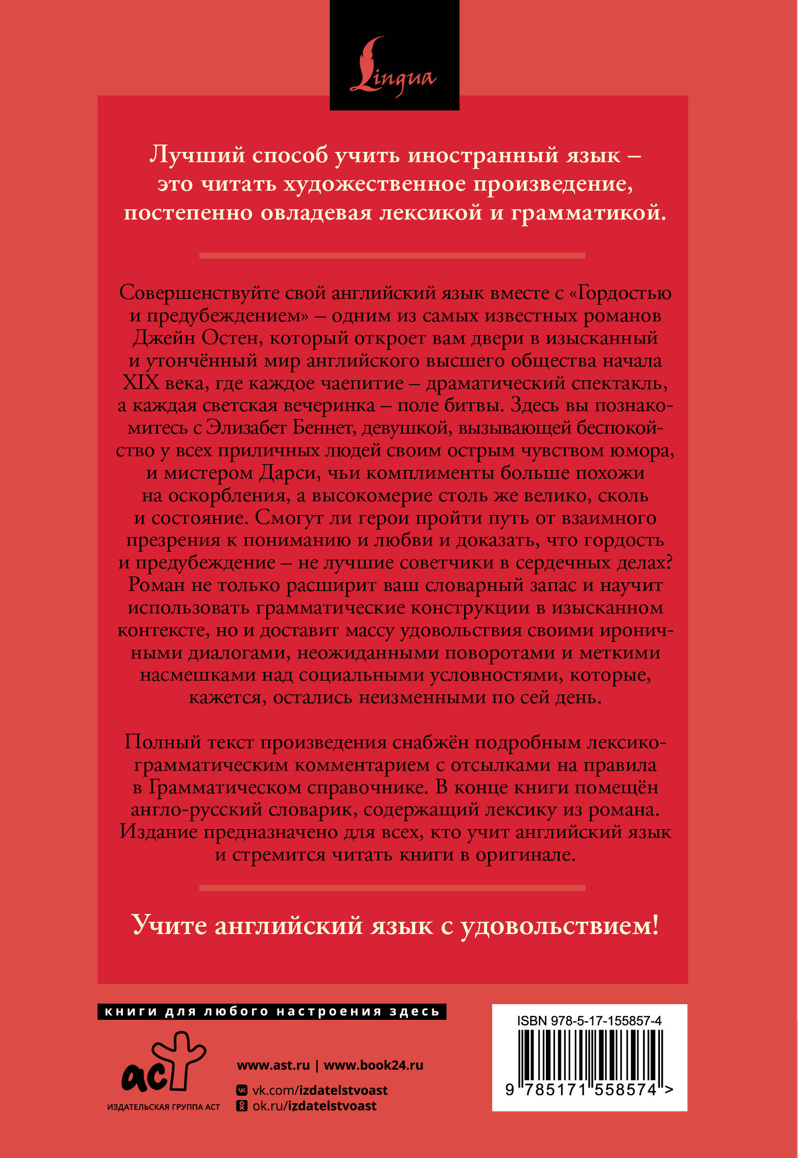 Лучший способ учить иностранный язык - это читать художественное произведение, постепенно овладевая лексикой и грамматикой. Совершенствуйте свой английский язык вместе с "Гордостью и предубеждением" - одним из самых известных романов Джейн Остен, который откроет вам двери в изысканный и утончённый мир английского высшего общества начала XIX века, где каждое чаепитие - драматический спектакль, а каждая светская вечеринка - поле битвы. Здесь вы познакомитесь с Элизабет Беннет, девушкой, вызывающей беспокойство у всех приличных людей своим острым чувством юмора, и мистером Дарси, чьи комплименты больше похожи на оскорбления, а высокомерие столь же велико, сколь и состояние. Смогут ли герои пройти путь от взаимного презрения к пониманию и любви и доказать, что гордость и предубеждение - не лучшие советчики в сердечных делах? Полный текст произведения снабжён подробным лексико-грамматическим комментарием с отсылками на правила в Грамматическом справочнике. В конце книги помещён англо-русский словарик, содержащий лексику из романа. Издание предназначено для всех, кто учит английский язык и стремится читать книги в оригинале.| Издательство | Издательство "АСТ" |