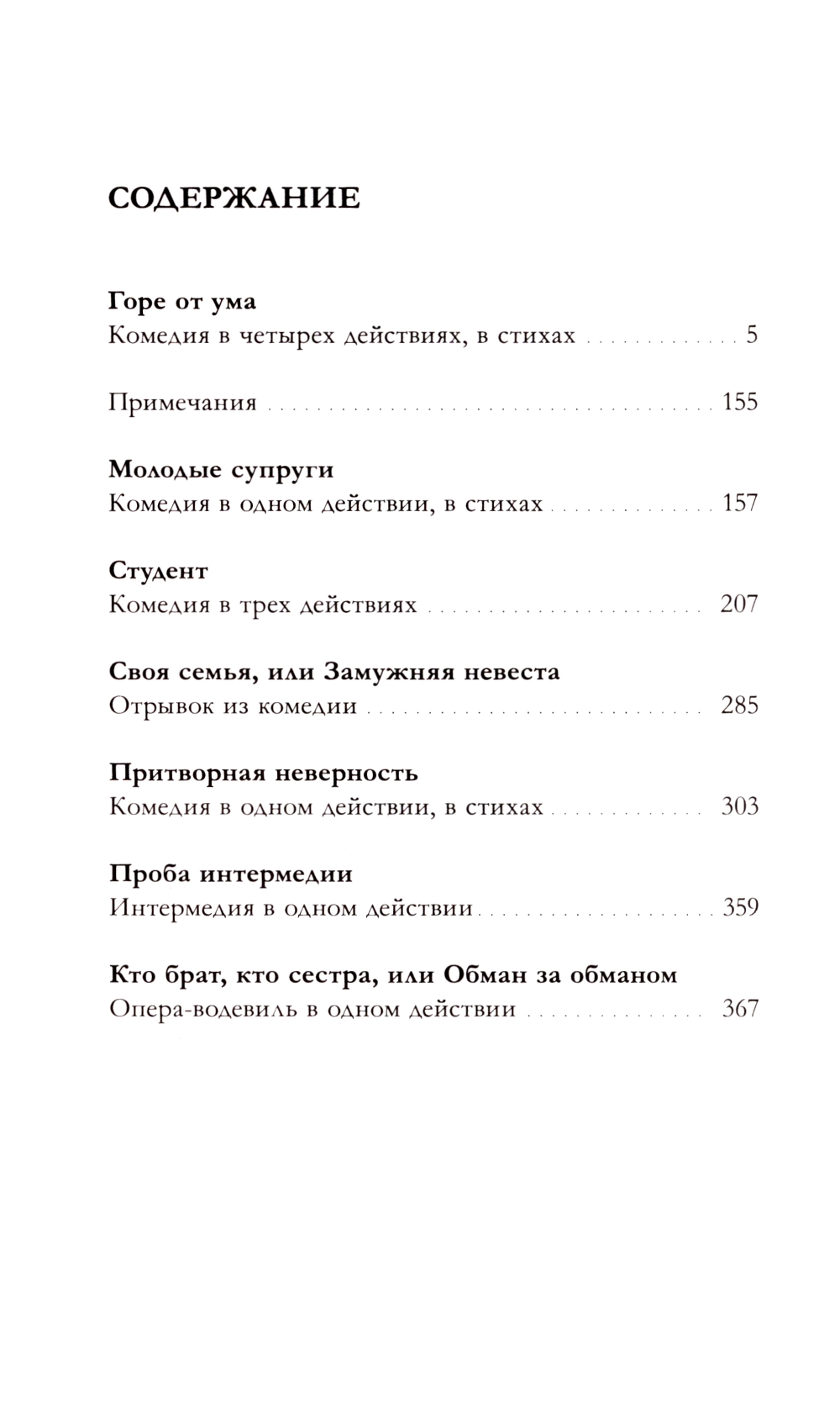 «Горе от ума» - самое известное произведение поэта, композитора и дипломата Александра Сергеевича Грибоедова и одно из самых цитируемых произведений русской литературы. Также в сборнике: «Молодые супруги», «Студент», «Своя семья, или Замужняя невеста», «Притворная неверность», «Проба интермедии», «Кто брат, кто сестра, или Обман за обманом». Пьесу в стихах не случайно называют вечной классикой. Вопросы, которые автор задает героям и читателю, по-прежнему волнуют. Кто прав - отцы или дети? Что важнее - статус или честь, рассудок или голос сердца? И наконец, какой должна быть любовь: безликой, но угодливой или пылкой, но гордой? Герои пьесы по-разному отвечают на эти вопросы, и каждого ждет свой финал, не всегда счастливый, но реалистичный. В книге переплетаются любовь и обман, страсть и горечь, легкий юмор и едкая сатира.