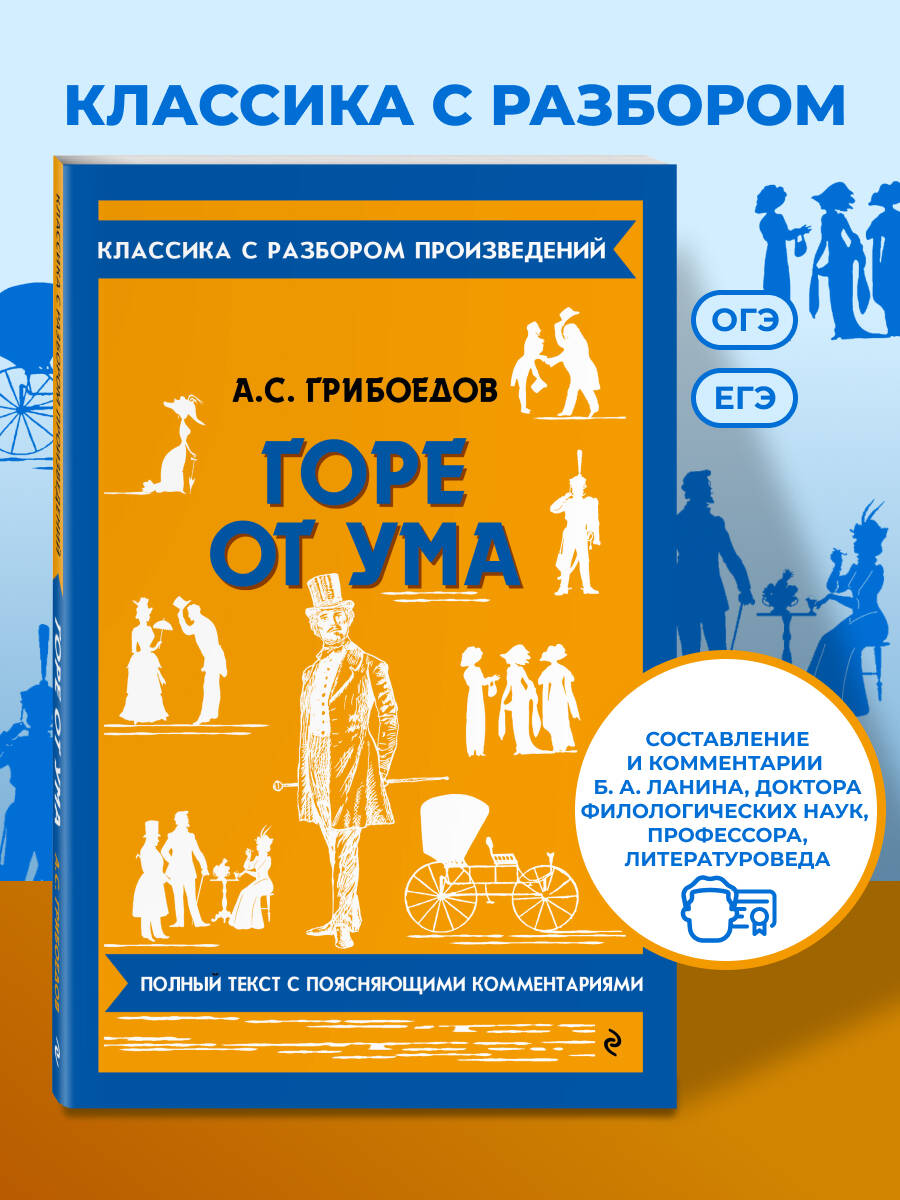«Горе от ума» - одно из главных произведений русской литературы. Пьеса в жанре социальной комедии первой половины XIX века признана на мировом уровне. Эта гениальная книга до сих пор пользуется большой популярностью как среди школьников, так и среди старших поколений. Новое издание пьесы станет незаменимым помощником в подготовке к ЕГЭ, ОГЭ и урокам литературы. В нем вы найдете уникальные справочные материалы: заметки на полях для быстрого поиска нужного фрагмента, развернутые комментарии, где объясняются устаревшие слова и непонятные факты, историю создания произведения, указатель имен и событий. Все это поможет не только быстро и легко подготовиться к экзаменам, но и узнать новые факты, которые можно было упустить на уроке. В комедии А. С. Грибоедова рассказывается о конфликте молодого прогрессивного дворянина Александра Чацкого и закостенелого столичного светского общества. Пьеса является ярким представителем «комедии нравов», критикуя присутствующие лицемерность, двуличность и предрассудки среди аристократии.| Издательство | ООО "Издательство "Эксмо" |