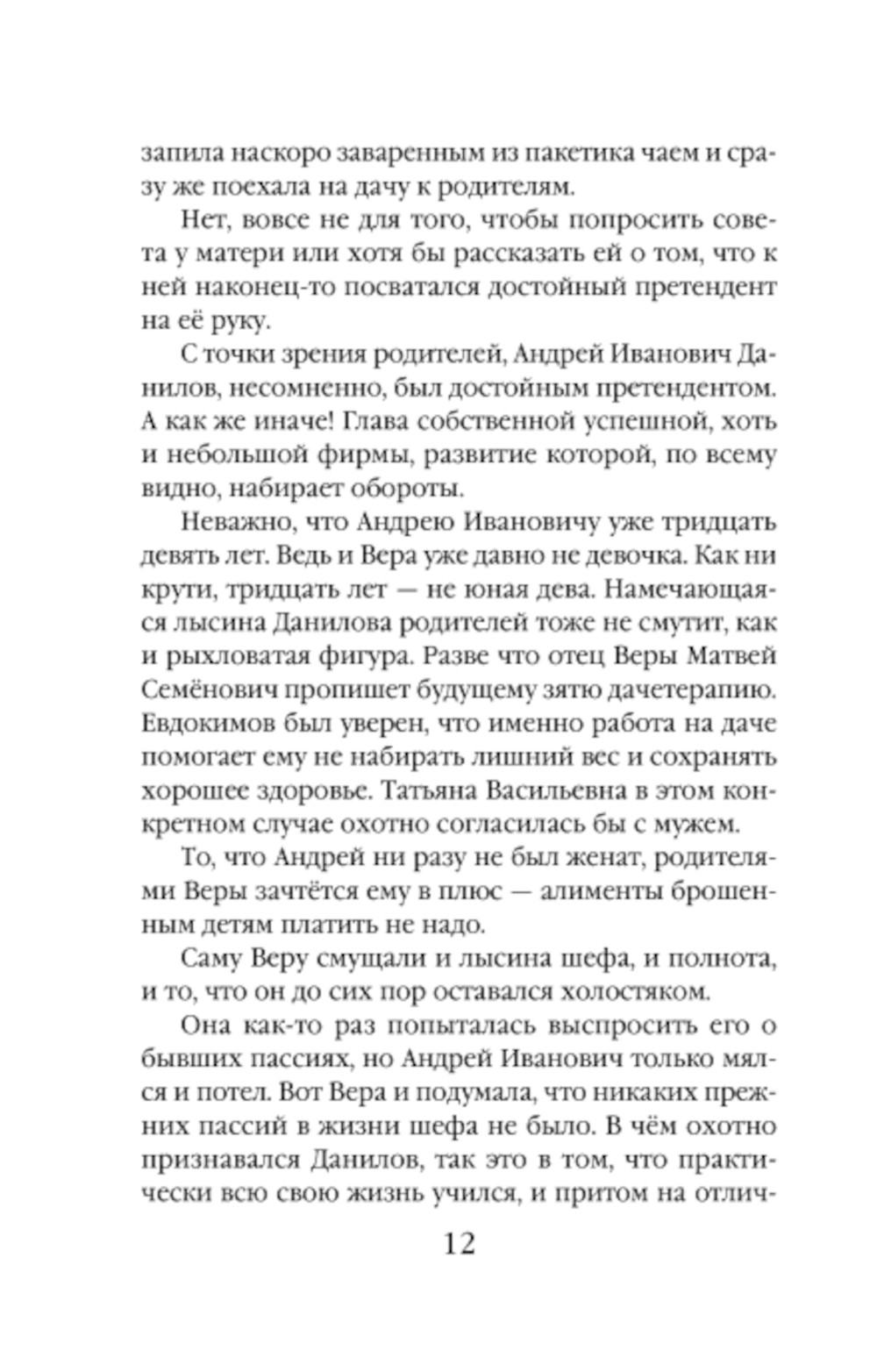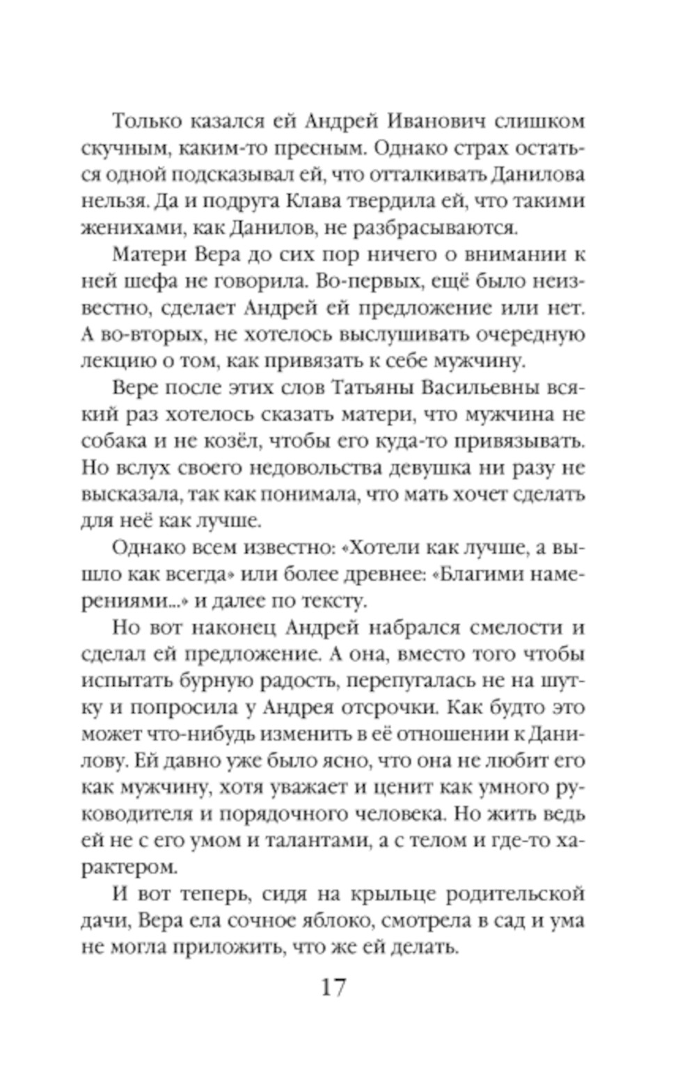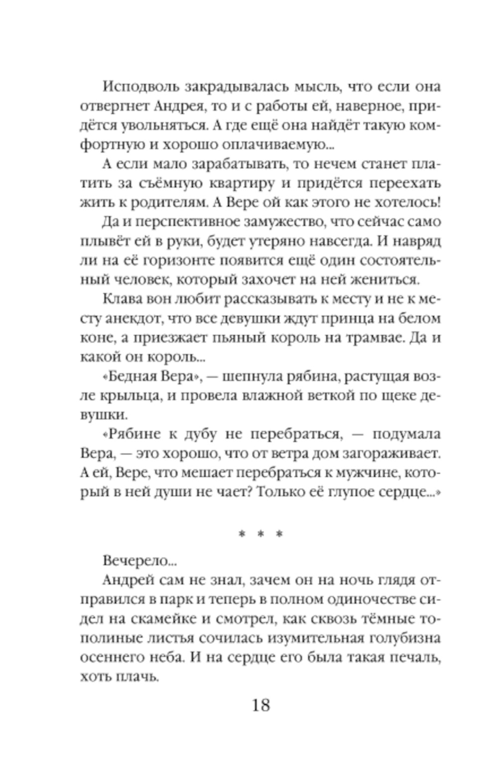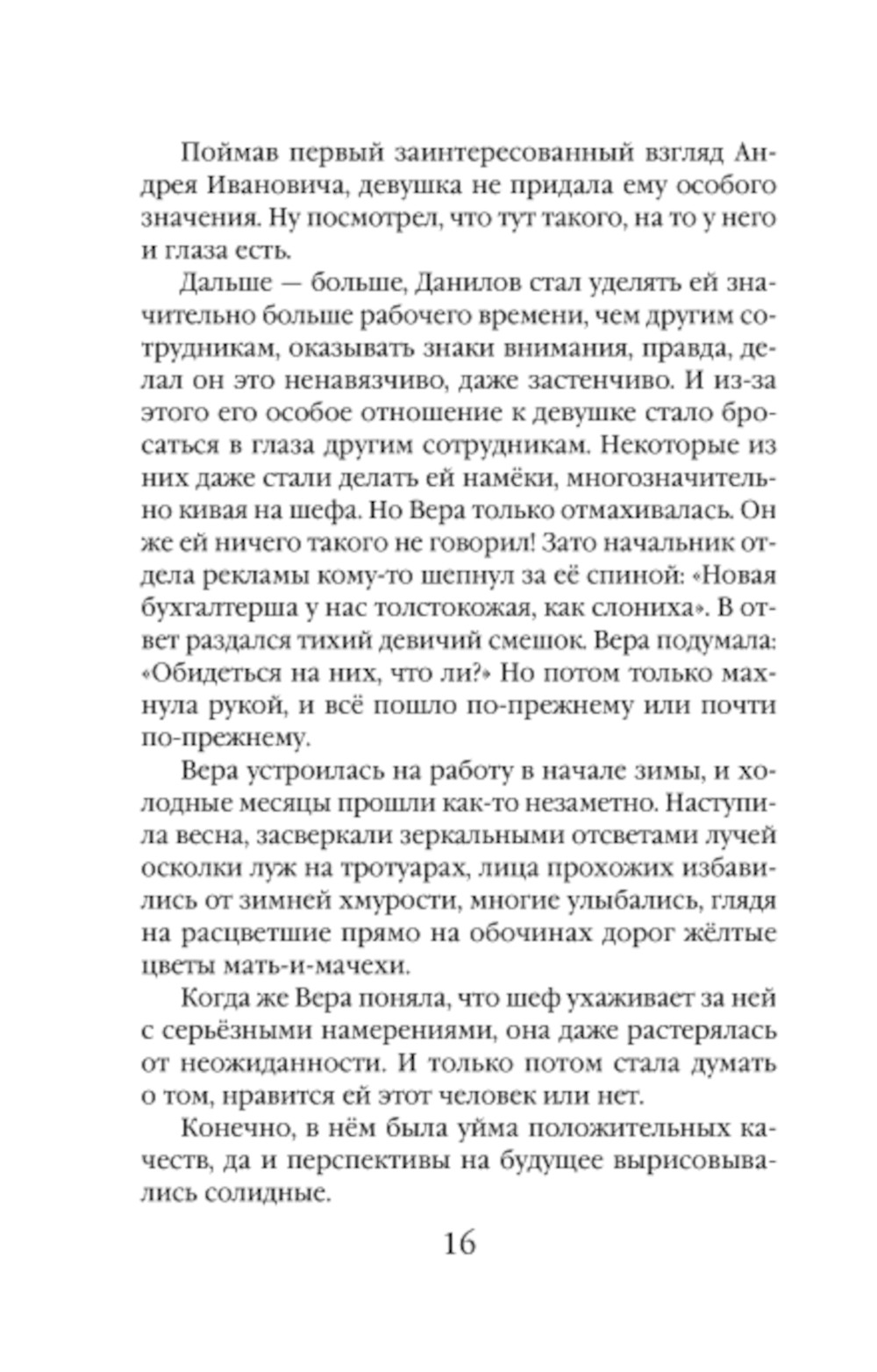 Симпатичная и умная Вера имеет заботливых родителей, верную подругу, любимую хорошо оплачиваемую работу. Но Вере тридцать лет, и пора бы замуж. Неожиданно в Веру влюбляется ее шеф и делает ей предложение! Казалось, бы, Вера должна была обрадоваться, однако Вера пребывает в растерянности, ведь в ее душе ничего не отозвалось. Зато когда Вера случайно встретила уличного художника Эдуарда, внутри вспыхнуло пламя... Мирослава Волгина, владелица детективного агентства, получает необычный заказ. К ней обращается секретарша, которую обвинили в убийстве шефа на рабочем месте. Всё против девушки: даже на орудии убийства оказались ее отпечатки. Мирослава верит в невиновность секретарши и решает ей помочь...| Издательство | Эксмо |