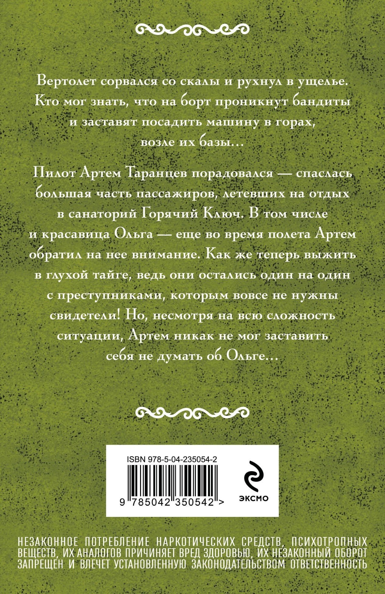 НЕЗАКОННОЕ ПОТРЕБЛЕНИЕ НАРКОТИЧЕСКИХ СРЕДСТВ, ПСИХОТРОПНЫХ ВЕЩЕСТВ, ИХ АНАЛОГОВ ПРИЧИНЯЕТ ВРЕД ЗДОРОВЬЮ, ИХ НЕЗАКОННЫЙ ОБОРОТ ЗАПРЕЩЕН И ВЛЕЧЕТ УСТАНОВЛЕННУЮ ЗАКОНОДАТЕЛЬСТВОМ ОТВЕТСТВЕННОСТЬ. Вертолет сорвался со скалы и рухнул в ущелье. Кто мог знать, что на борт проникнут бандиты и заставят посадить машину в горах, возле их базы… Пилот Артем Таранцев порадовался - спаслась большая часть пассажиров, летевших на отдых в санаторий «Горячий Ключ». В том числе и красавица Ольга, - еще во время полета Артем обратил на нее внимание. Как же теперь выжить в глухой тайге, ведь они остались один на один с преступниками, которым вовсе не нужны свидетели! Но несмотря на всю сложность ситуации, Артем никак не мог заставить себя не думать об Ольге…| Издательство | ООО "Издательство "Эксмо" |