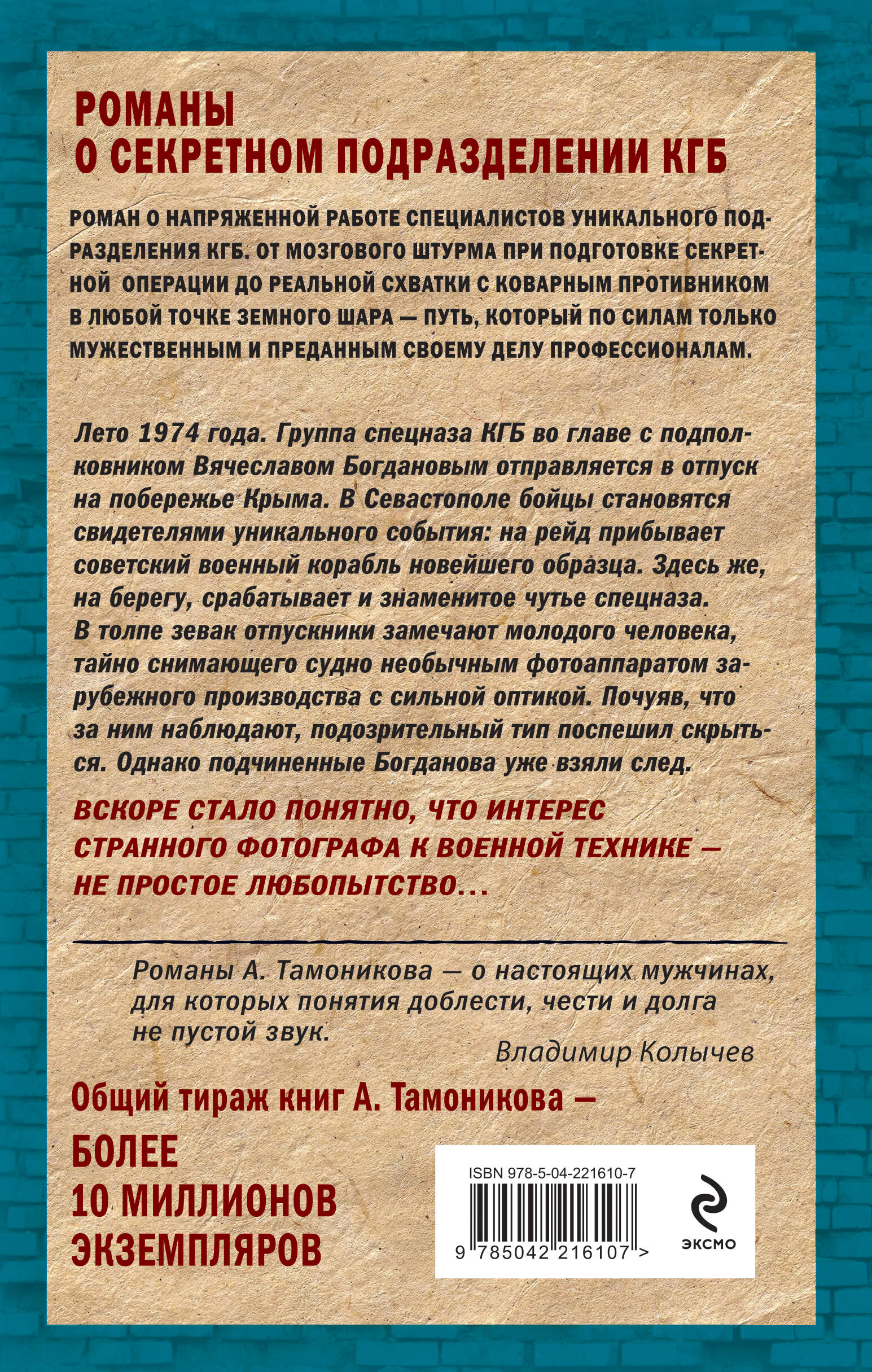Лето 1974 года. Группа спецназа КГБ во главе с подполковником Вячеславом Богдановым отправляется в отпуск на побережье Крыма. В Севастополе бойцы становятся свидетелями уникального события: на рейд прибывает советский военный корабль новейшего образца. Здесь же, на берегу, срабатывает и знаменитое чутье спецназа. В толпе зевак отпускники замечают молодого человека, тайно снимающего судно необычным фотоаппаратом зарубежного производства с сильной оптикой. Почуяв, что за ним наблюдают, подозрительный тип поспешил скрыться. Однако подчиненные Богданова уже взяли след. Вскоре стало понятно, что интерес странного фотографа к военной технике - не простое любопытство… Роман о напряженной работе специалистов уникального подразделения КГБ. От мозгового штурма при подготовке секретной операции до реальной схватки с коварным противником в любой точке земного шара - путь, который по силам только мужественным и преданным своему делу профессионалам. «Романы А. Тамоникова - о настоящих мужчинах, для которых понятия доблести, чести и долга - не пустой звук». - В. Колычев Общий тираж книг А. Тамоникова - более 10 миллионов экземпляров.| Издательство | ООО "Издательство "Эксмо" |