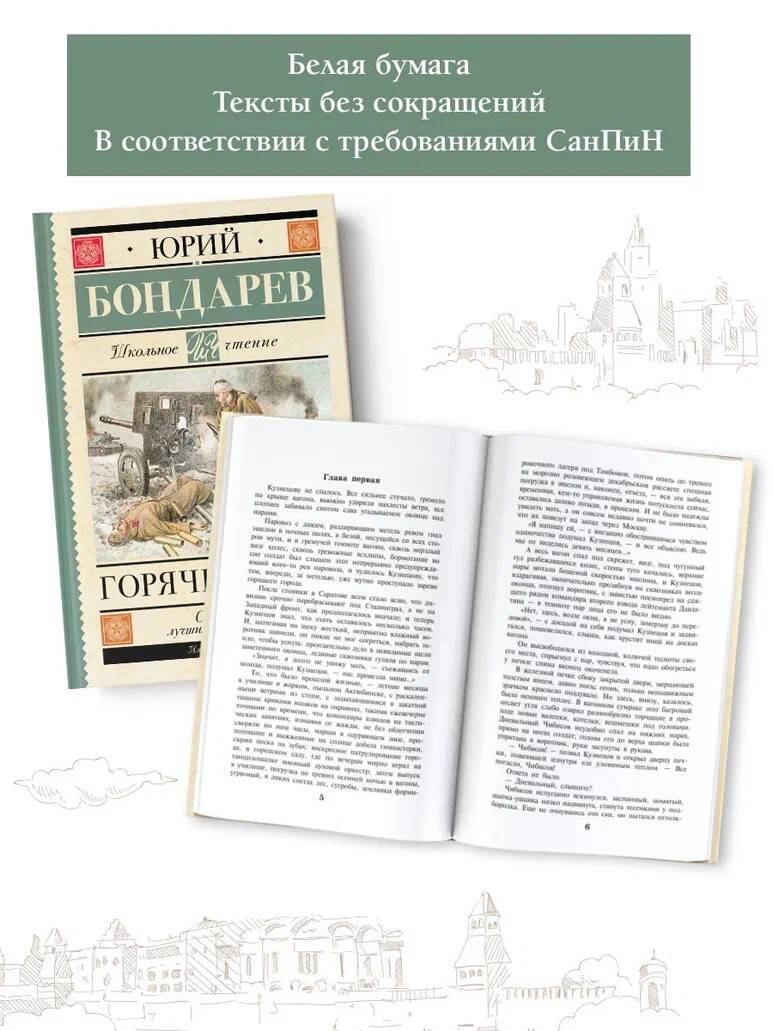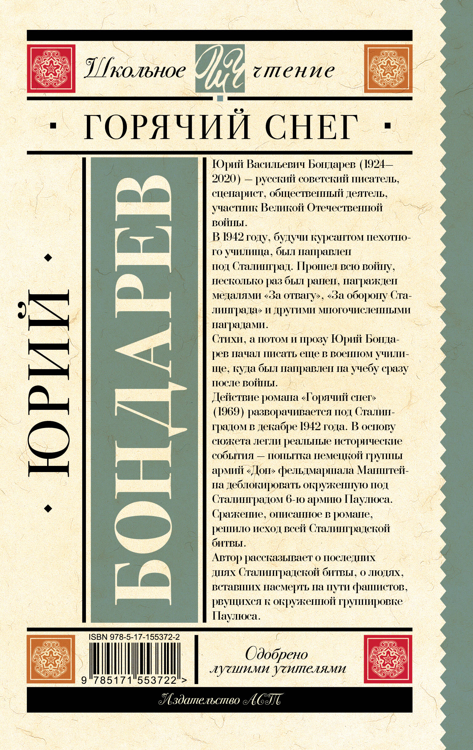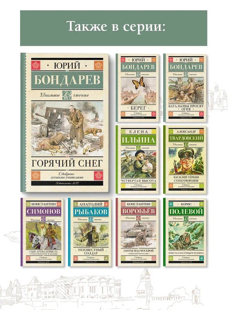 Юрий Васильевич Бондарев (1924-2020) - русский советский писатель, сценарист, общественный деятель, участник Великой Отечественной войны. В 1942 году, будучи курсантом пехотного училища, был направлен под Сталинград. Прошел всю войну, несколько раз был ранен, награжден медалями "За отвагу", "За оборону Сталинграда" и другими многочисленными наградами. Стихи, а потом и прозу Юрий Бондарев начал писать еще в военном училище, куда был направлен на учебу сразу после войны. Действие романа "Горячий снег" (1969) разворачивается под Сталинградом в декабре 1942 года. В основу сюжета легли реальные исторические события - попытка немецкой группы армий "Дон" фельдмаршала Манштейна деблокировать окруженную под Сталинградом 6-ю армию Паулюса. Сражение, описанное в романе, решило исход всей Сталинградской битвы.Автор рассказывает о последних днях Сталинградской битвы, о людях,вставших насмерть на пути фашистов,рвущихся к окруженной группировкеПаулюса.| Издательство | ИЗДАТЕЛЬСТВО "АСТ" |
