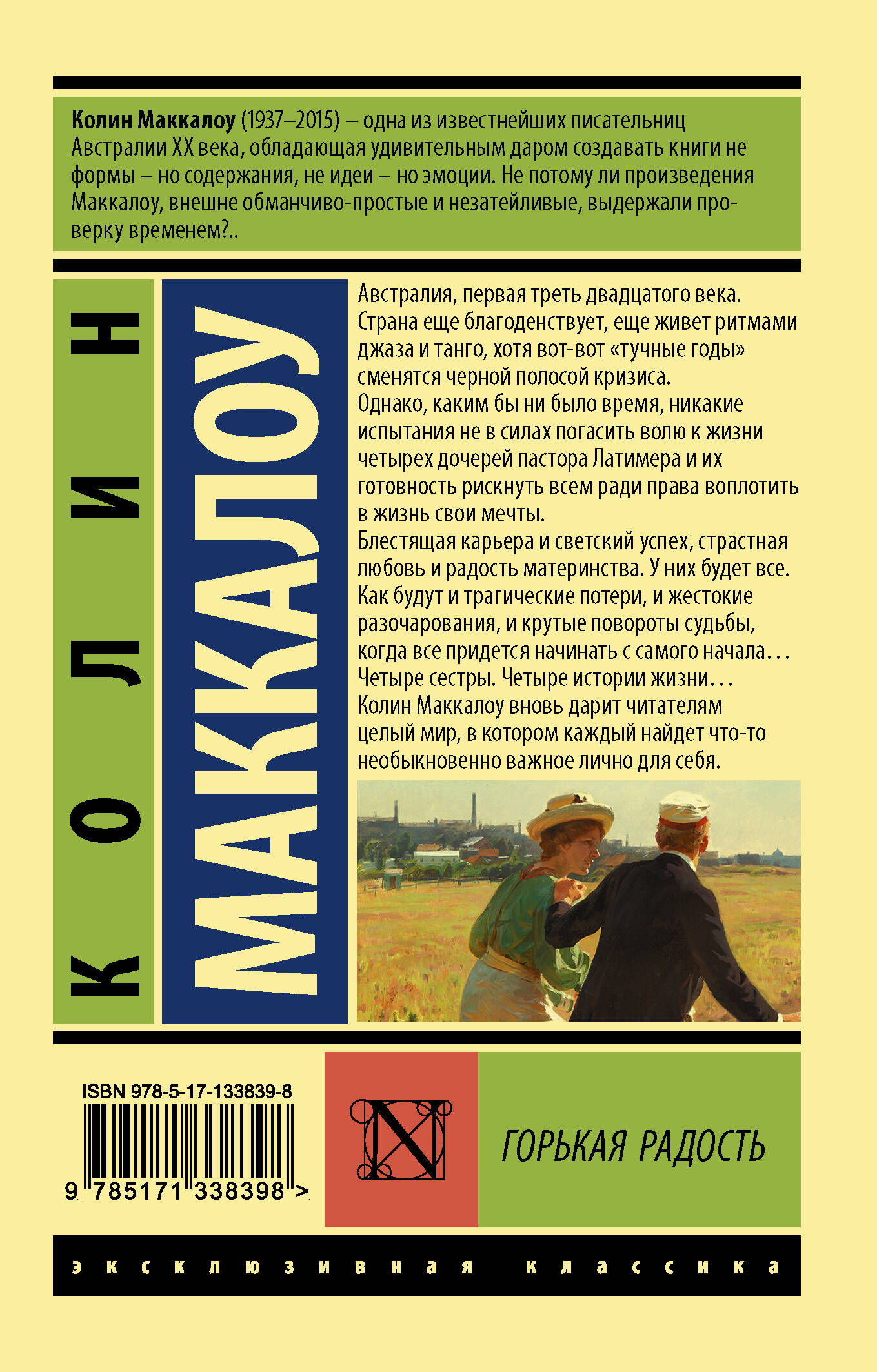 Австралия, первая треть двадцатого века. Страна еще благоденствует, еще живет ритмами джаза и танго, хотя вот-вот "тучные годы" сменятся черной полосой кризиса. Однако каким бы ни было время, никакие испытания не в силах погасить волю к жизни четырех дочерей пастора Латимера и их готовность рискнуть всем ради права воплотить в жизнь свои мечты. Блестящая карьера и светский успех, страстная любовь и радость материнства. У них будет все. Как будут и трагические потери, и жестокие разочарования, и крутые повороты судьбы, когда все придется начинать с самого начала… Четыре сестры. Четыре истории жизни… Колин Маккалоу вновь дарит читателям целый мир, в котором каждый найдет что-то необыкновенно важное лично для себя.| Издательство | ИЗДАТЕЛЬСТВО "АСТ" |
