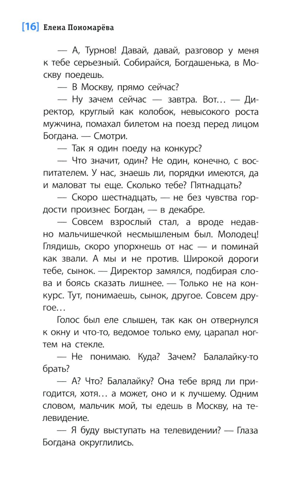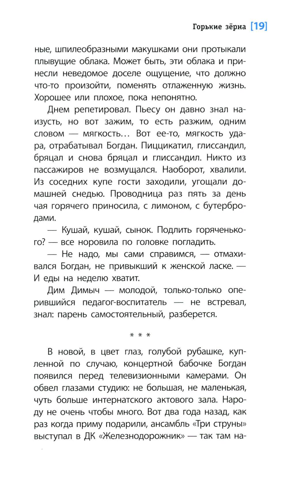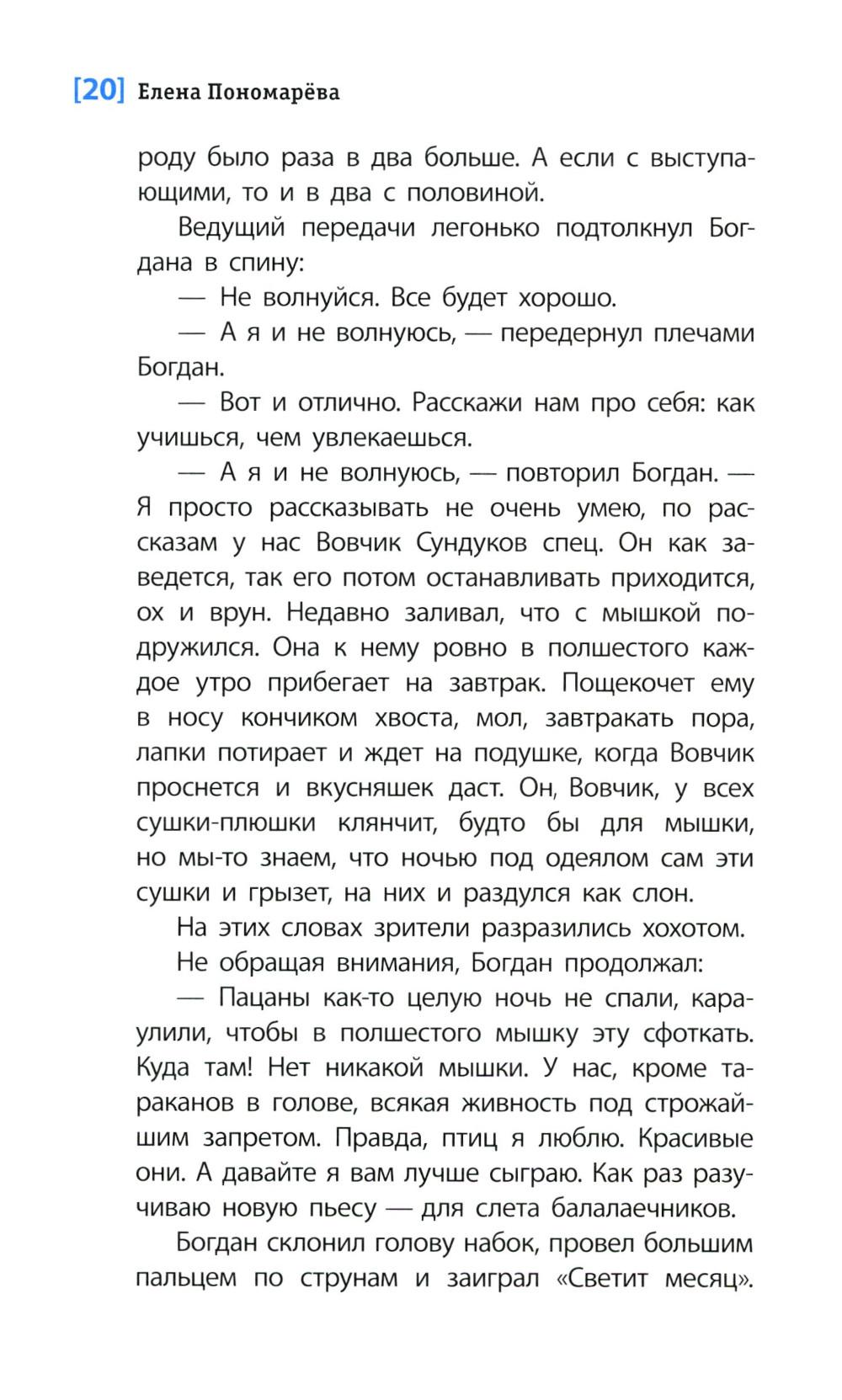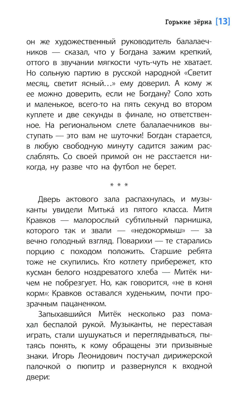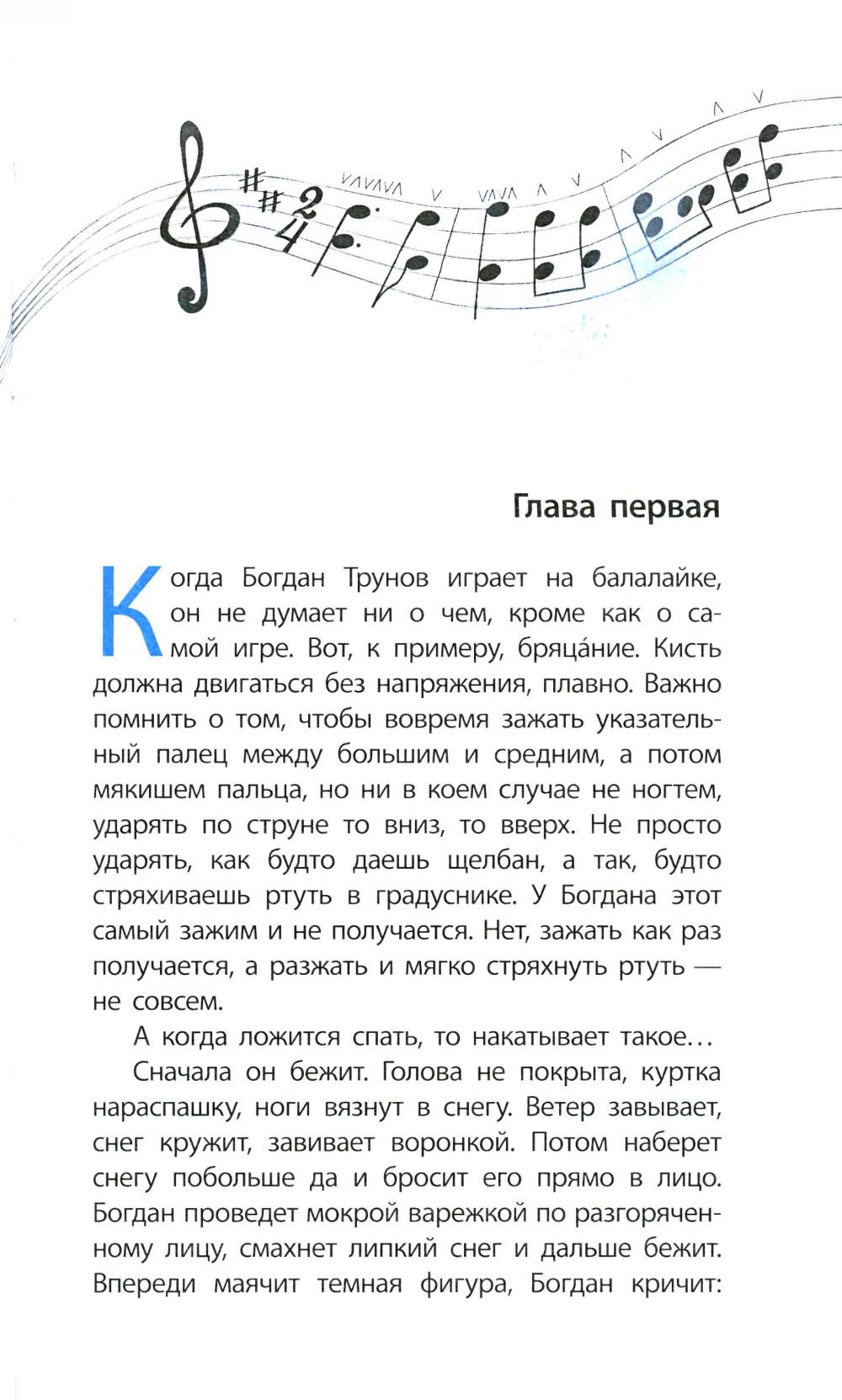 Богдан Трунов - удивительный мальчишка: занимается футболом, играет на балалайке - у него даже есть фанатки! Он солирует в оркестре, да и с учителями Богдану неимоверно повезло, и настоящие друзья у парня тоже имеются... И, как у всех его ровесников, у Богдана случается настоящая первая любовь. А еще у него есть серьезные проблемы с некоторыми одноклассниками, что тоже обычно для подростка. Ах, да! Богдана пригласили на телевизионную программу о поиске родственников, и там он встретил давно пропавшего отца. Жизнь нашего героя удивительная, интересная и яркая, эмоциональная и очень активная, да, собственно, такая, какой и должна быть!.. Но есть у Богдана одна особенность. Какая именно? Узнаете, прочитав эту книгу. Для среднего и старшего школьного возраста.