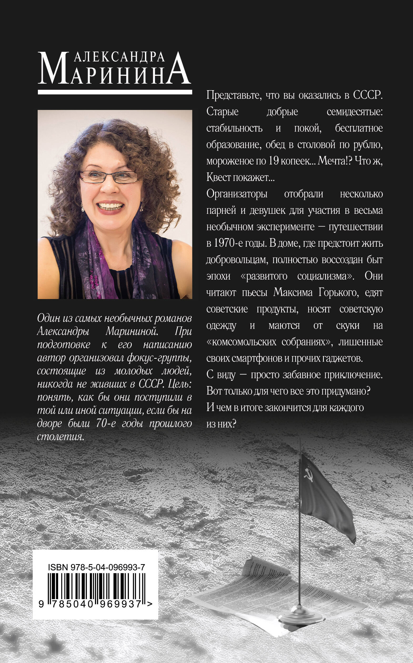 Роман-квест. Роман-тест. Роман-переосмысление! «Горький квест» - это невероятный эксперимент по погружению современных молодых людей в советскую эпоху 70-х годов. Для написания этого произведения Александра Маринина организовала фокус-группы современной молодежи и их реальные реакции описала в книге. Вы узнаете, как повело бы себя поколение Z в реалиях эпохи «развитого социализма». Они читают пьесы Максима Горького, едят советские продукты, носят советскую одежду и маются от скуки на «комсомольских собраниях», лишенные своих смартфонов. С виду - просто забавное приключение. Вот только для чего все это придумано? И чем в итоге закончится для каждого из них? Этот роман - для каждого, кто не живет настоящим, а кто думает о будущем, вспоминая прошлое... Представьте, что вы оказались в СССР. Старые добрые семидесятые: стабильность и покой, бесплатное образование, обед в столовой по рублю, мороженое по 19 копеек… Мечта?! Что ж, Квест покажет… Организаторы отобрали несколько парней и девушек для участия в весьма необычном эксперименте - путешествии в 1970-е годы. В доме, где предстоит жить добровольцам, полностью воссоздан быт эпохи «развитого социализма». Они читают пьесы Максима Горького, едят советские продукты, носят советскую одежду и маются от скуки на «комсомольских собраниях», лишенные своих смартфонов и прочих гаджетов. С виду - просто забавное приключение. Вот только для чего все это придумано? И чем в итоге закончится для каждого из них? «Маринина не только пишет детективные романы, но и отвечает на вечные вопросы. Автор относится к своим читателям как добрый и опытный учитель к ученикам, которые нуждаются в поддержке, подсказке и направлении на верный путь. Оптимистичная и практичная в своей дидактике, Маринина ставит перед собой вопрос "как жить" и старается помочь читателю найти свой путь к лучшей жизни в сегодняшнем мире. Своими детективами Маринина пишет современный роман "воспитания чувств": основная цель автора - воспитание посредством развлечения». - Анатолий Вишевский, Гринелльский колледж, США «Многие романы Александры Марининой в России экранизированы, а в Германии переработаны в радиопьесы. Исходя из того, что цель этих обработок - захватывать зрителей и слушателей таким же образом, как захвачены читатели, то фильм и радиопьеса являются не только дополнительными художественными произведениями, но и интересными интерпретациями, которые проникли в тайну успеха Александры Марининой». - Сара Хэги, Кельнский университет, Германия «В диалогах художественной и тривиальной литературы можно обнаружить разные способы стилизации "устности", чтобы достичь впечатления спонтанного разговора. Обиходная речь в романах А. Марининой отличается необыкновенно высокой степенью оживленности, что выражается, между прочим, в разных формах обращения собеседников, в различных оттенках вежливости и в эмоциональности используемой лексики». - Вольфганг Штадлер, Университет имени Леопольда Францена, Инсбрук, Австрия| Издательство | ООО "Издательство "Эксмо" |