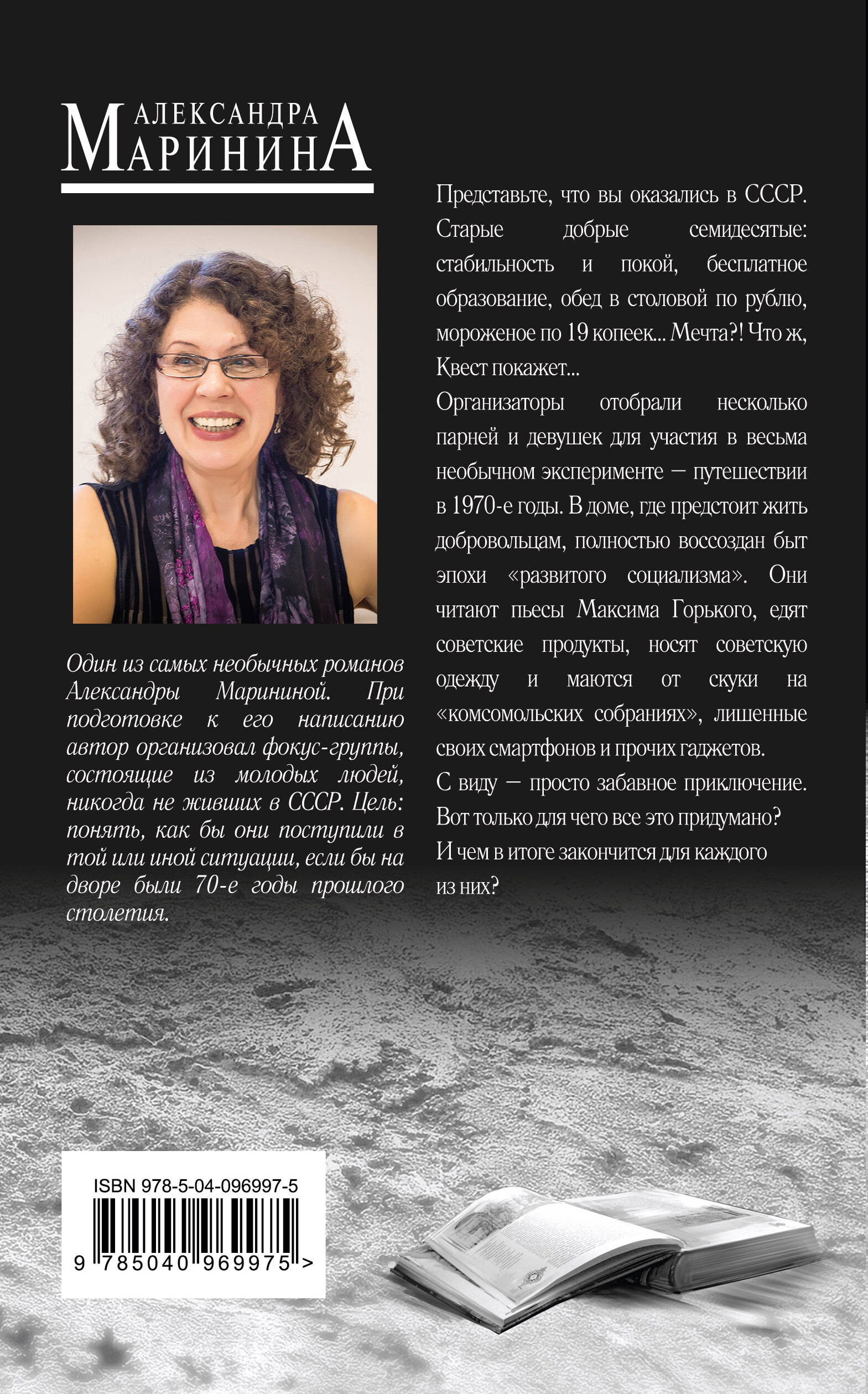 Один из самых необычных романов Александры Марининой. При подготовке к его написанию, автор организовал фокус-группы, состоящие из молодых людей, никогда не живших в СССР. Цель: Понять, как бы они поступили в той или иной ситуации, если бы на дворе были 70-е годы прошлого столетия. Представьте, что вы оказались в СССР. Старые добрые семидесятые: стабильность и покой, бесплатное образование, обед в столовой по рублю, мороженое по 19 копеек…Мечта!? Что ж, Квест покажет… Организаторы отобрали несколько парней и девушек для участия в весьма необычном эксперименте - путешествии в 1970-е годы. В доме, где предстоит жить добровольцам, полностью воссоздан быт эпохи "развитого социализма". Они читают пьесы Максима Горького, едят советские продукты, носят советскую одежду и маются от скуки на "комсомольских собраниях", лишенные своих смартфонов и прочих гаджетов. С виду - просто забавное приключение. Вот только для чего все это придумано? И чем в итоге закончится для каждого из них?| Издательство | ООО "Издательство "Эксмо" |