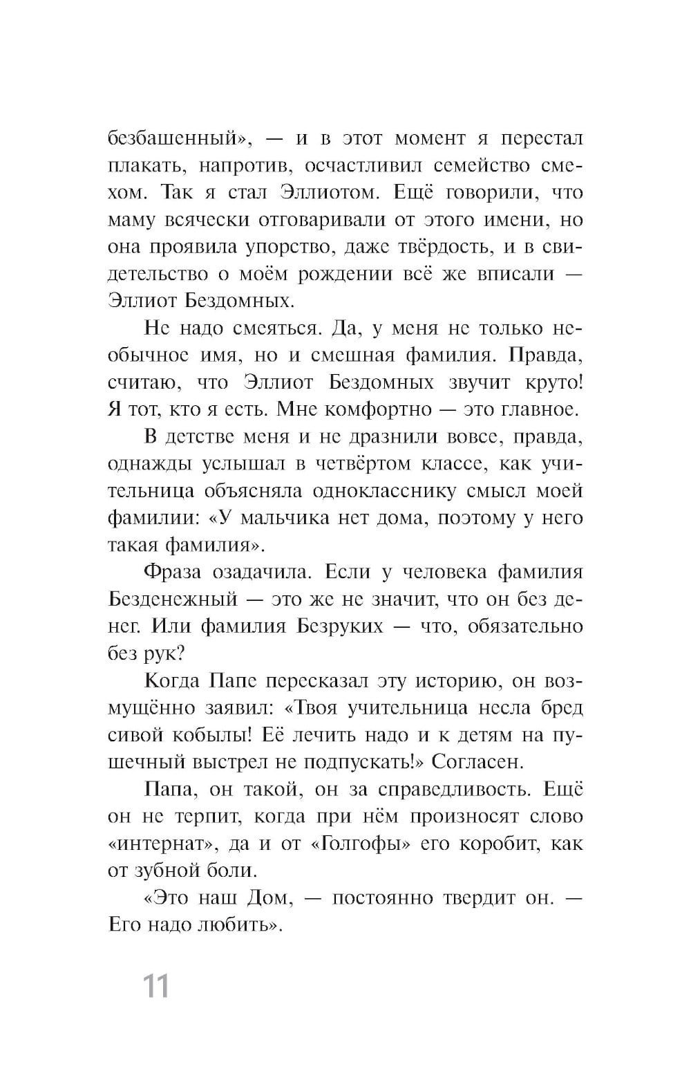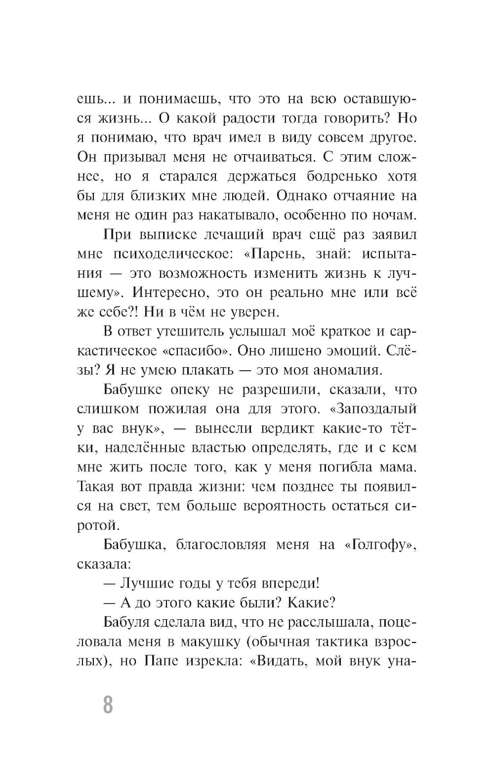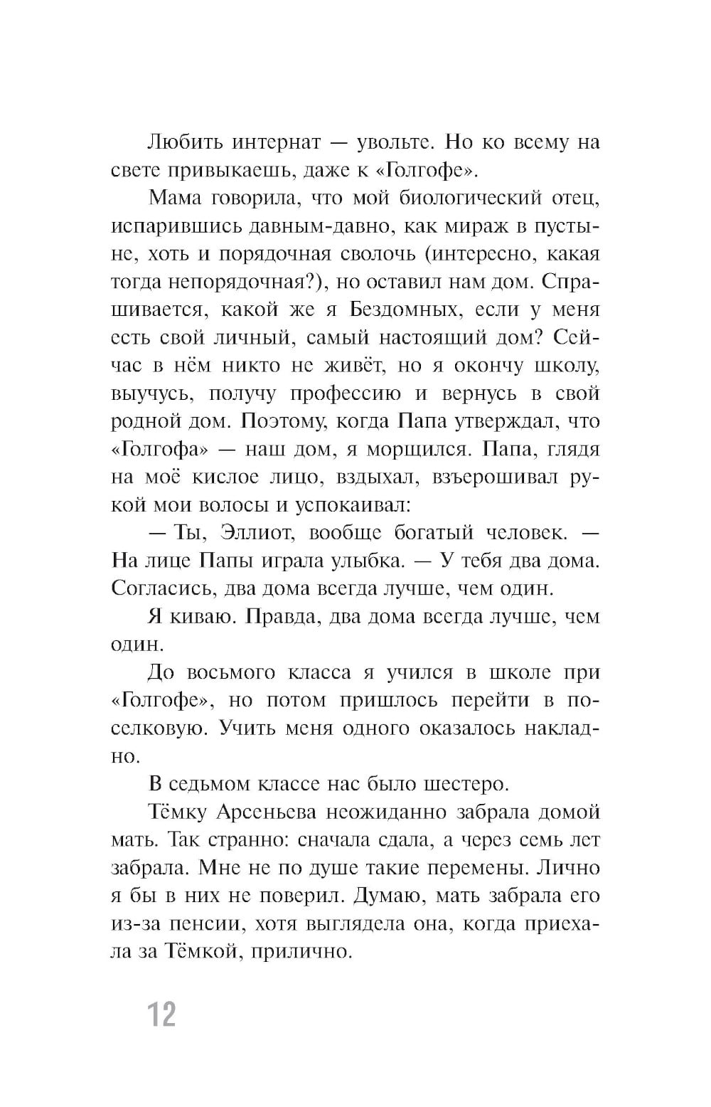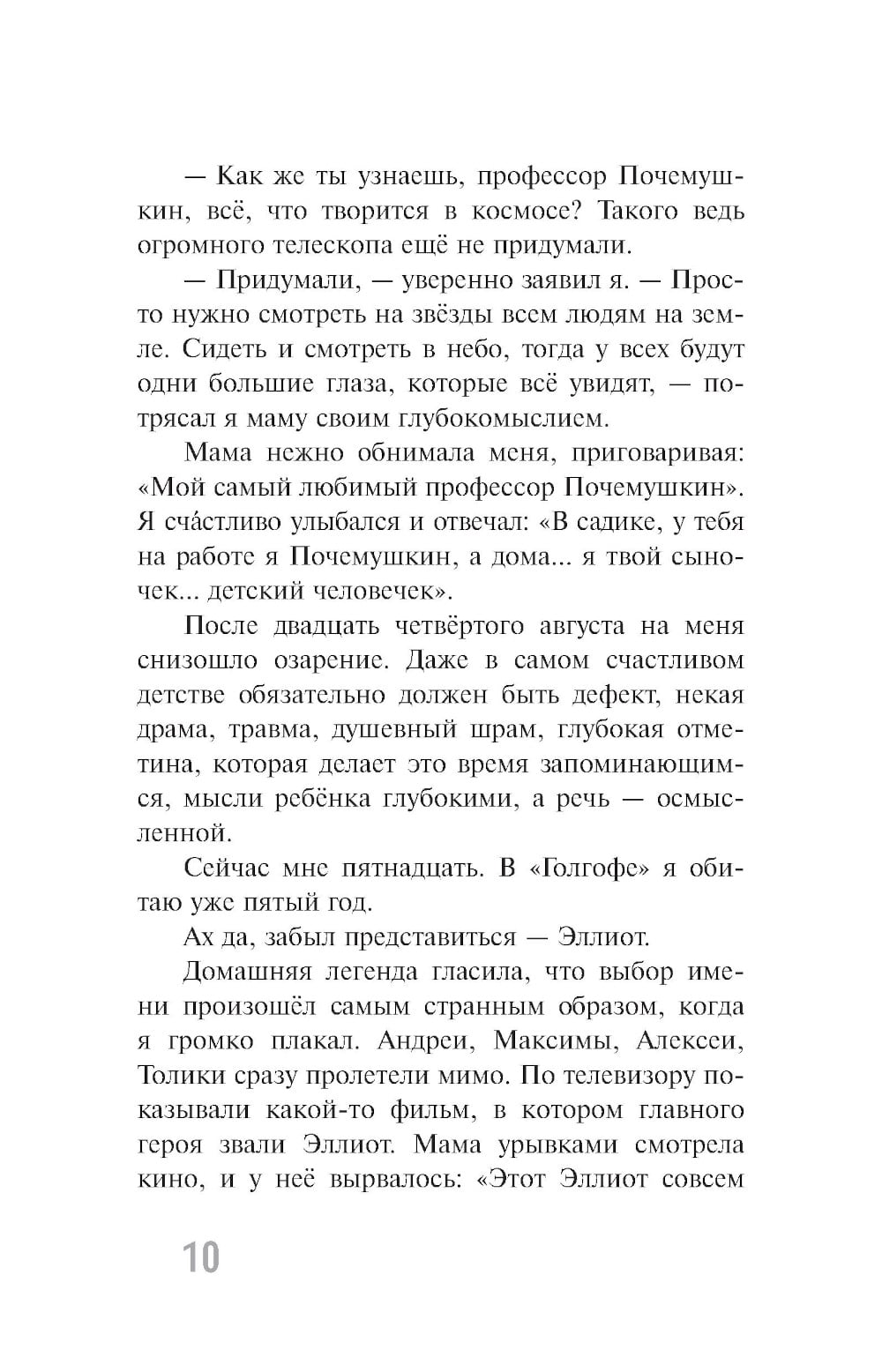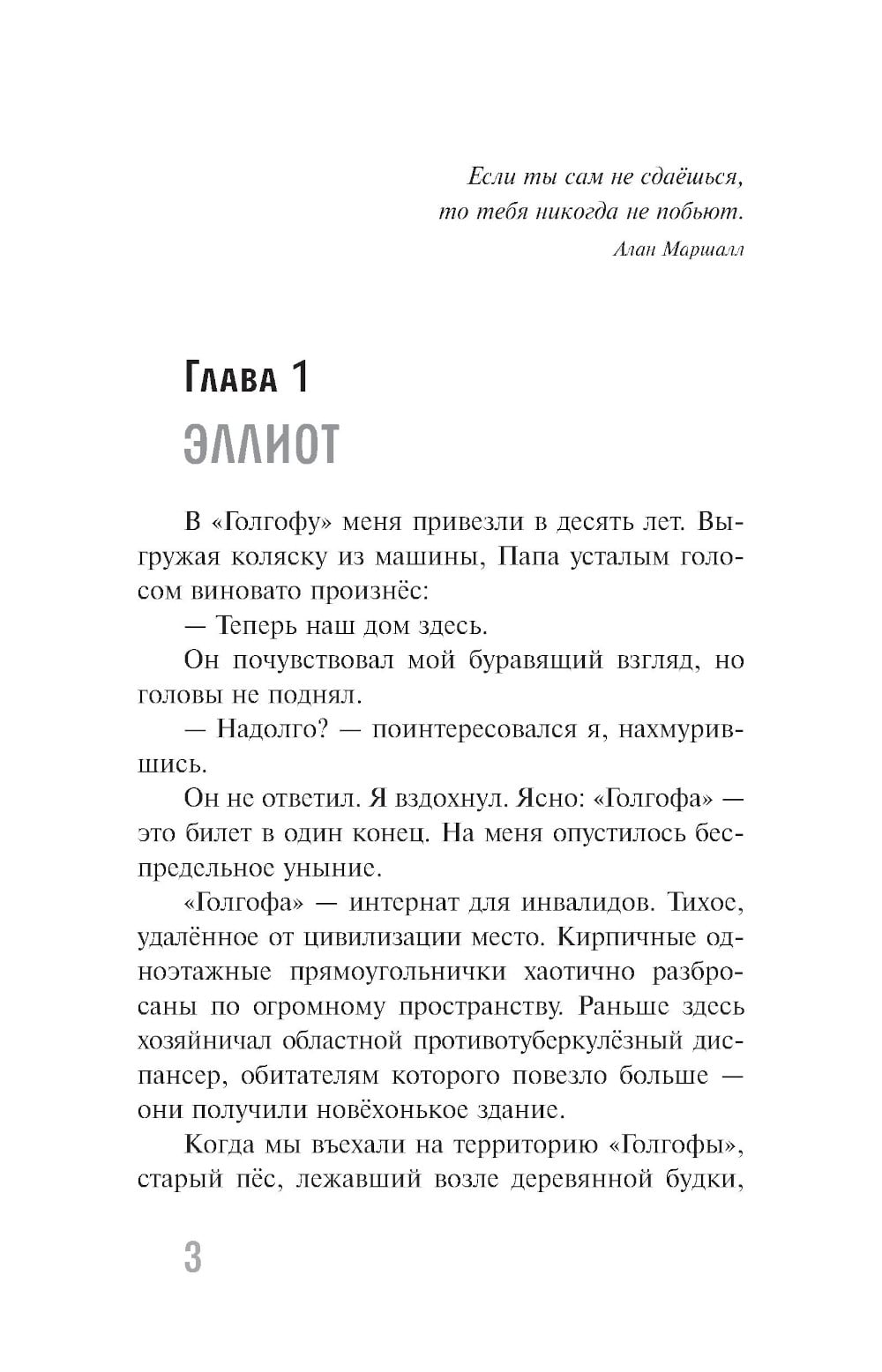 В интернате для детей с ограниченными возможностями здоровья, называемого его обитателями «Голгофой», проживает воспитанник-колясочник со странным именем Эллиот. Преодолеть жизненные невзгоды, одиночество, неуверенность в себе главному герою помогает дружба с одноклассником Микой. А неравнодушие к судьбе ученика учительницы литературы Матильды и директора «Голгофы», которого все воспитанники называют не иначе как Папа, вселяют в Эллиота уверенность, что без мечты и надежды жить нельзя.| Издательство | Аквилегия-М |