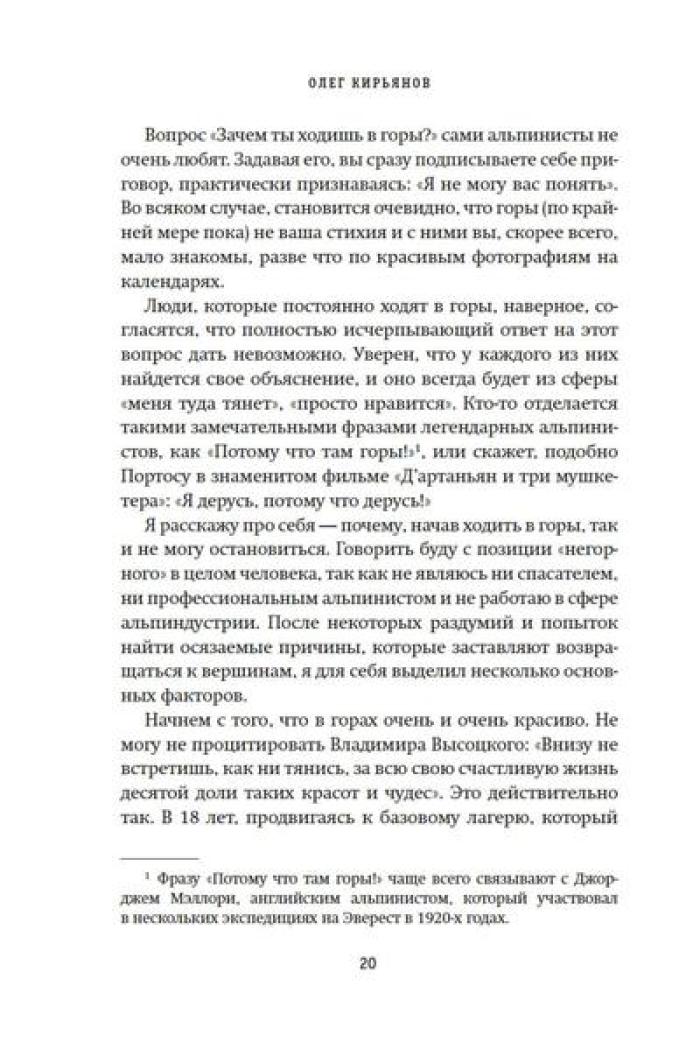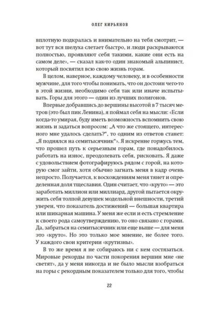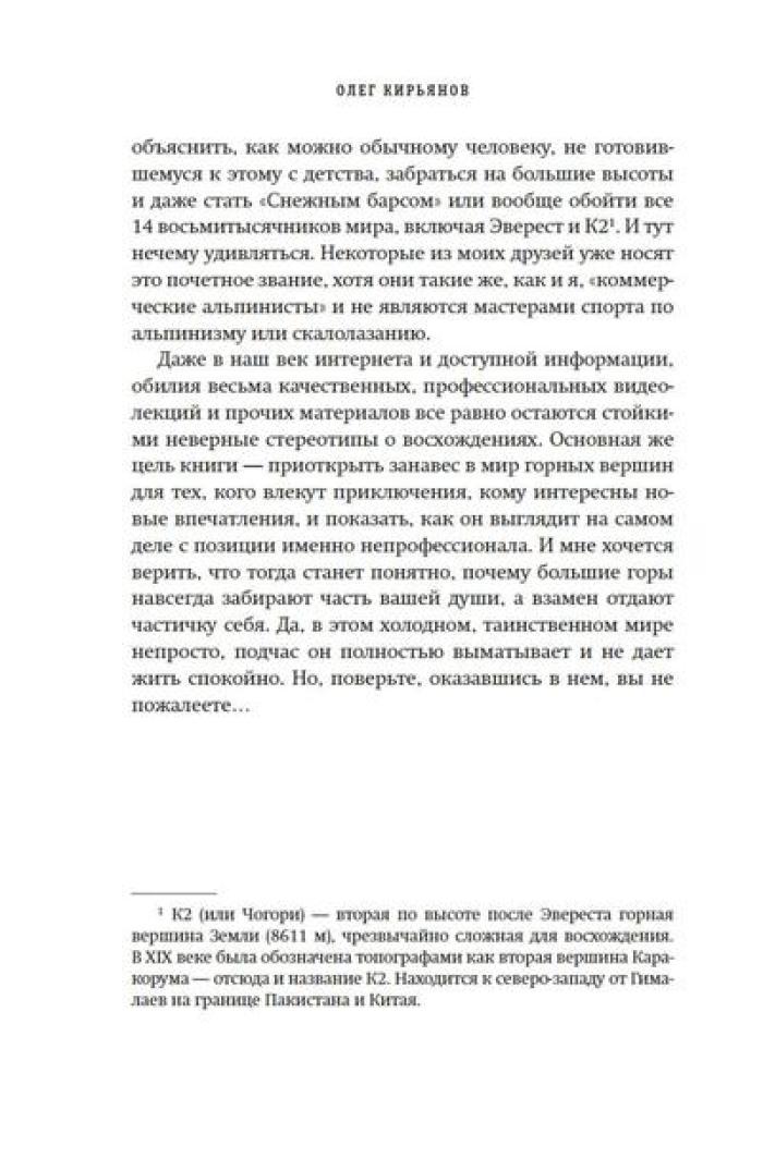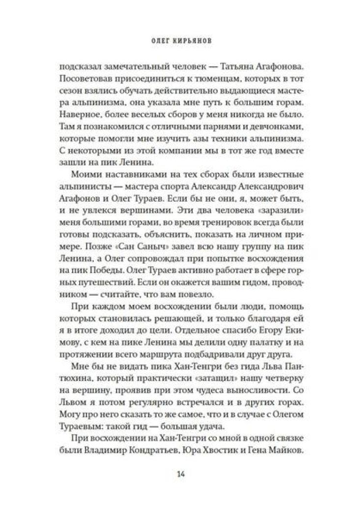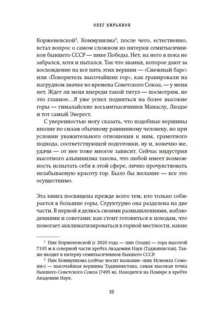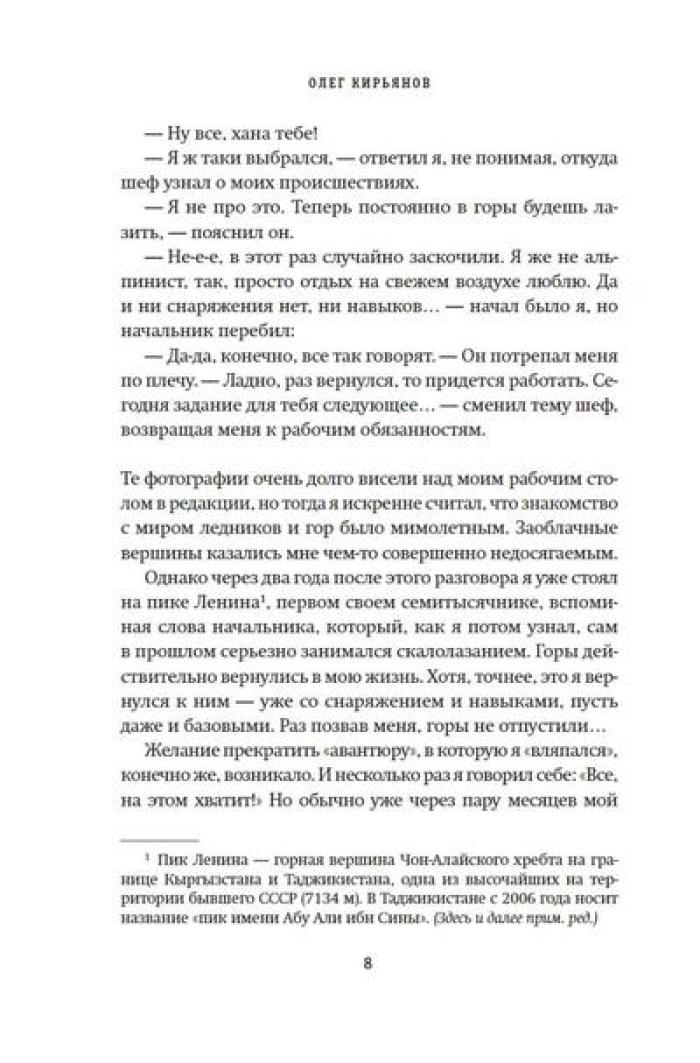 Олег Кирьянов - востоковед, журналист, специалист по Корейскому полуострову, где прожил и проработал более 20 лет. Но подлиная страсть Олега Кирьянова - горы. Его увлечение альпинизмом началось больше десяти лет назад, и за это время он успел покорить пик Коммунизма (Исмоила Сомони), пик Ленина (Абу Али Ибн Сины), пик Корженевской (Озоди), Хантенгри, Эверест, Лхоцзе, Манаслу, Ама-Даблам, Мера-пик и Лобуче. Вместе с автором вы подниметесь на все семитысячники бывшего СССР, переживете настоящую бурю на высоте 6000 метров, станете свидетелем спасательных операций, увидите опасные миражи и покорите новые вершины. А еще получите множество советов для начинающего альпиниста, ведь, кто знает, может, и вы тоже испытаете «горную зависимость».| Издательство | КоЛибри |