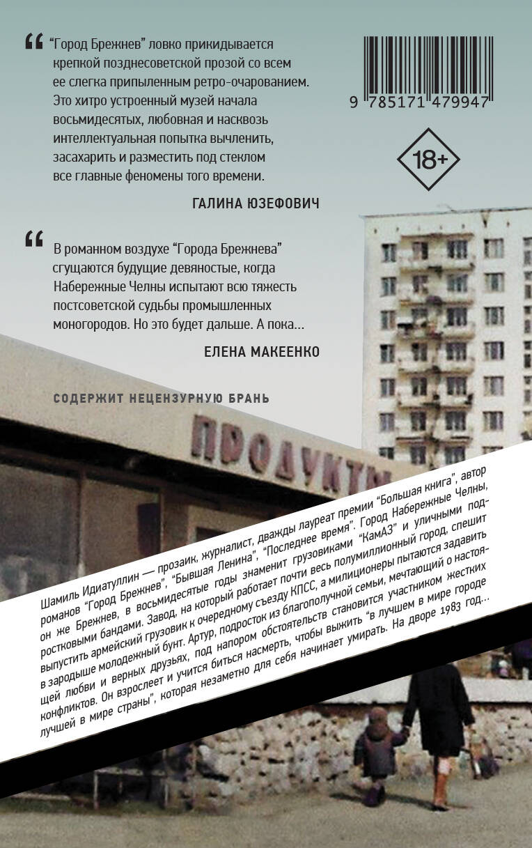 Роман двухкратного лауреата «Большой книги» Шамиля Идиатуллина «Город Брежнев» погружает читателя в невозвратимую эпоху «пышного увядания» Советского государства, во времена видеосалонов, дисковых телефонов и последних пионеров. На дворе 1983 год.  Сюжет романа разворачивается вокруг семьи из трёх человек: родителей и сына Артура, который, как и любой подросток, мечтает о настоящей любви и верных друзьях. Став участников серьёзного конфликта, парень учится выживать в стране, которая постепенно начинает умирать.  Автор вспоминает о по сей день саднящих ранах той эпохи: Афганистан, ксенофобия на государственном уровне, повсеместное насилие и начало конца советской эпохи.  Эта книга, будучи мозаикой из разных жанров, придётся по вкусу не только поколению 80-х, но и современным подросткам, которые, возможно, узнают себя в Артуре.