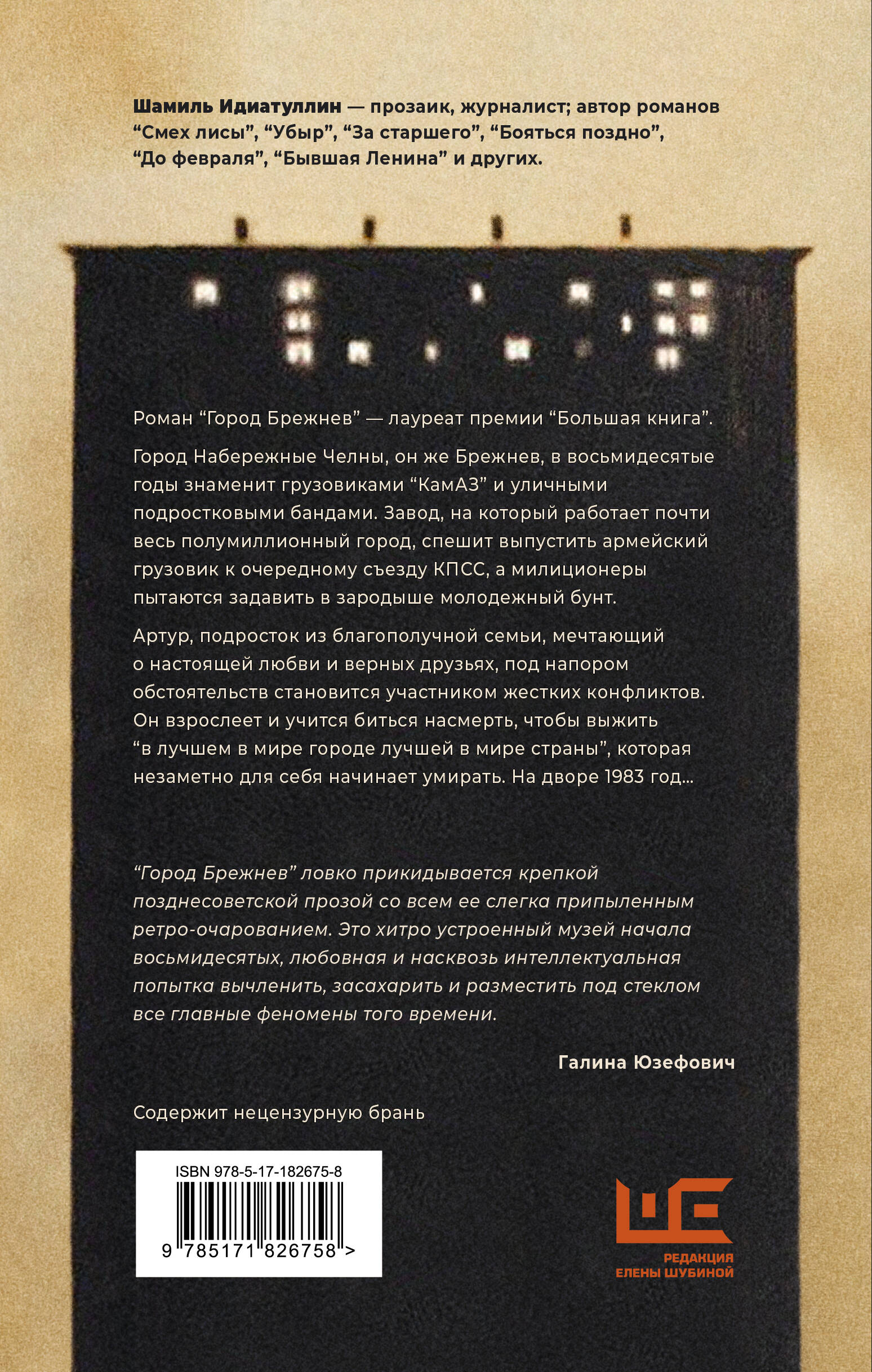 Шамиль Идиатуллин - прозаик, журналист, дважды лауреат премии "Большая книга", автор романов "Смех лисы", "Убыр", "До февраля", "За старшего", "Бывшая Ленина", "Последнее время" и другие. Город Набережные Челны, он же Брежнев, в восьмидесятые годы знаменит грузовиками "КамАЗ" и уличными подростковыми бандами. Завод, на который работает почти весь полумиллионный город, спешит выпустить армейский грузовик к очередному съезду КПСС, а милиционеры пытаются задавить в зародыше молодежный бунт. Артур, подросток из благополучной семьи, мечтающий о настоящей любви и верных друзьях, под напором обстоятельств становится участником жестких конфликтов. Он взрослеет и учится биться насмерть, чтобы выжить "в лучшем в мире городе лучшей в мире страны", которая незаметно для себя начинает умирать. На дворе 1983 год… В оформлении переплета использована картина Рината Волигамси "Район".| Издательство | Издательство "АСТ" |