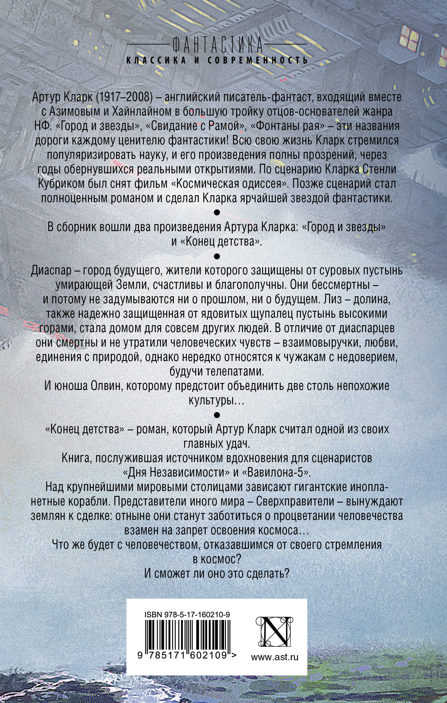 В сборник вошли два произведения Артура Кларка: "Город и звезды" и "Конец детства" Диаспар - город будущего, жители которого защищены от суровых пустынь умирающей Земли, счастливы и благополучны. Они бессмертны - и потому не задумываются ни о прошлом, ни о будущем. Лиз - долина, также надежно защищенная от ядовитых щупалец пустынь высокими горами, стала домом для совсем других людей. В отличие от диаспарцев они смертны, и не утратили человеческих чувств - взаимовыручки, любви, единения с природой, - однако нередко относятся к чужакам с недоверием, будучи телепатами. И юноша Олвин, которому предстоит объединить две столь непохожие культуры… "Конец детства" - роман, который Артур Кларк считал одной из своих главных удач. Книга, послужившая источником вдохновения для сценаристов "Дня Независимости" и "Вавилона-5". Над крупнейшими мировыми столицами зависают гигантские инопланетные корабли. Представители иного мира - Сверхправители - вынуждают землян к сделке: отныне они станут заботиться о процветании человечества взамен на запрет освоения космоса… Что же будет с человечеством, отказавшимся от своего стремления в Космос? И - сможет ли оно это сделать?| Издательство | Издательство "АСТ" |