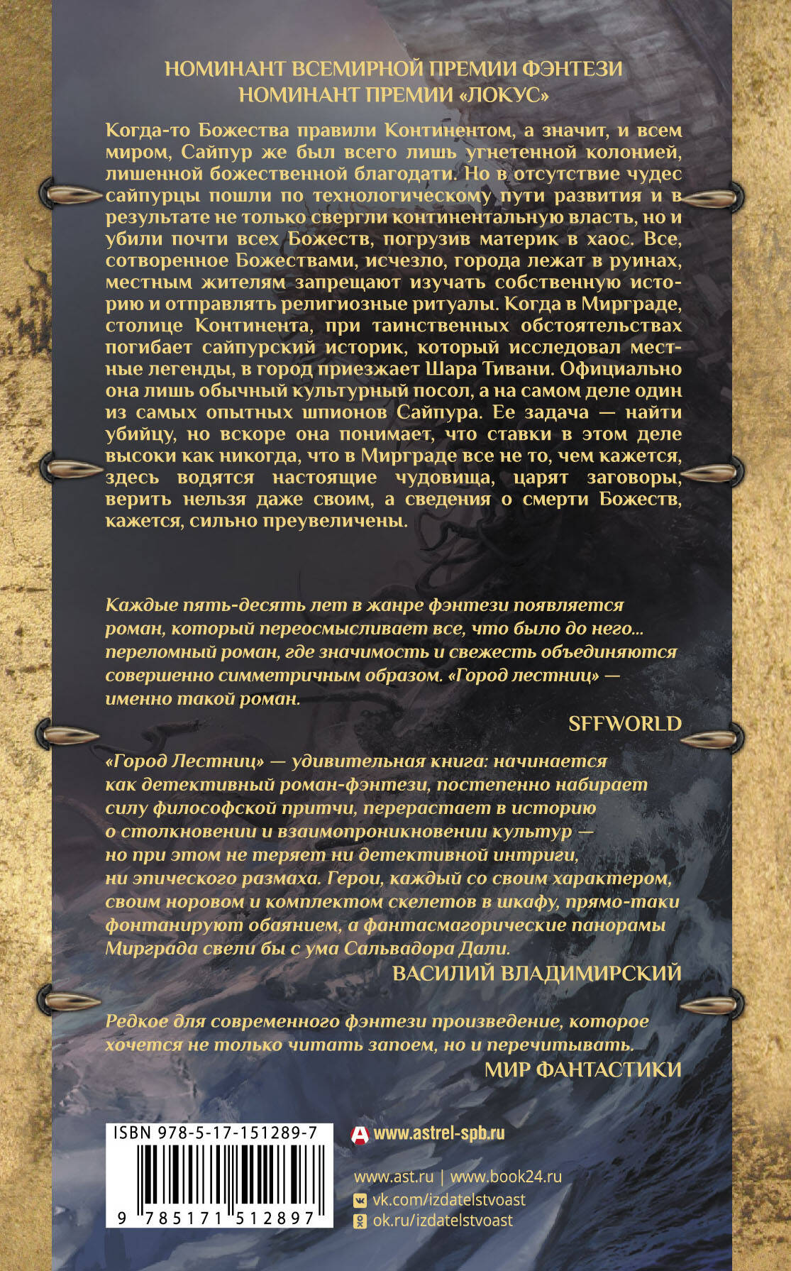 Когда-то Божества правили Континентом, а значит, и всем миром, Сайпур же был всего лишь угнетенной колонией, лишенной божественной благодати. Но в отсутствие чудес сайпурцы пошли по технологическому пути развития и в результате не только свергли континентальную власть, но и убили почти всех Божеств, погрузив материк в хаос. Все, сотворенное Божествами, исчезло, города лежат в руинах, местным жителям запрещают изучать собственную историю и отправлять религиозные ритуалы. Когда в Мирграде, столице Континента, при таинственных обстоятельствах погибает сайпурский историк, который исследовал местные легенды, в город приезжает Шара Тивани. Официально она лишь обычный культурный посол, а на самом деле один из самых опытных шпионов Сайпура. Ее задача - найти убийцу, но вскоре она понимает, что ставки в этом деле высоки как никогда, что в Мирграде все не то, чем кажется, здесь водятся настоящие чудовища, царят заговоры, верить нельзя даже своим, а сведения о смерти Божеств, кажется, сильно преувеличены.| Издательство | ИЗДАТЕЛЬСТВО "АСТ" |