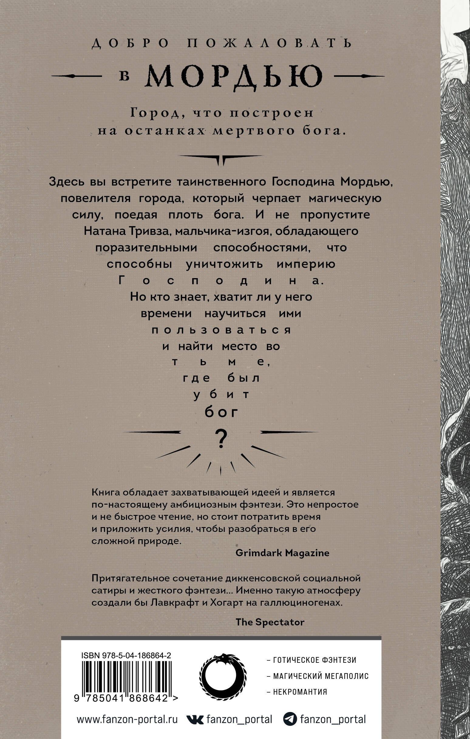 Номинация на премию «Локус» как лучший фэнтези-роман года. Номинация на Британскую премию фэнтези. Номинация на премию Grand Prix de L'Imaginaire. Номинация на премию Prix Jacques Chambon. Номинация на Republic of Consciousness Prize. Лучшее фэнтези года по версии Tor.com, The Guardian и Waterstones. Сочетание прозы Чарльза Диккенса, фантазии Чайны Мьевиля и атмосферы «Горменгаста» Мервина Пика. Бог мертв. Его труп спрятан в катакомбах под Мордью. В трущобах города, разрушаемого морем, со своими родителями влечет жалкое существование мальчик по имени Натан Тривз. Но однажды отчаявшаяся мать продает его таинственному Господину Мордью, который незримо правит городом. Господин получает свою магическую силу, питаясь останками бога. Однако у Натана, несмотря на его низкое происхождение и собственные страхи, тоже есть сила, которая превосходит все, что когда-либо знал или умел Господин. Сила достаточно велика, чтобы разрушить все, что он построил. Если только Натан узнает, как ее использовать. И вот Господин начинает плести интриги, и Натану придется столкнуться с предательством, раскрыть древние тайны и свести личные счеты странных обитателей города, чтобы прийти к месту, где был убит бог и царит вековечная тьма. «Притягательное сочетание диккенсовской социальной сатиры и жесткого фэнтези с элементами стимпанка. Написано с огоньком… Именно такую атмосферу создали бы Лавкрафт и Хогарт на мескалине». - The Spectator «Прекрасно написано… Захватывающая, напряженная, насыщенная действиями книга». - Irish Times «Странный и удивительный, мрачный и прекрасный роман… Это необычайно яркое произведение о создании мира». - Sunday Express «Подумайте о "Больших надеждах" и "Горменгасте" с концовкой, которая намекает на интересное продолжение». - Literary Review «Необыкновенно, экстравагантно и пугающе». - The Guardian «Этот роман… О боже, этот роман. Он потрясающий!» - Interzone «Книга обладает захватывающей идеей и является по-настоящему амбициозным фэнтези. Это не простое и не быстрое чтение, но стоит потратить время и приложить усилия, чтобы разобраться в его сложной природе». - Grimdark Magazine «Это мрачная восхитительная история о восхождении мальчика к величию с сильным привкусом Мервина Пика и нотками Майкла Муркока». - The Guardian «Будущее фэнтези начинается здесь». - Марлон Джеймс| Издательство | ООО "Издательство "Эксмо" |