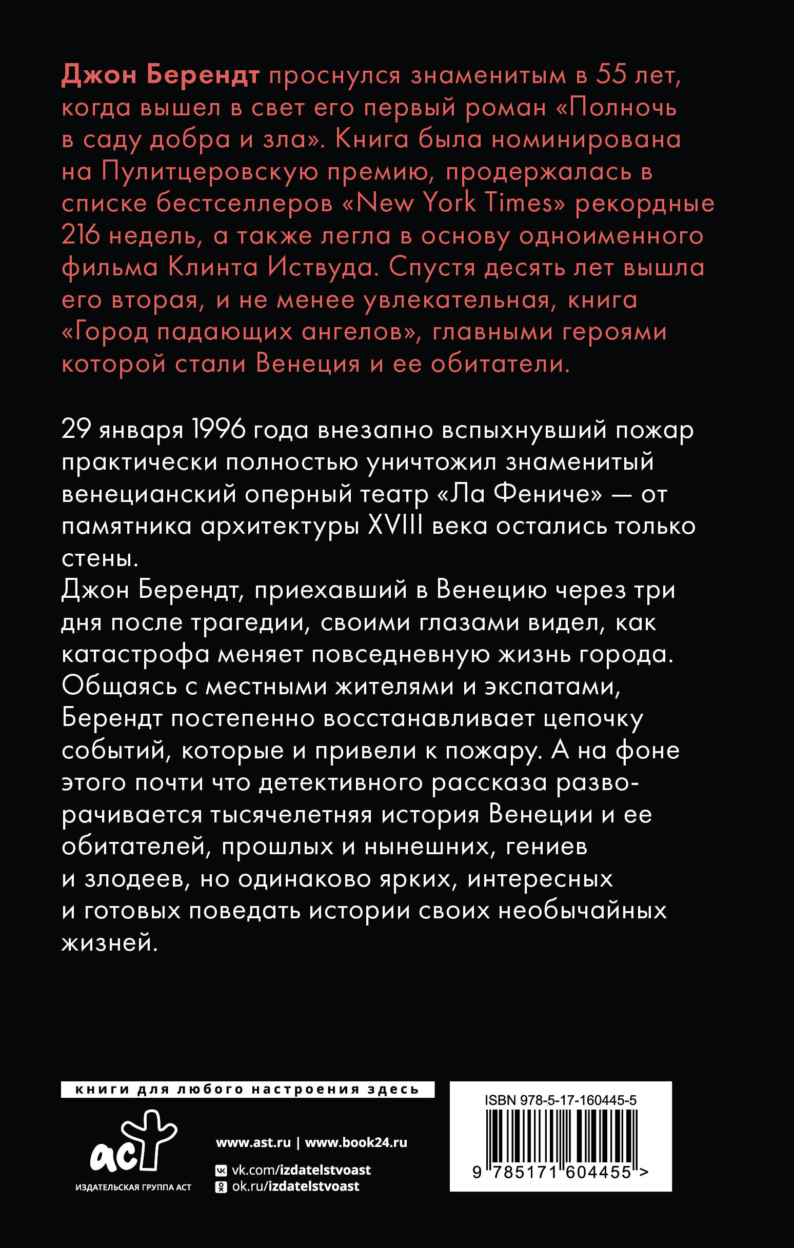 29 января 1996 года внезапно вспыхнувший пожар практически полностью уничтожил знаменитый венецианский оперный театр "Ла Фениче" - от памятника архитектуры XVIII века остались только стены. Джон Берендт, приехавший в Венецию через три дня после трагедии, своими глазами видел, как катастрофа меняет повседневную жизнь города. Общаясь с местными жителями и экспатами, Берендт постепенно восстанавливает цепочку событий, которые и привели к пожару. А на фоне этого почти что детективного рассказа разворачивается тысячелетняя история Венеции и ее обитателей, прошлых и нынешних, гениев и злодеев, но одинаково ярких, интересных и готовых поведать истории своих необычайных жизней.