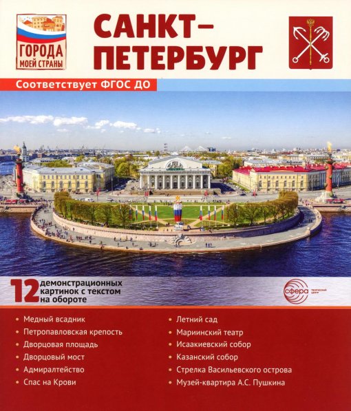Комплект демонстрационных картинок «Санкт-Петербург» расскажет ребенку об истории Северной столицы, познакомит с ее знаменитыми памятниками, культурными объектами и архитектурными шедеврами. Каждая карточка содержит картинку с изображением той или иной достопримечательности и текст, который поможет взрослому составить увлекательный и доступный рассказ, выстроить беседу с ребенком. Такие карточки воспитают в детях интерес к истории нашей Родины и подойдут как для индивидуальной, так и для групповой работы. Список демонстрационных картинок: • Медный всадник • Петропавловская крепость • Дворцовая площадь • Дворцовый мост • Адмиралтейство • Спас на Крови • Летний сад • Мариинский театр • Исаакиевский собор • Казанский собор • Стрелка Васильевского острова • Музей-квартира А.С. Пушкина| Издательство | М.: ТЦ СФЕРА |