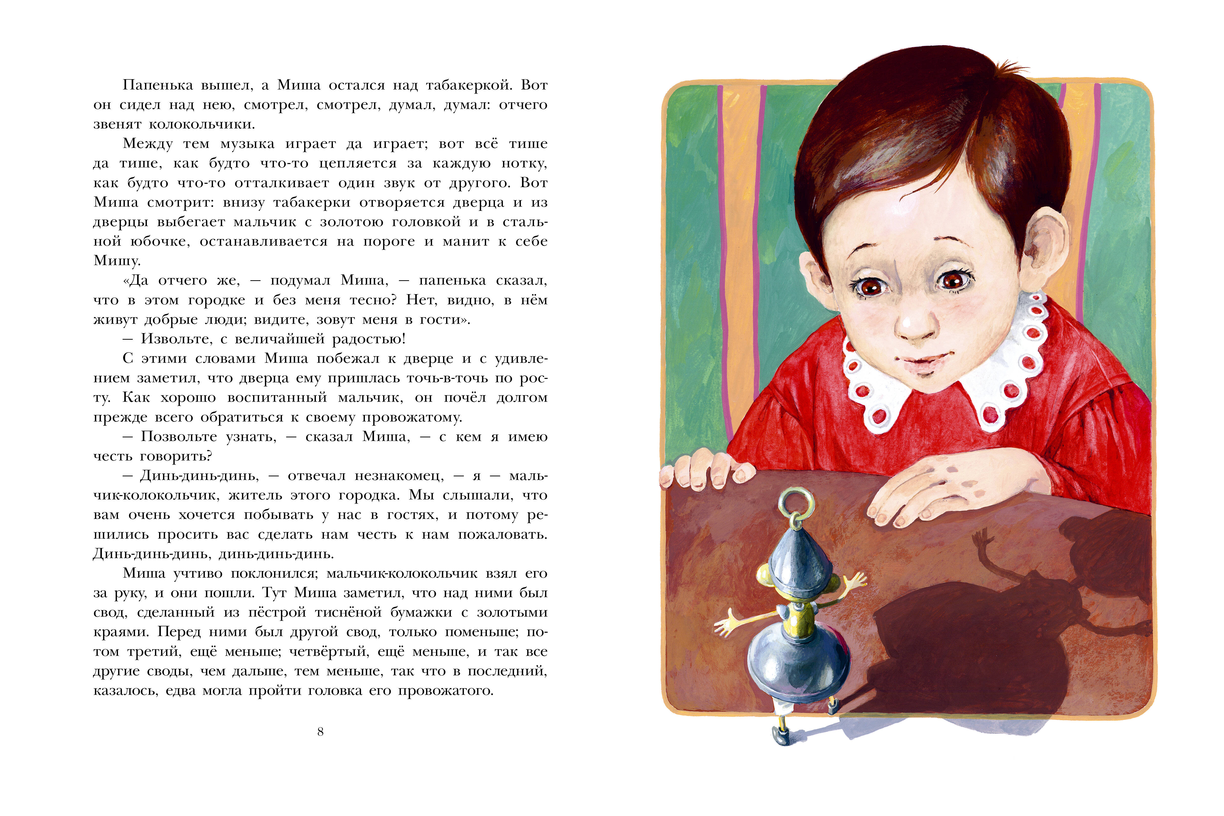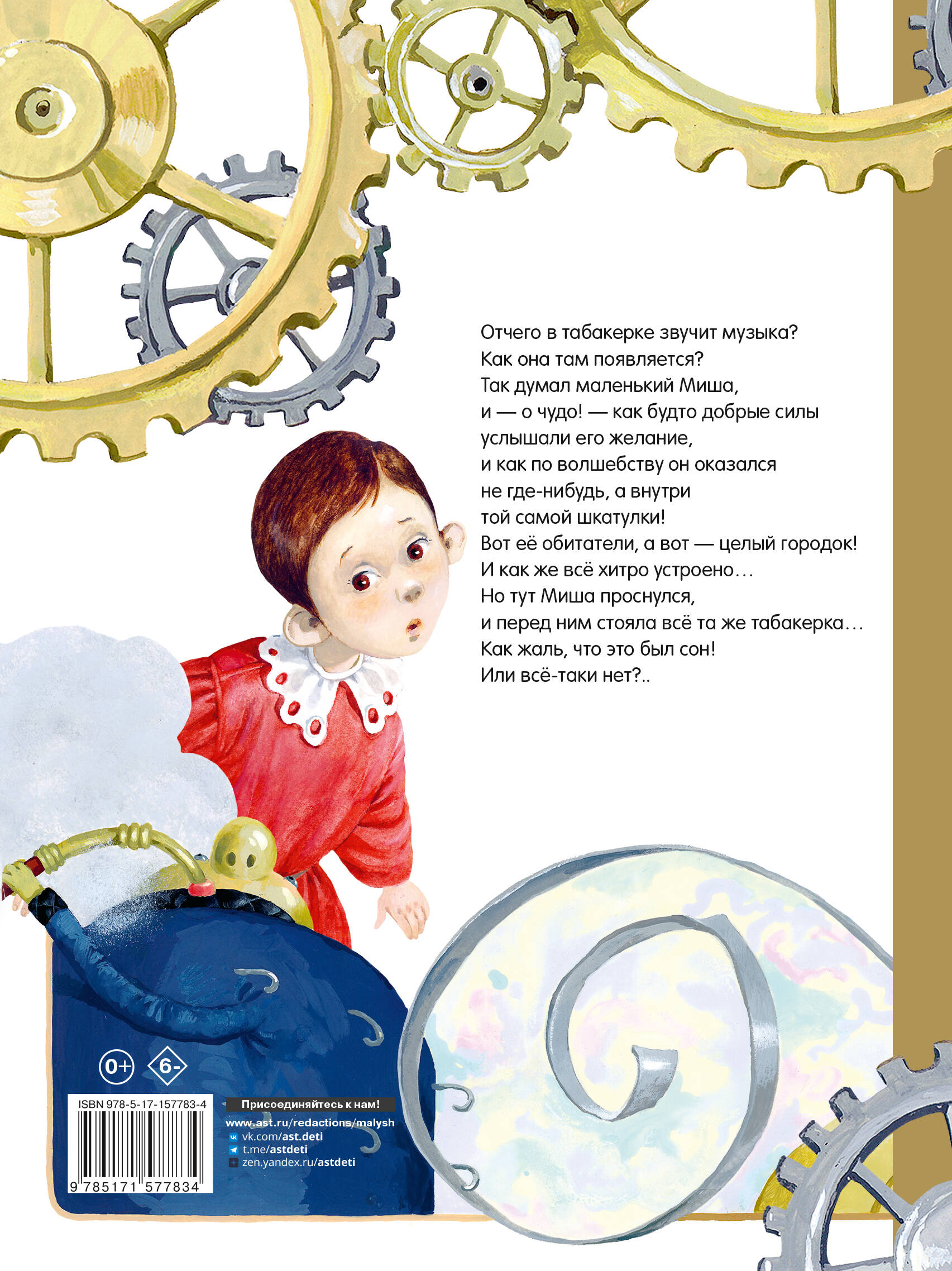 Отчего в табакерке звучит музыка? Как она там появляется? Так думал маленький Миша, и - о чудо! - как будто добрые силы услышали его желание, и как по волшебству он оказался не где-нибудь, а внутри той самой шкатулки! Вот её обитатели, а вот - целый городок! И как же всё хитро устроено… Но тут Миша проснулся, и перед ним стояла всё та же табакерка… Как жаль, что это был сон! Или всё-таки нет?..