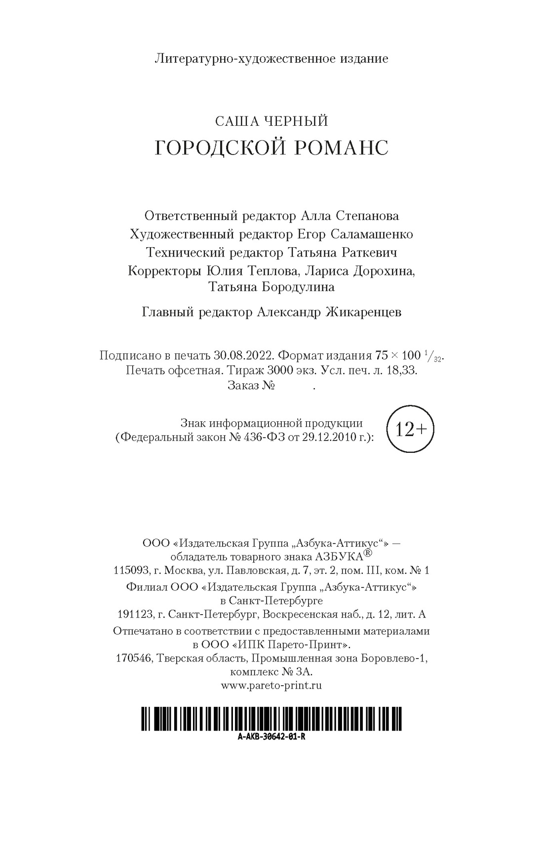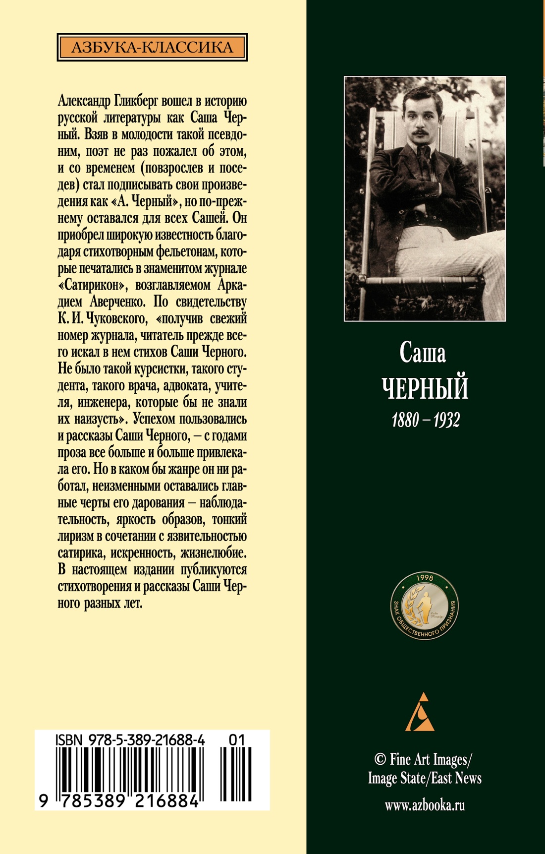 Александр Гликберг вошел в историю русской литературы как Саша Черный. Взяв в молодости такой псевдоним, поэт не раз пожалел об этом, и со временем (повзрослев и поседев) стал подписывать свои произведения как «А. Черный», но по-прежнему оставался для всех Сашей. Он приобрел широкую известность благодаря стихотворным фельетонам, которые печатались в знаменитом журнале «Сатирикон», возглавляемом Аркадием Аверченко. По свидетельству К. И. Чуковского, «получив свежий номер журнала, читатель прежде всего искал в нем стихов Саши Черного. Не было такой курсистки, такого студента, такого врача, адвоката, учителя, инженера, которые бы не знали их наизусть». Успехом пользовались и рассказы Саши Черного, - с годами проза все больше и больше привлекала его. Но в каком бы жанре он ни работал, неизменными оставались главные черты его дарования - наблюдательность, яркость образов, тонкий лиризм в сочетании с язвительностью сатирика, искренность, жизнелюбие. В настоящем издании публикуются стихотворения и рассказы Саши Черного разных лет.