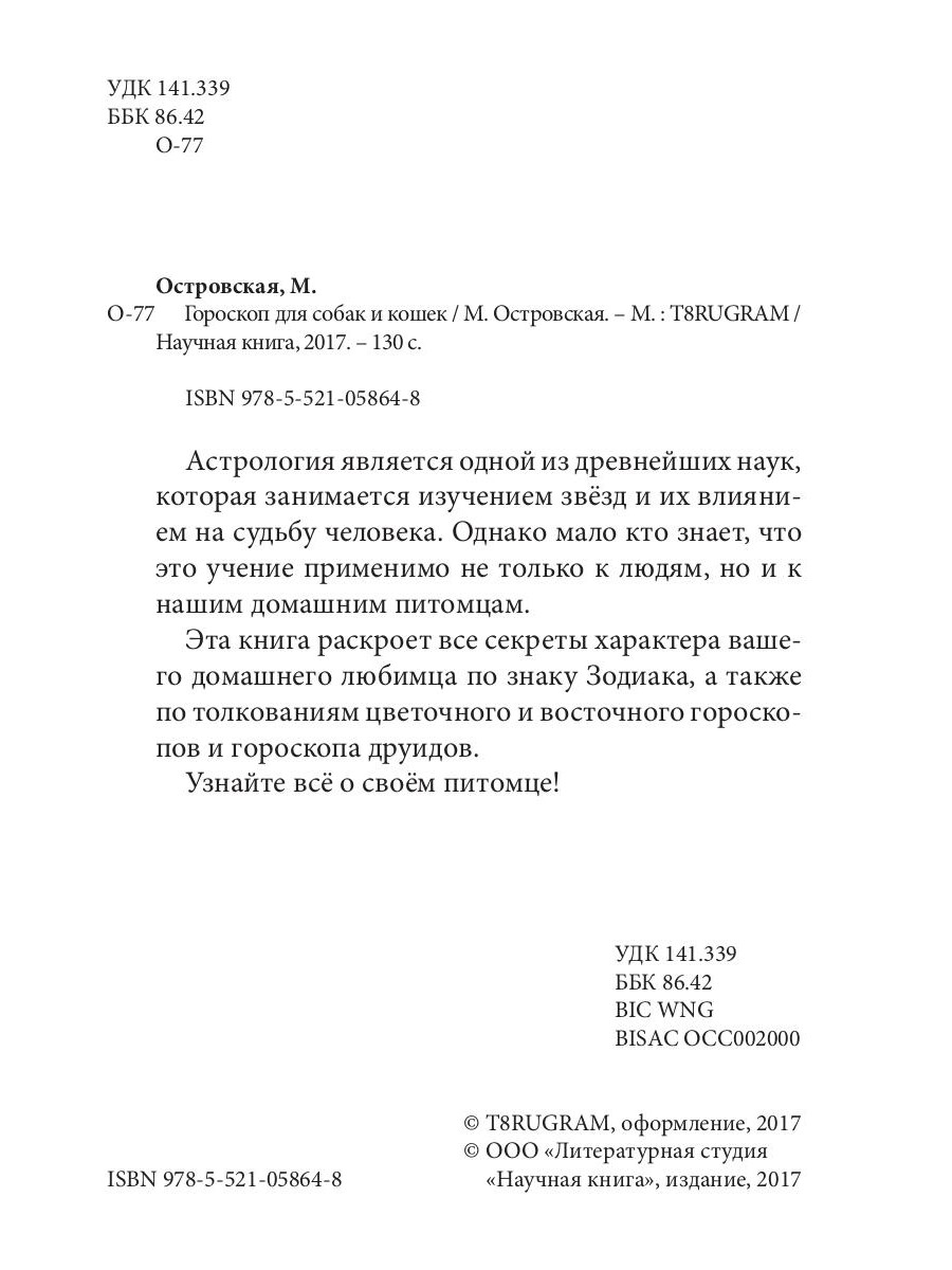 Астрология является одной из древнейших наук, которая занимается изучением звёзд и их влиянием на судьбу человека. Однако мало кто знает, что это учение применимо не только к людям, но и к нашим домашним питомцам. Эта книга раскроет все секреты характера вашего домашнего любимца по знаку Зодиака, а также по толкованиям цветочного и восточного гороскопов и гороскопа друидов. Узнайте всё о своём питомце!