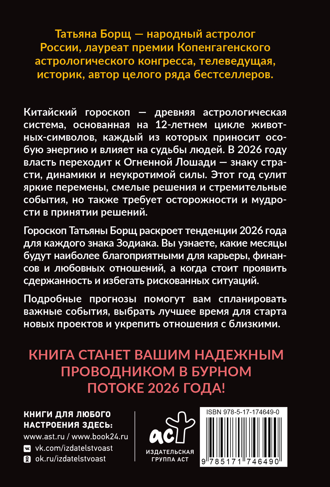 Татьяна Борщ - народный астролог России, лауреат премии Копенгагенского астрологического конгресса, телеведущая, историк, автор целого ряда бестселлеров. Китайский гороскоп - древняя астрологическая система, основанная на 12-летнем цикле живот-ных-символов, каждый из которых приносит осо¬бую энергию и влияет на судьбы людей. В 2026 году власть переходит к Огненной Лошади - знаку стра¬сти, динамики и неукротимой силы. Этот год сулит яркие перемены, смелые решения и стремительные события, но также требует осторожности и мудро¬сти в принятии решений. Гороскоп Татьяны Борщ раскроет тенденции 2026 года для каждого знака Зодиака. Вы узнаете, какие месяцы будут наиболее благоприятными для карьеры, финан¬сов и любовных отношений, а когда стоит проявить сдержанность и избегать рискованных ситуаций. Подробные прогнозы помогут вам спланировать важные события, выбрать лучшее время для старта новых проектов и укрепить отношения с близкими.| Издательство | Издательство "АСТ" |