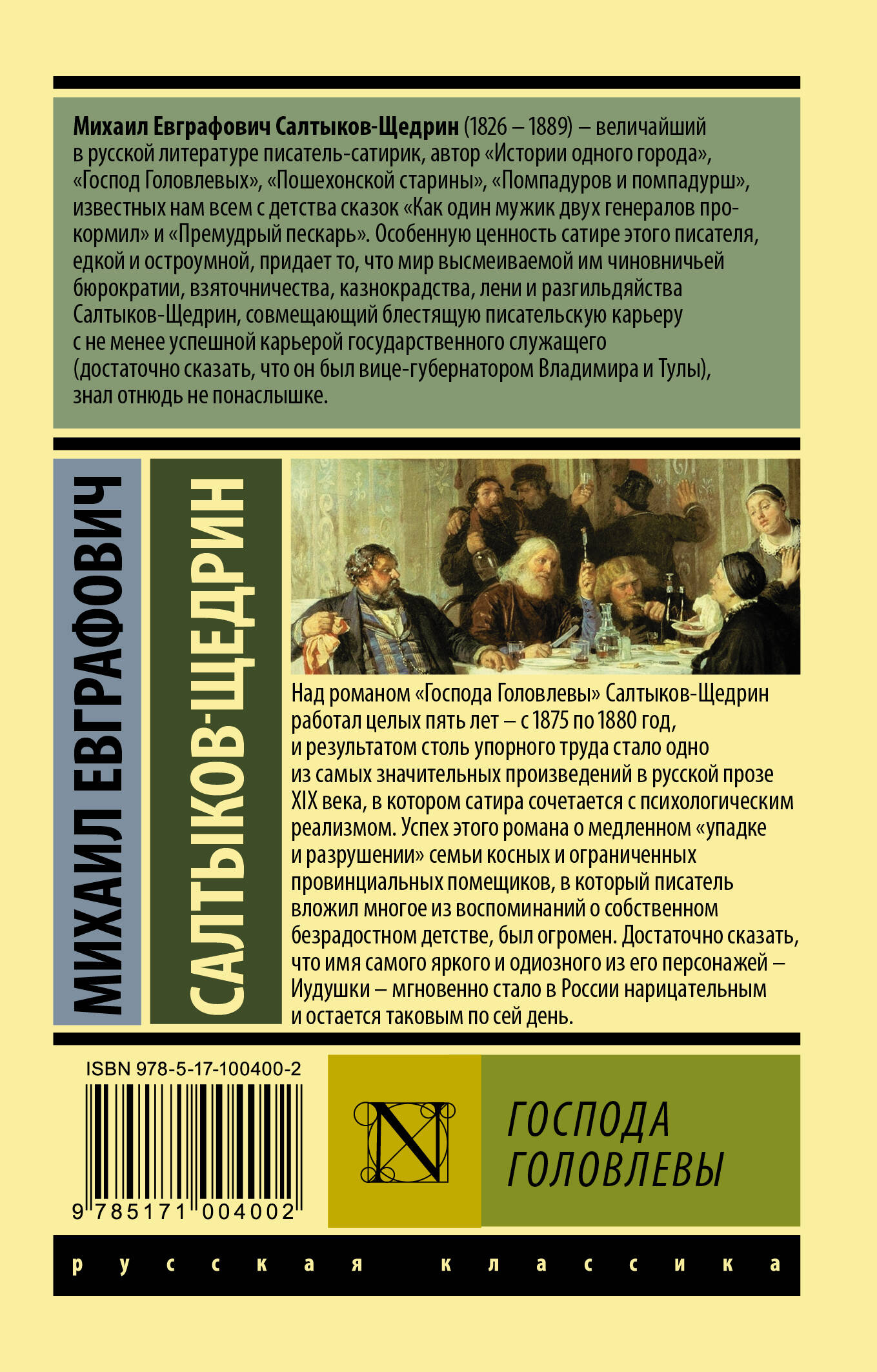Над романом "Господа Головлевы" Салтыков-Щедрин работал целых пять лет - с 1875 по 1880 год, и результатом столь упорного труда стало одно из самых значительных произведений в русской прозе XIX века, в котором сатира сочетается с психологическим реализмом. Успех этого романа о медленном "упадке и разрушении" семьи косных и ограниченных провинциальных помещиков, в который писатель вложил многое из воспоминаний о собственном безрадостном детстве, был огромен. Достаточно сказать, что имя самого яркого и одиозного из его персонажей Иудушки - мгновенно стало в России нарицательным и остается таковым по сей день.| Издательство | Издательство "АСТ" |