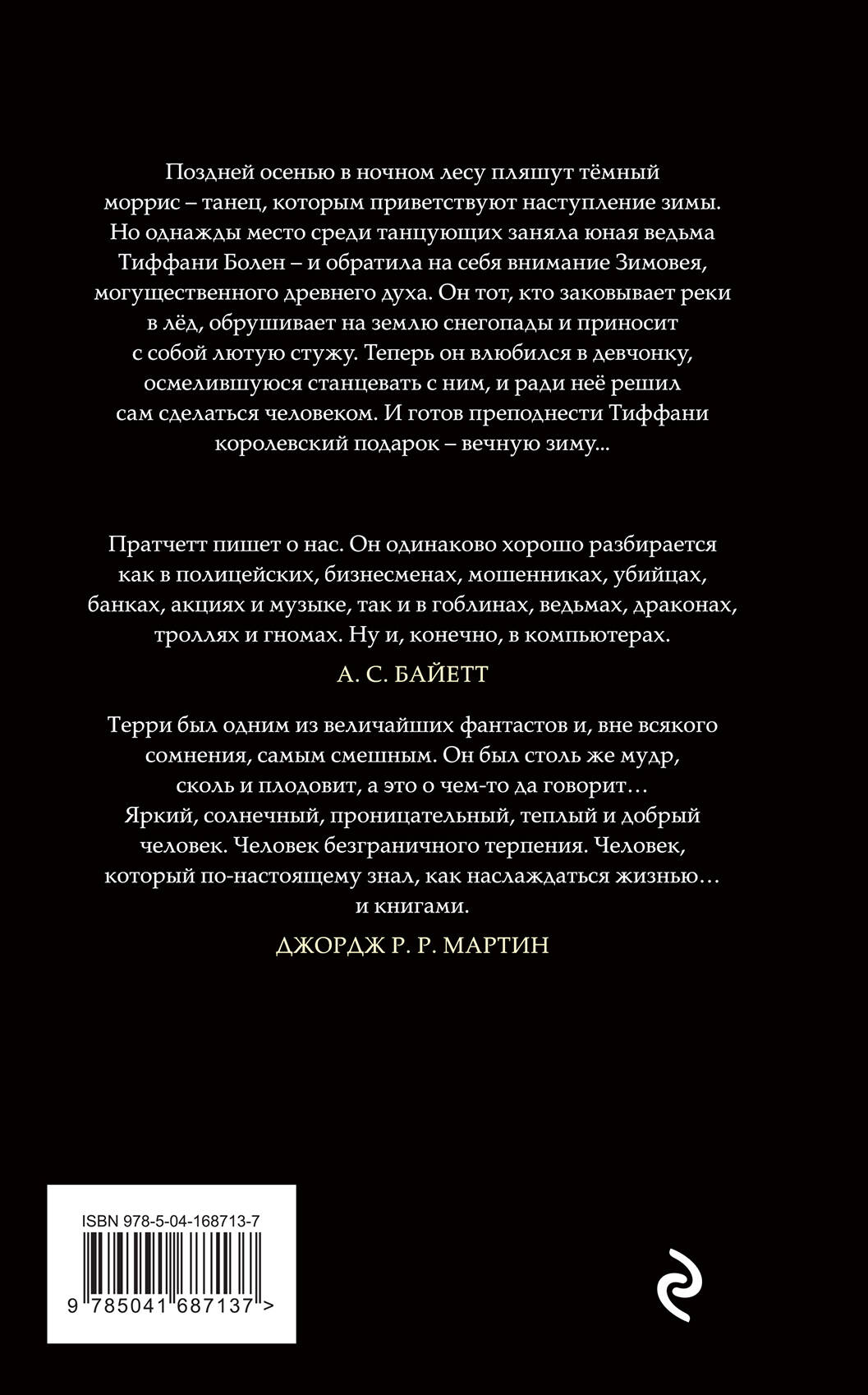 Поздней осенью в ночном лесу пляшут тёмный моррис: танец, которым приветствуют наступление зимы. Но однажды место среди танцующих заняла юная ведьма Тиффани Болен - и обратила на себя внимание Зимовея, могущественного древнего духа. Он тот, кто заковывает реки в лёд, обрушивает на землю снегопады и приносит с собой лютую стужу. Теперь он влюбился в девчонку, осмелившуюся станцевать с ним, и ради неё решил сам сделаться человеком. И готов преподнести Тиффани королевский подарок: вечную зиму... Третья книга о приключениях юной ведьмы Тиффани Болен.| Издательство | ООО "Издательство "Эксмо" |