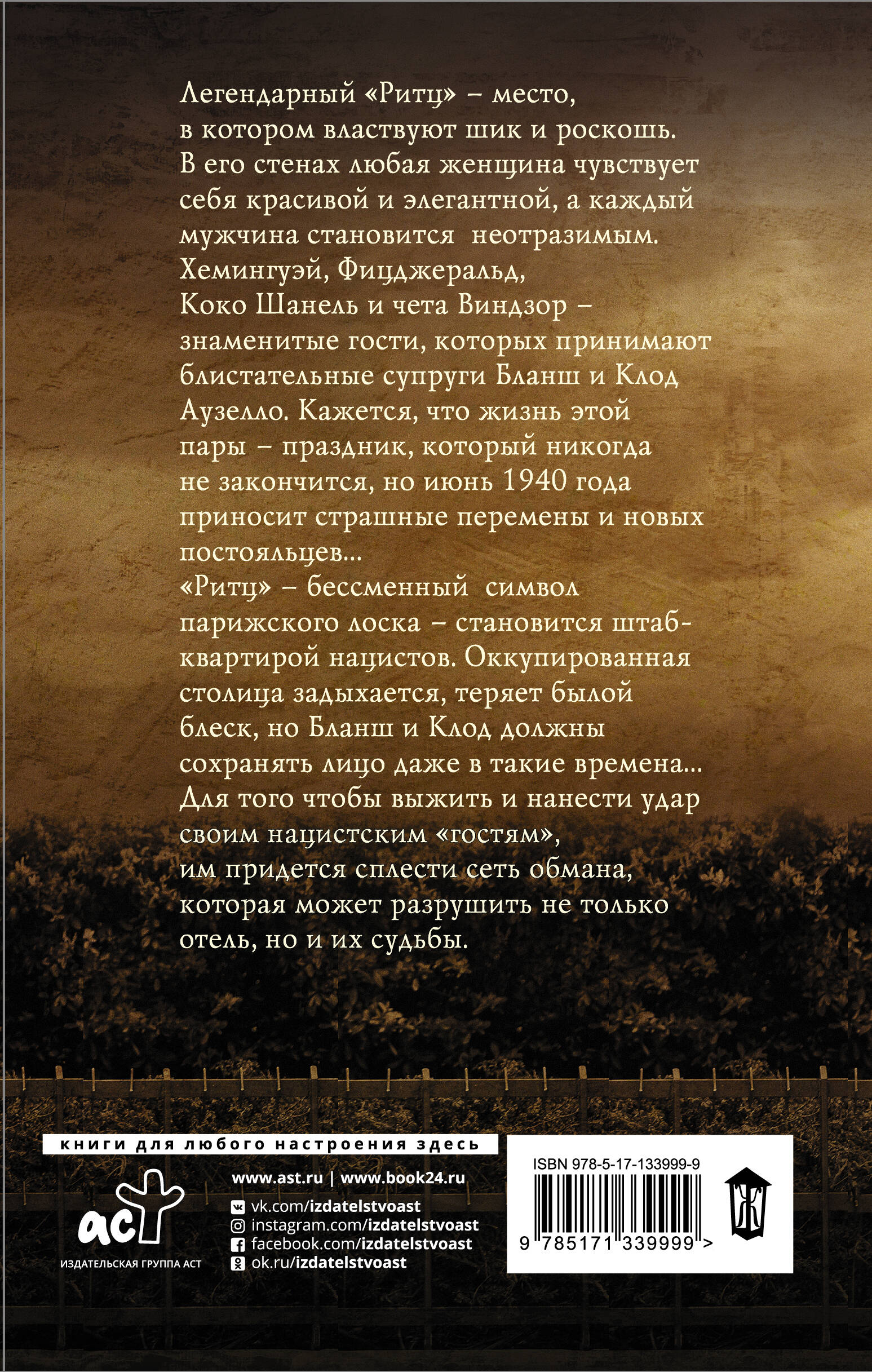 • Новый роман от автора бестселлера New York Times «Жена авиатора». • Книга основана на реальных событиях. • История о самой таинственной и эксцентричной паре Парижа времен Второй мировой. Отель «Ритц» - символ изысканного Парижа, где Хемингуэя, Фицджеральда, Шанель всегда ждал теплый прием управляющих отеля - Бланш и Клода Аузелло. Именно они создавали неповторимую атмосферу самого богемного места. Однако приходят 40-е, и на город опускается пороховое облако войны. Париж теряет былой блеск и увядает под гнетом нацистов. Свобода, некогда царившая в «Ритце», исчезает, но даже в такие времена пара Аузелло держится на высоте. Чтобы помочь Сопротивлению и «выселить» новых гостей из Парижа, Бланш и Клоду приходится надевать маски коллаборационистов и плести сети хитрого обмана. Интриги, пугливый шепот и тайны воцаряются в стенах «Ритца». Но это смелое решение может разрушить не только отель, но и их жизни...| Издательство | ИЗДАТЕЛЬСТВО "АСТ" |