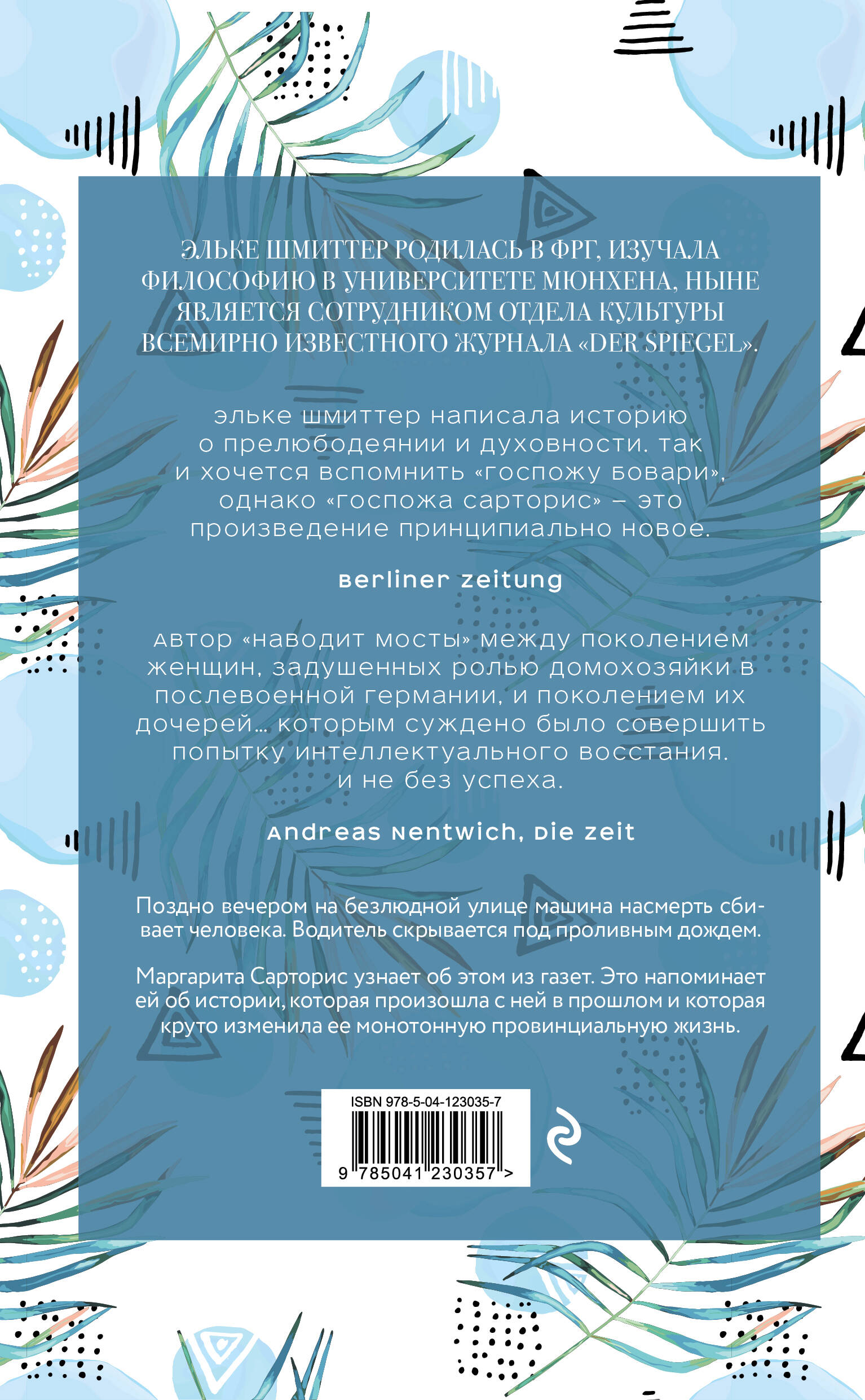 Роман «Госпожа Сарторис» переведен более чем на 20 языков и вошел в Топ-100 немецких книг ХХ века. Поздно вечером на безлюдной улице машина насмерть сбивает человека. Водитель скрывается под проливным дождем. Маргарита Сарторис узнает об этом из газет. Это напоминает ей об истории, которая произошла с ней в прошлом и которая круто изменила ее монотонную провинциальную жизнь. «Эльке Шмиттер написала историю о прелюбодеянии и духовности. Так и хочется вспомнить "Госпожу Бовари", однако "Госпожа Сарторис" - это произведение принципиально новое». - Berliner Zeitung «Автор "наводит мосты" между поколением женщин, задушенных ролью домохозяйки в послевоенной Германии, и поколением их дочерей… которым суждено было совершить попытку интеллектуального восстания. И не без успеха». - Andreas Nentwich, Die Zeit| Издательство | ООО "Издательство "Эксмо" |