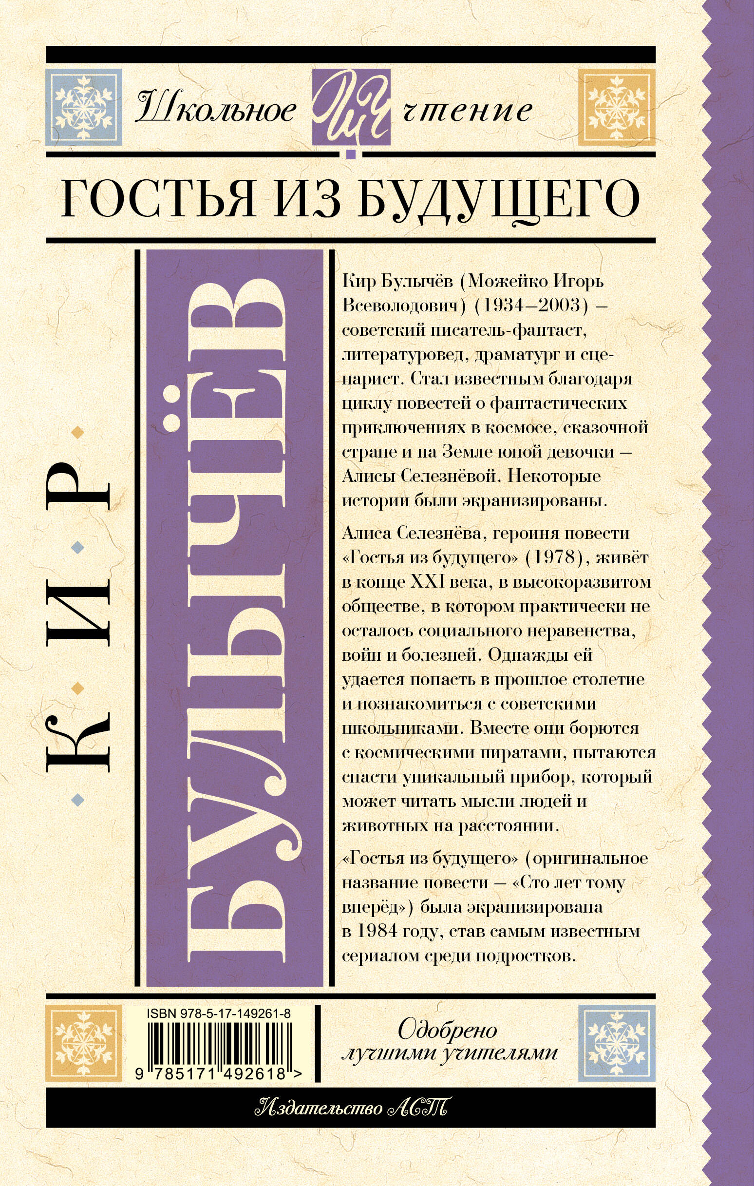 Кир Булычёв (Можейко Игорь Всеволодович) (1934-2003) - советский писатель-фантаст, литературовед, драматург и сце¬нарист. Стал известным благодаря циклу повестей о фантастических приключениях в космосе, сказочной стране и на Земле юной девочки - Алисы Селезнёвой. Некоторые истории были экранизированы. Алиса Селезнёва, героиня повести "Гостья из будущего" (1978), живёт в конце XXI века, в высокоразвитом обществе, в котором практически не осталось социального неравенства, войн и болезней. Однажды ей удается попасть в прошлое столетие и познакомиться с советскими школьниками. Вместе они борются с космическими пиратами, пытаются спасти уникальный прибор, который может читать мысли людей и животных на расстоянии. "Гостья из будущего" (оригинальное название повести - "Сто лет тому вперёд") была экранизирована в 1984 год, став самым известным сериалом среди подростков.| Издательство | АСТ |