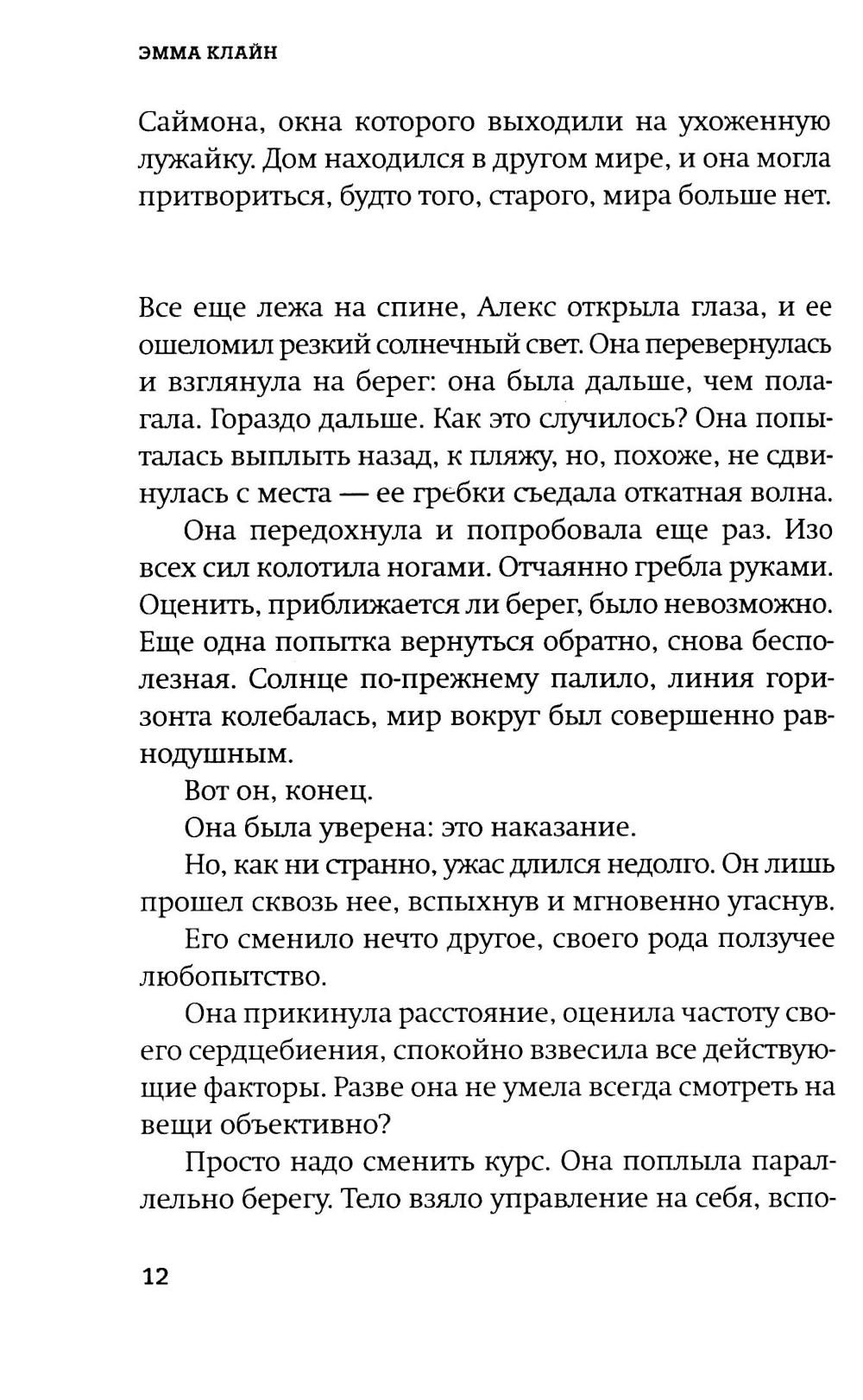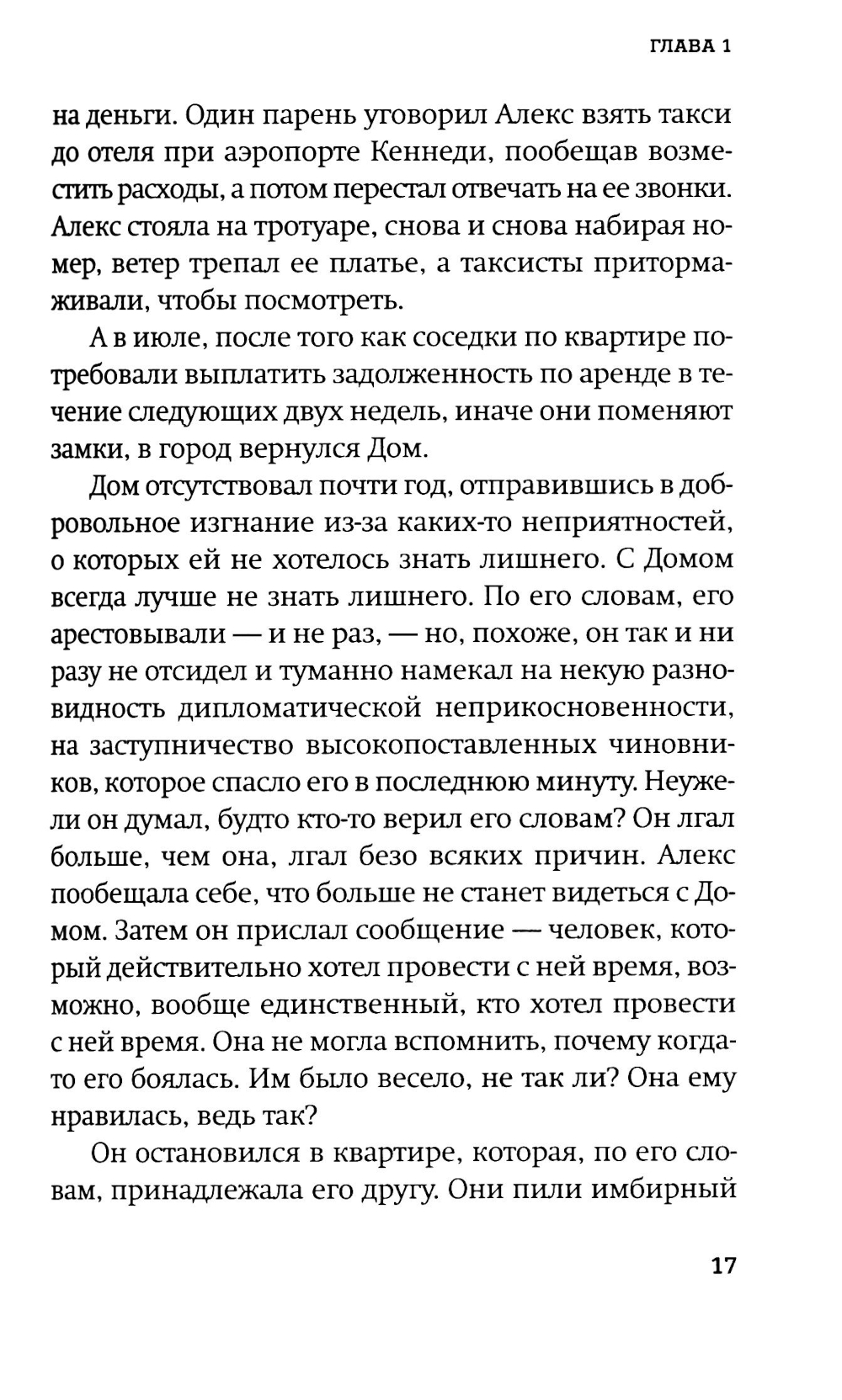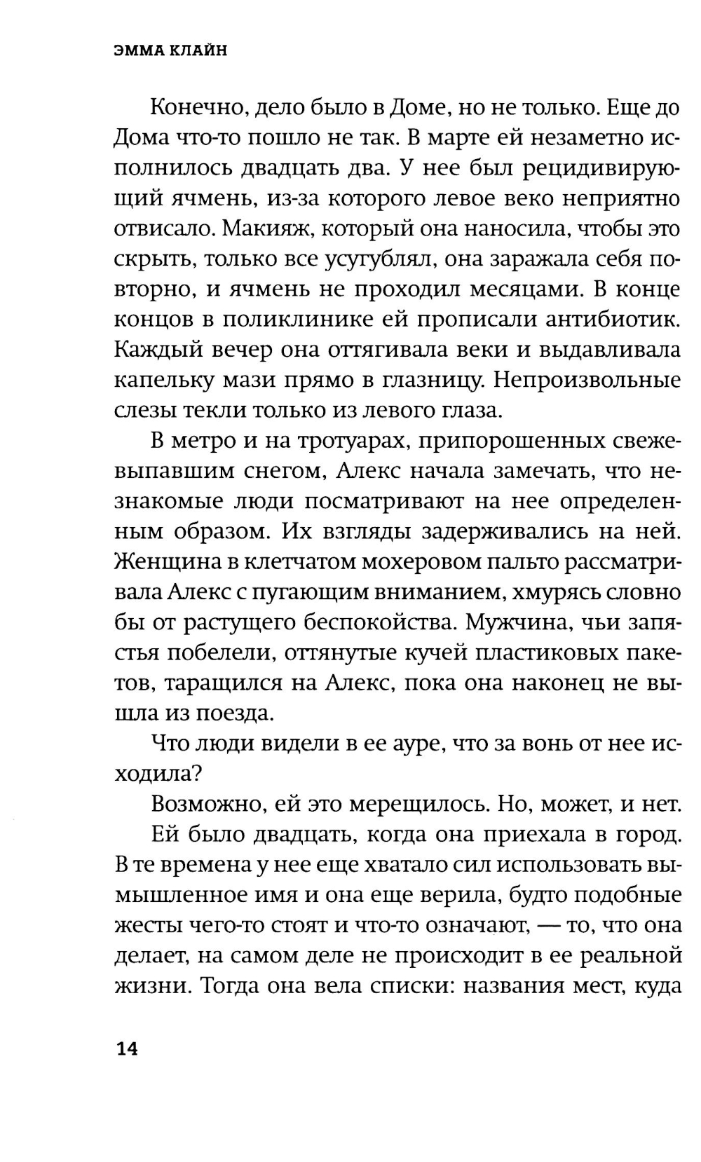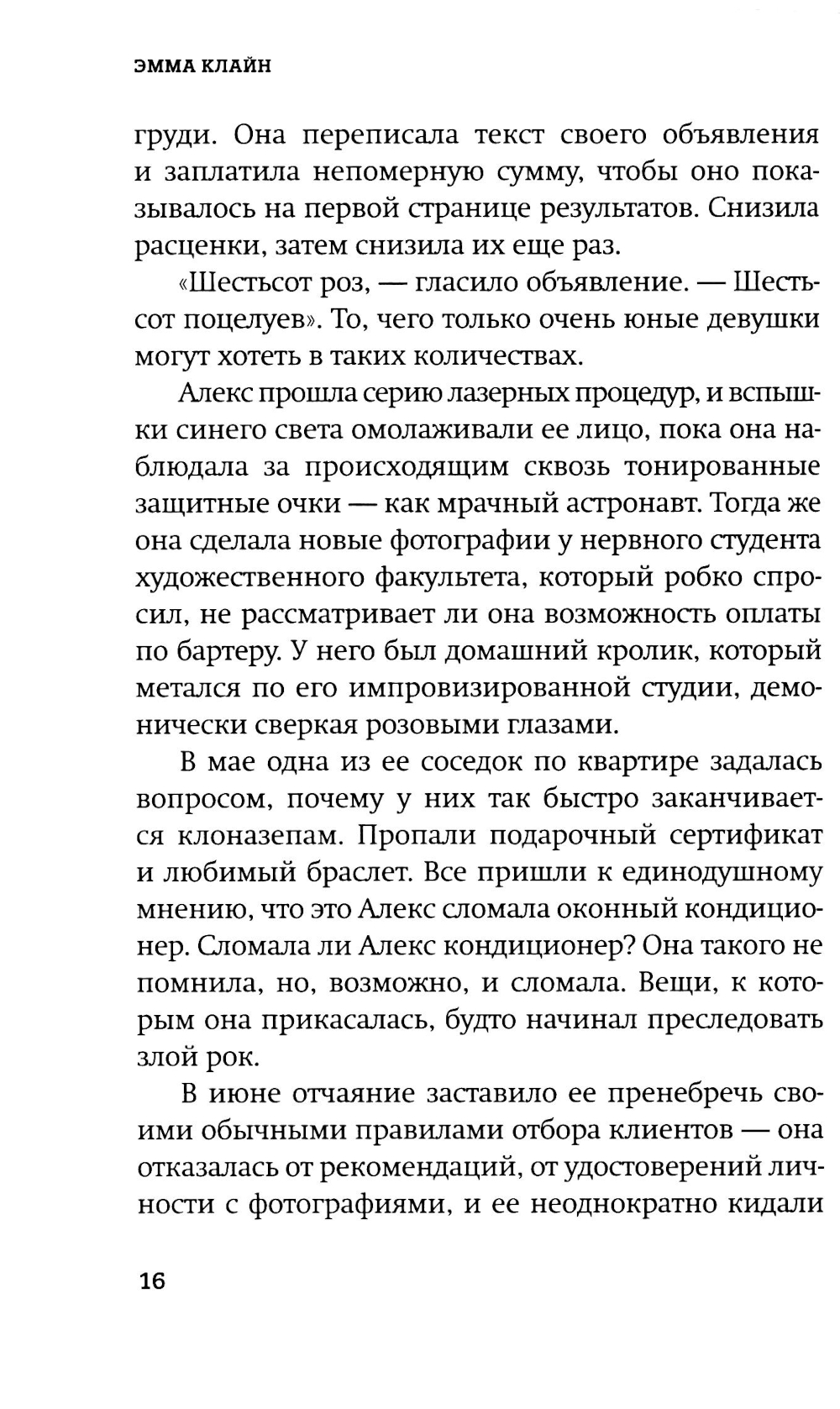 Жизнь Алекс катится под откос, когда она встречает Саймона - немолодого богатого мужчину, который думает, что она только что окончила университет, а не девушка по вызову. И теперь Алекс живет в его летнем доме, мечтая о будущем, в котором она будет чувствовать безопасность - как и все в этом избранном обществе. Но она не одна из них, и достаточно совершить лишь один неверный шаг - и мечта Алекс обращается в прах. В течение недели Алекс перемещается из одного дома в другой - повсюду гостья, повсюду чужая - с единственной эфемерной целью: уцепиться за эту безоблачную жизнь, задержаться в ней, превратиться из гостьи в хозяйку, хозяйку собственной судьбы. Алекс призраком дрейфует по пляжам Лонг-Айленда, проулкам между виллами, подъездным дорожкам, ведущим к роскошным особнякам, по раскаленным летним дюнам, и за ней тянется шлейф отчаяния и разрушения. Напряженный, динамичный, гипнотический роман об одиночестве и мечтах. Эмма Клайн, автор знаменитых «Девочек», сотворила камерный шедевр о желании быть с людьми и невозможности быть с ними. В ее книге словно соединились экзистенциальная тревожная таинственность фильмов Дэвида Линча и наивно-циничная искренность героев Сэлинджера.| Издательство | Фантом Пресс |