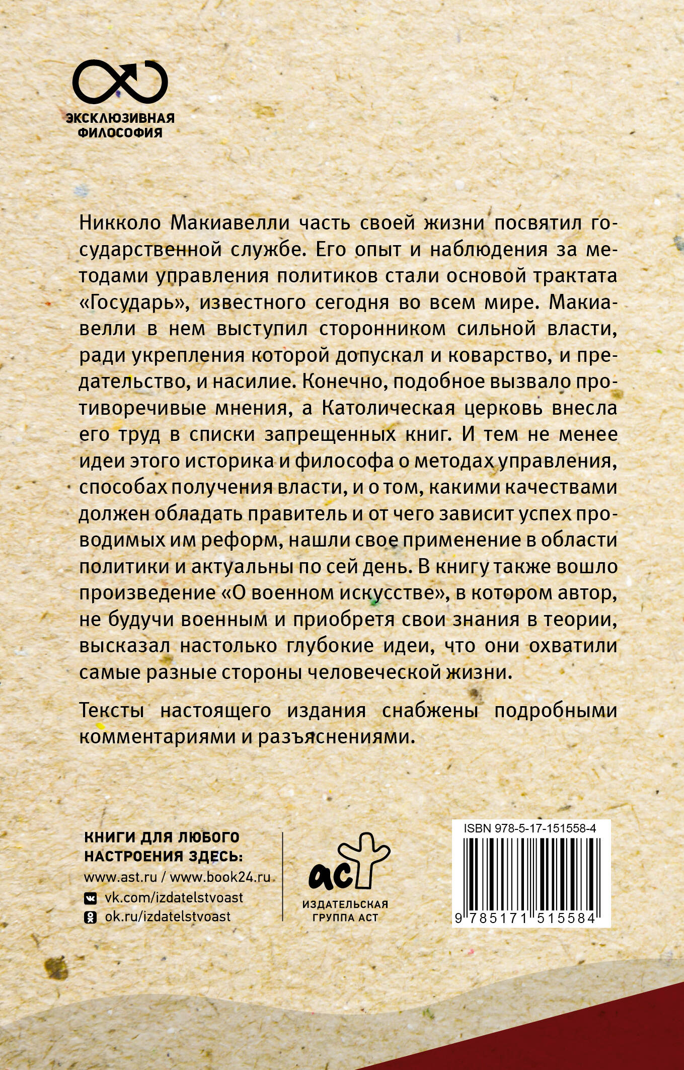 Никколо Макиавелли часть своей жизни посвятил государственной службе. Его опыт и наблюдения за методами управления политиков стали основой трактата "Государь", известного сегодня во всем мире. Макиавелли в нем выступил сторонником сильной власти, ради укрепления которой допускал и коварство, и предательство, и насилие. Конечно, подобное вызвало противоречивые мнения, а Католическая церковь внесла его труд в списки запрещенных книг. И тем не менее идеи этого историка и философа о методах управления, способах получения власти, и о том, какими качествами должен обладать правитель и от чего зависит успех проводимых им реформ, нашли свое применение в области политики и актуальны по сей день. В книгу также вошло произведение "О военном искусстве", в котором автор, не будучи военным и приобретя свои знания в теории, высказал настолько глубокие идеи, что они охватили самые разные стороны человеческой жизни. Тексты настоящего издания снабжены подробными комментариями и разъяснениями.| Издательство | ИЗДАТЕЛЬСТВО "АСТ" |